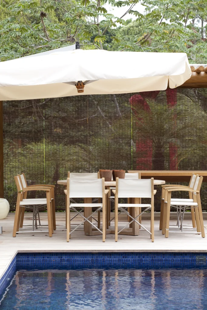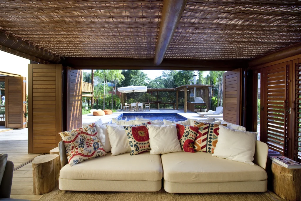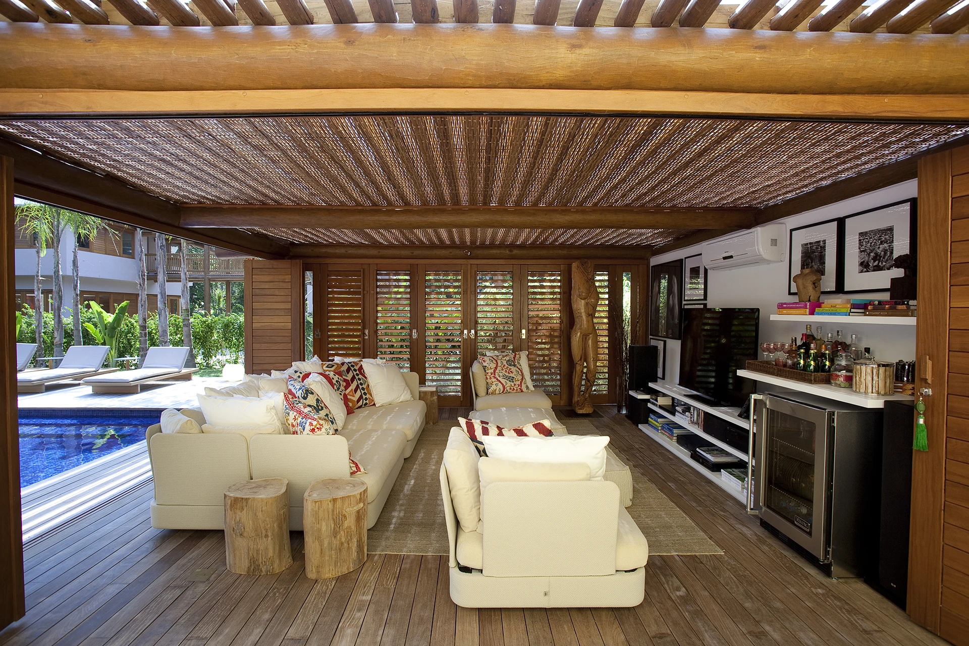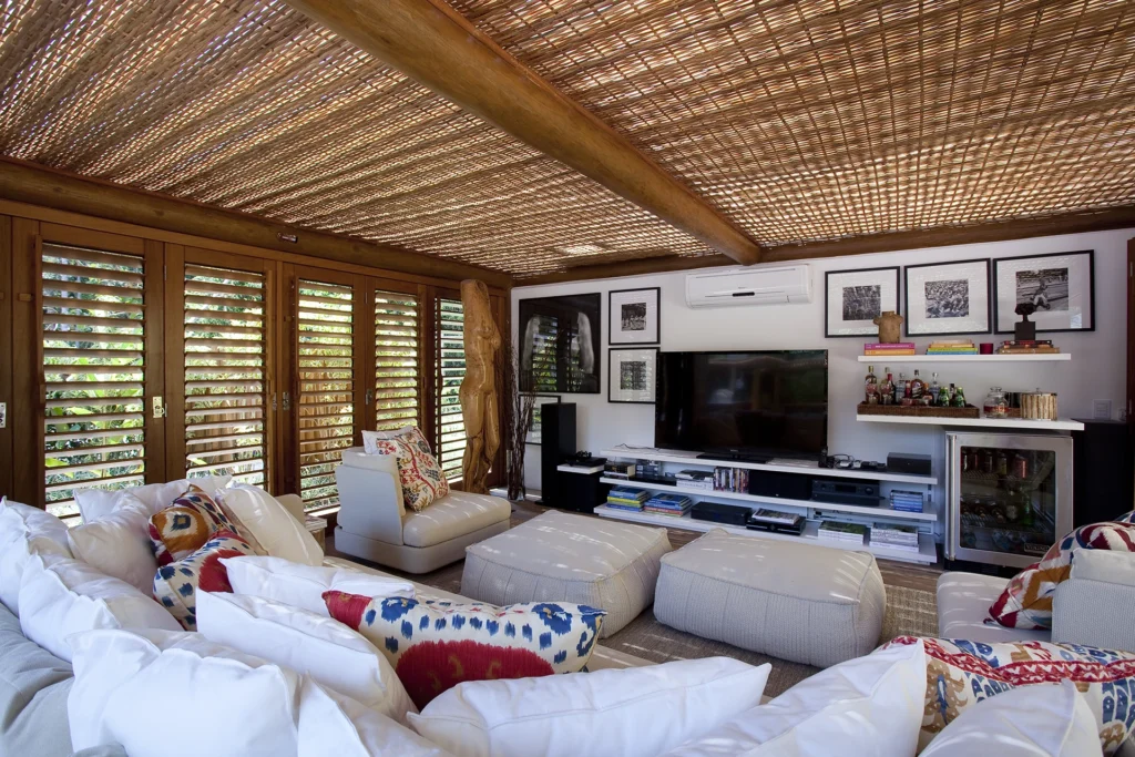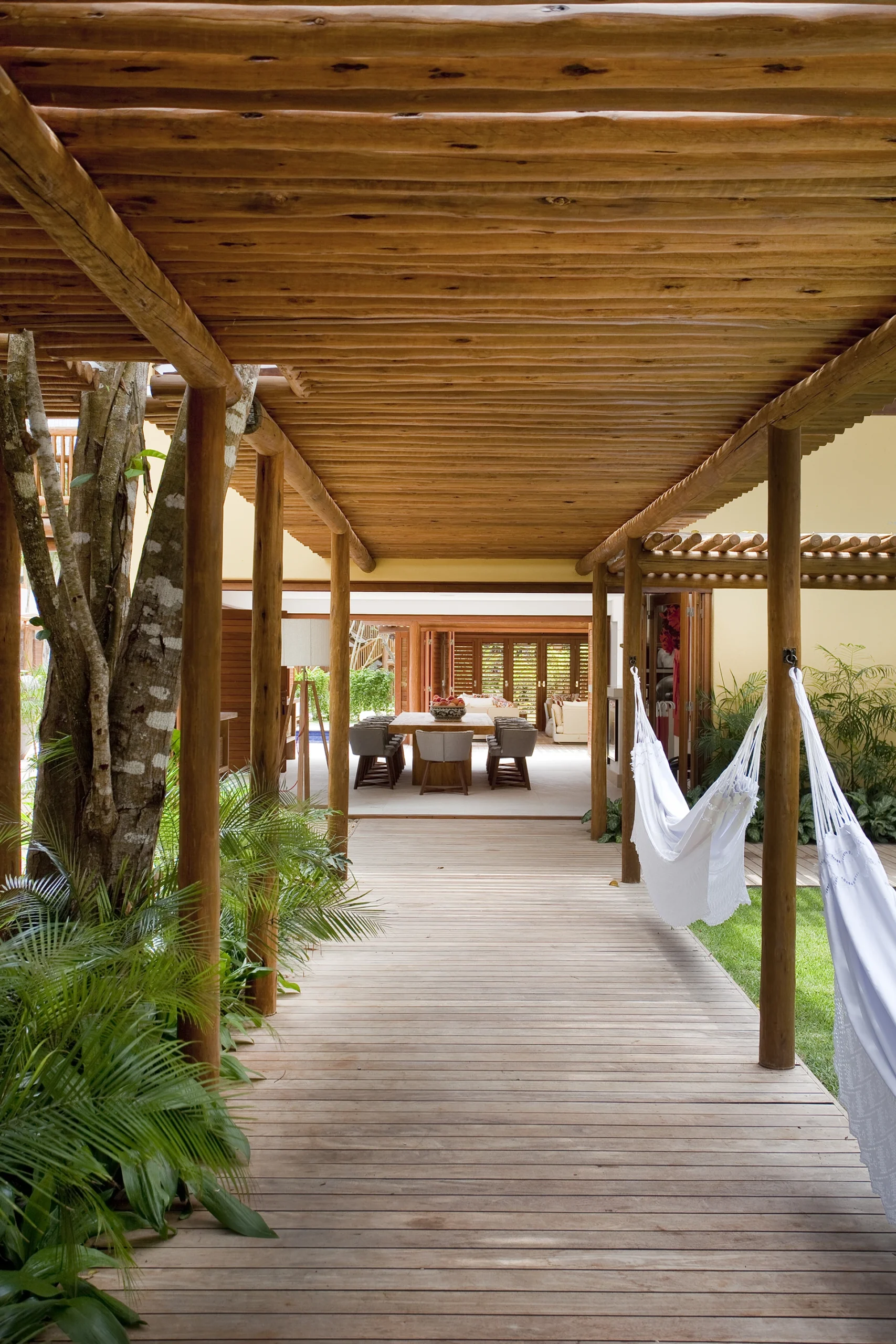 A madeira é o elemento condutor do projeto: presente em pilares, vigas, telhas, esquadrias com paletões, mobiliário e decks, formando um conjunto nobre, porém alinhado ao espírito despojado da casa litorânea. As amplas varandas são envolvidas por pérolas e o forro artesanal em palha de dendê filtra a luz natural, permitindo a passagem suave dos raios de sol.