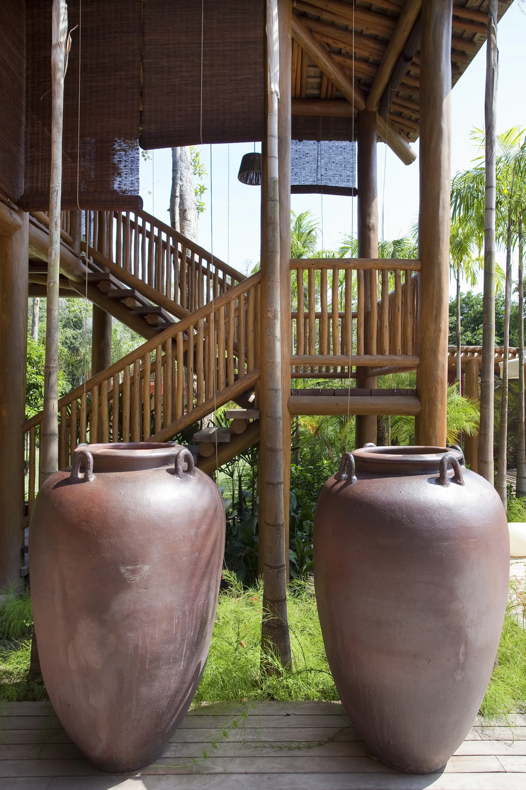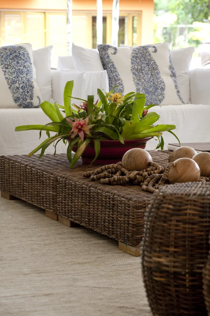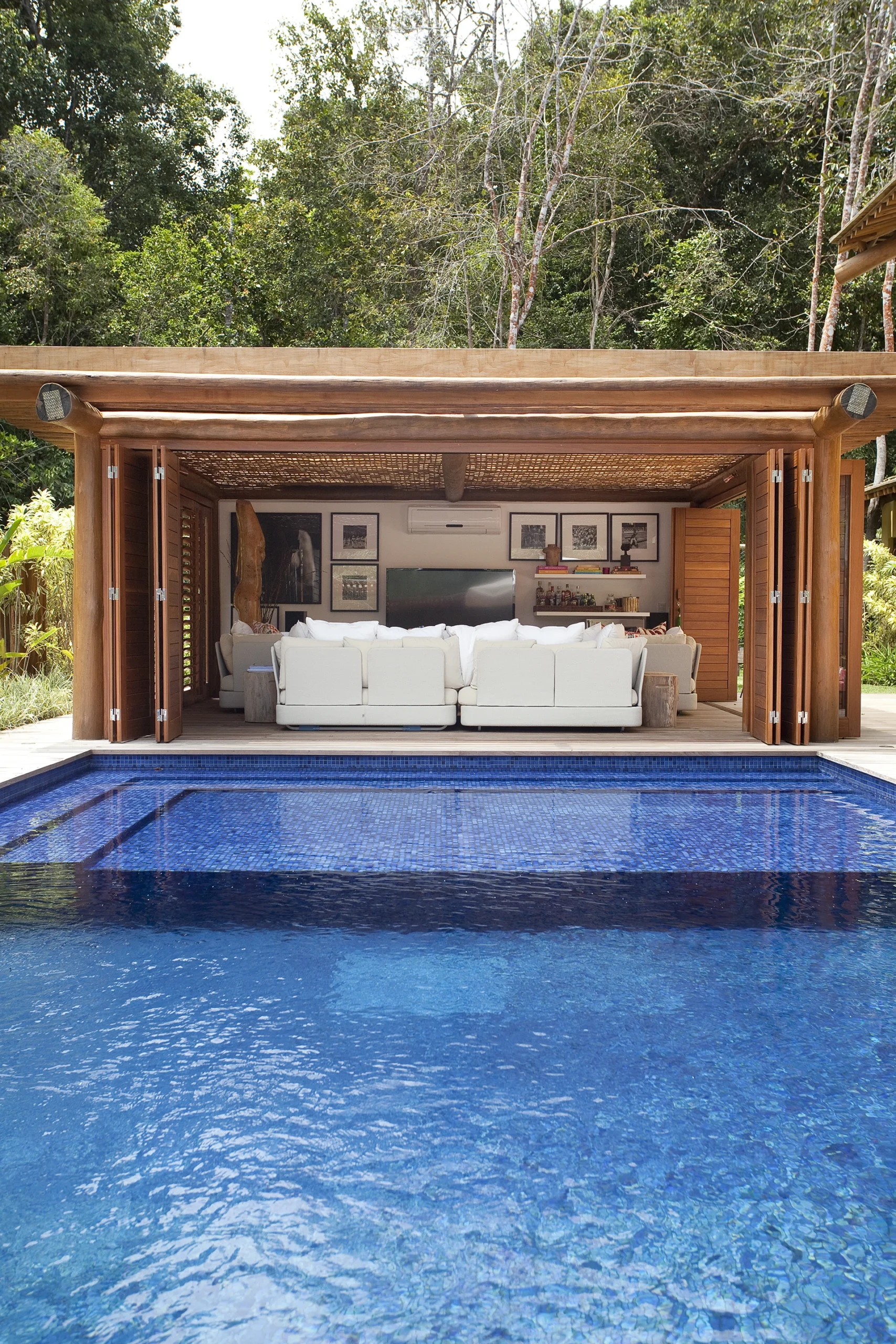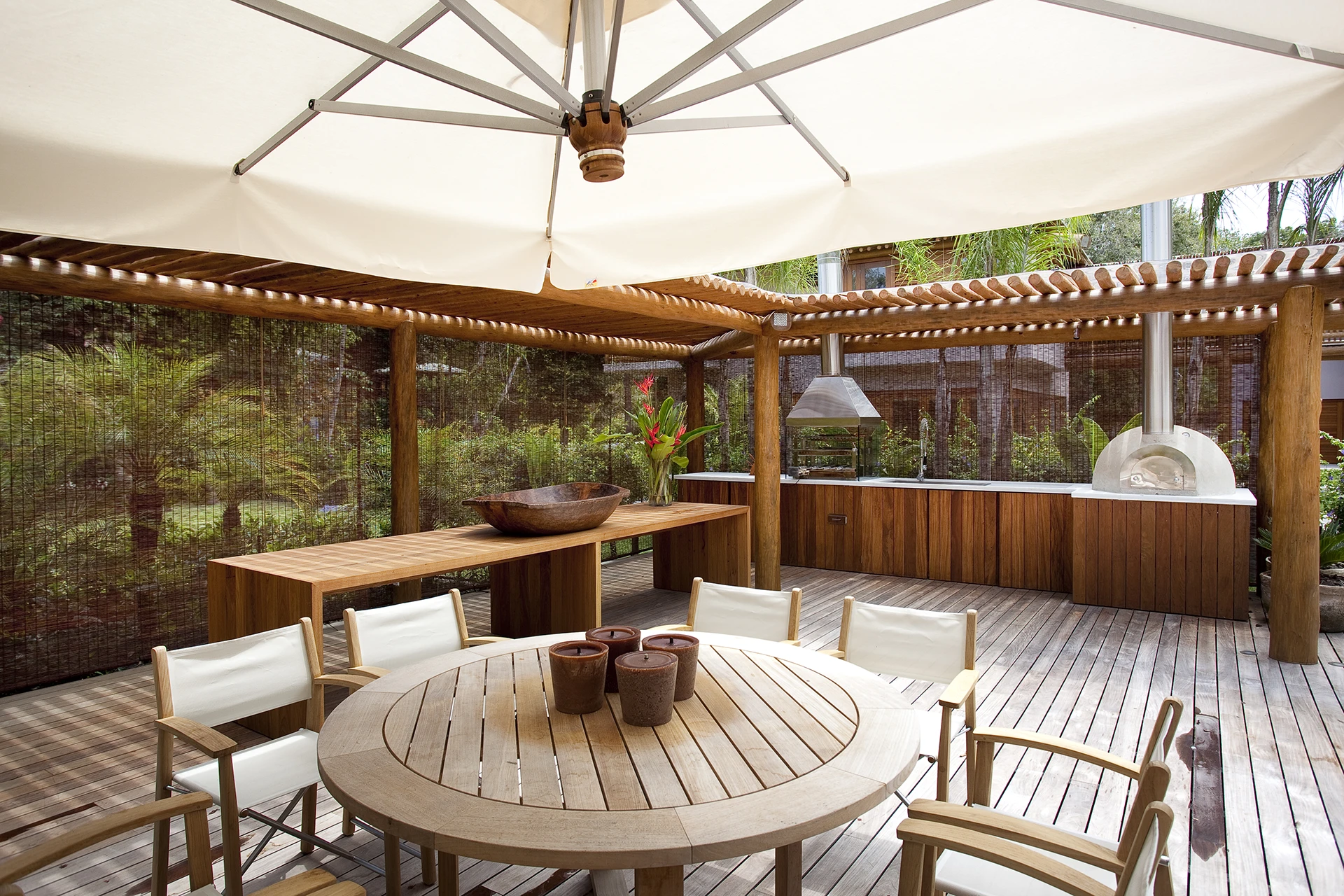 A madeira é o elemento condutor do projeto: presente em pilares, vigas, telhas, esquadrias com paletões, mobiliário e decks, formando um conjunto nobre, porém alinhado ao espírito despojado da casa litorânea. As amplas varandas são envolvidas por pérolas e o forro artesanal em palha de dendê filtra a luz natural, permitindo a passagem suave dos raios de sol.