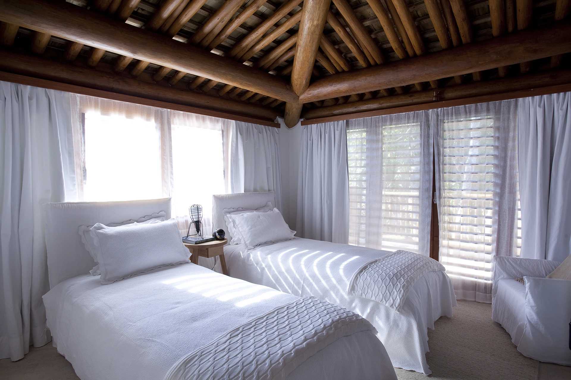 A implantação dos novos módulos segue uma premissa clara: permitir que a brisa morna do litoral baiano percorra todos os ambientes por meio da ventilação cruzada. Os quatro quartos originais tornaram-se insuficientes para uma família que gosta de receber com conforto, e daí surgiram dois bangalôs — um exclusivo para hóspedes, criando duas novas suítes, e outro dedicado à sala de massagem e sauna.