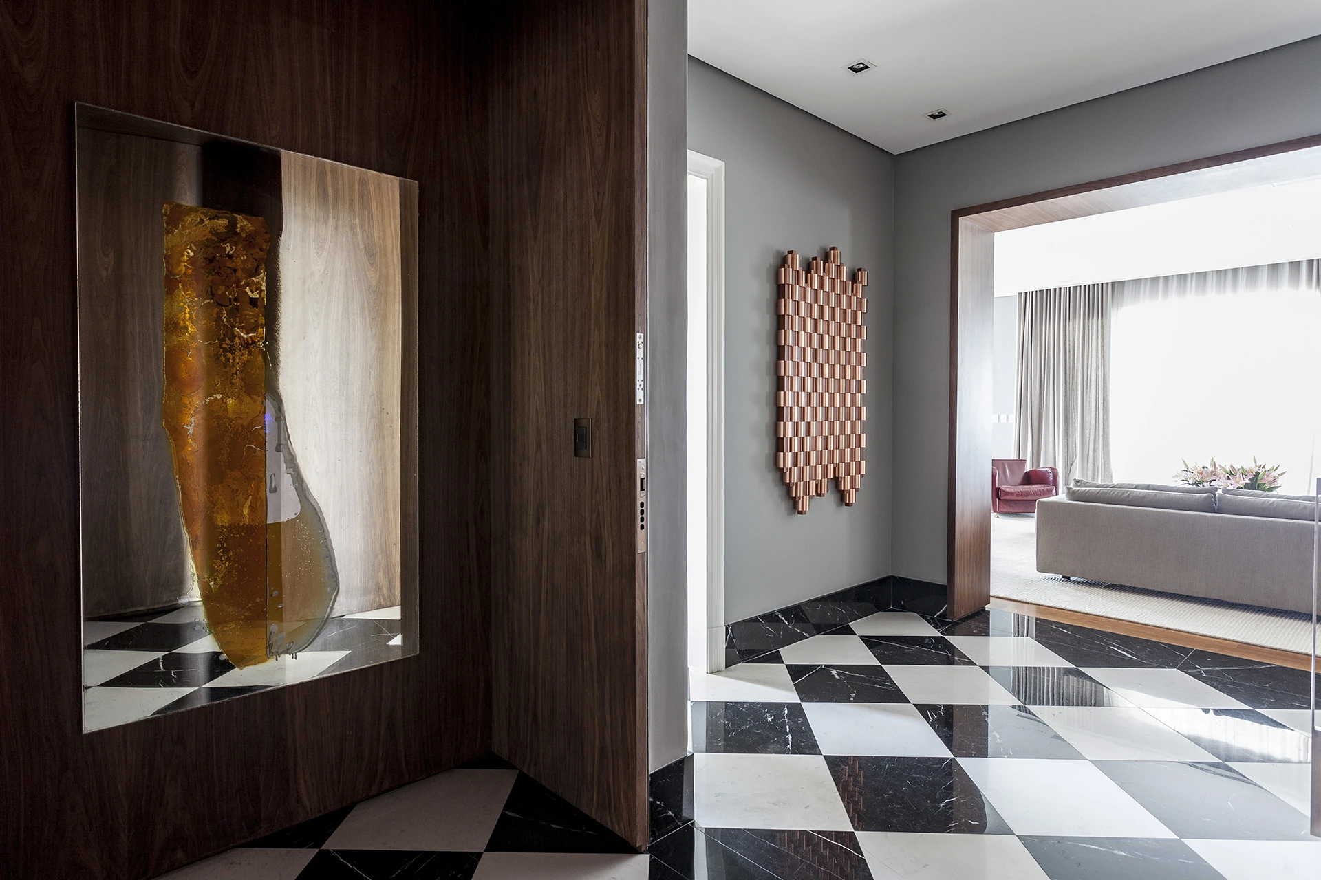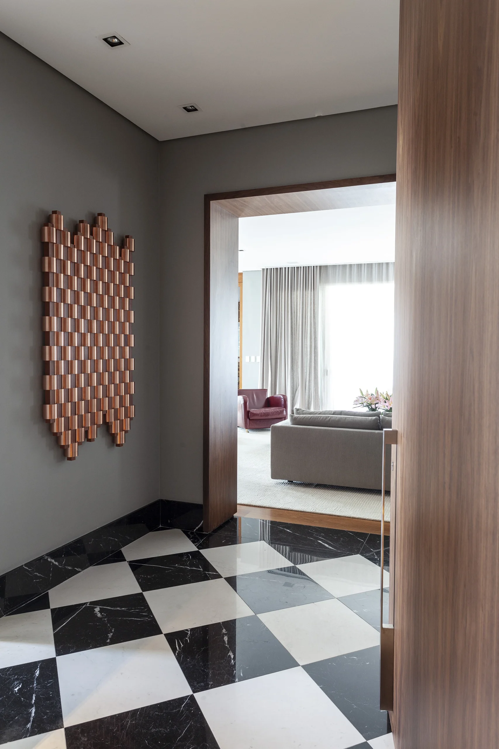 Recebendo os visitantes logo na chegada, uma escultura de Artur Lescher introduz a atmosfera cuidadosamente arquitetada deste apartamento paulistano, lar de um casal com duas filhas. O projeto, inicialmente pensado como uma intervenção pontual, evoluiu para uma reforma profunda que redefiniu a fluidez dos espaços e potencializou a amplitude dos 405 m².