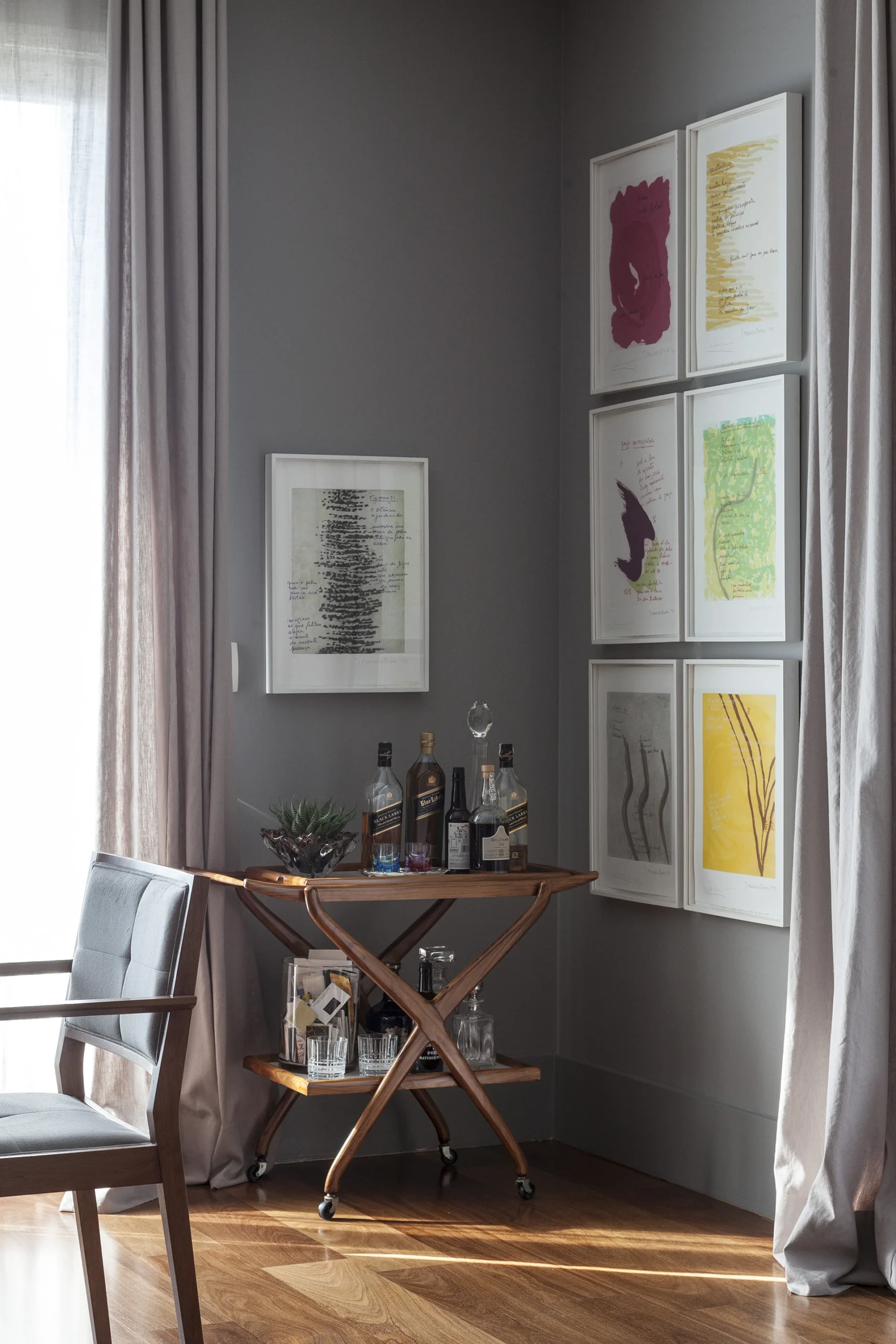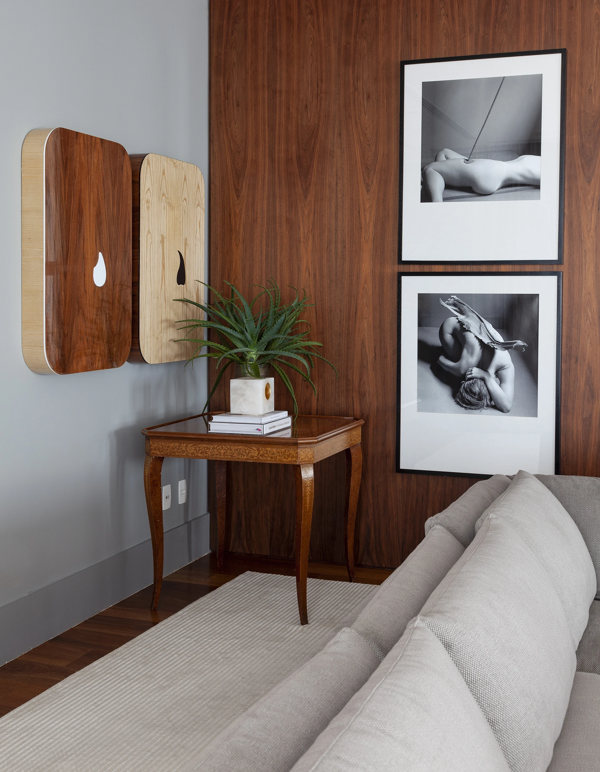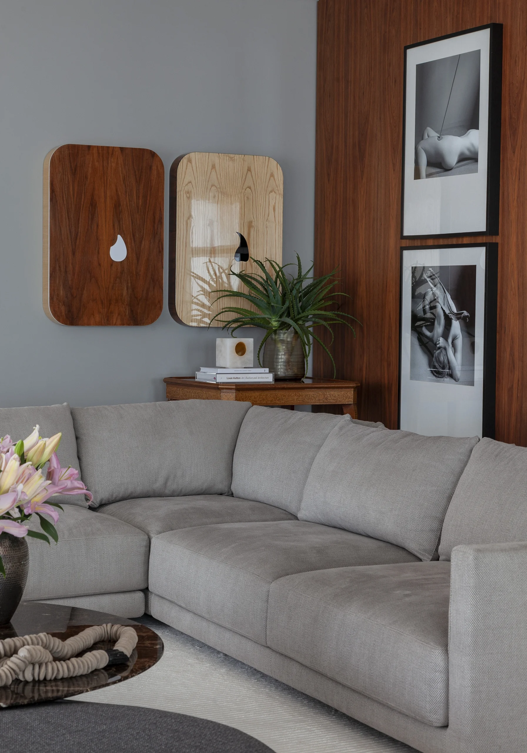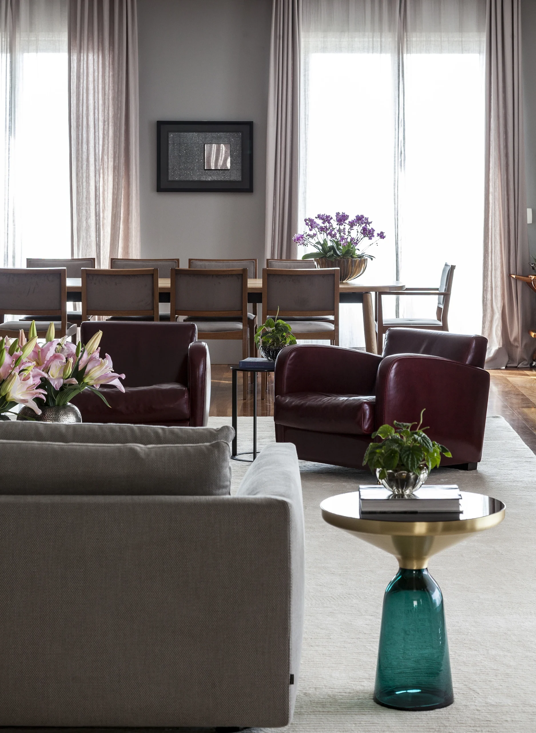 A paleta de cinzas aplicada em paredes, estofados e cadeiras estabelece a base tranquila do ambiente. A essa neutralidade somam-se superfícies de madeira — presentes no assoalho, nos painéis e na mesa de jantar — que aquecem o conjunto e criam um equilíbrio tátil e visual. Detalhes em latão reforçam o caráter acolhedor e contemporâneo, aparecendo nos pés das poltronas em couro vinho e na mesinha lateral Bell, de Sebastian Herkner, apoiada sobre delicada base de vidro turquesa.