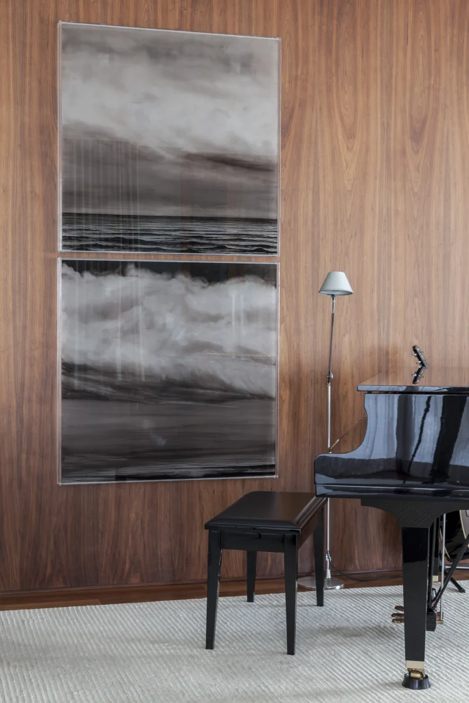 A estratégia espacial envolveu integrar o home theater e o jantar ao estar, criando uma área social contínua, generosa e permeada por luz. Nesse grande salão, onde um piano e um violão sinalizam o lugar da música na rotina da família, David Bastos imprimiu uma composição marcada pela serenidade, pelo conforto e pela sofisticação discreta.