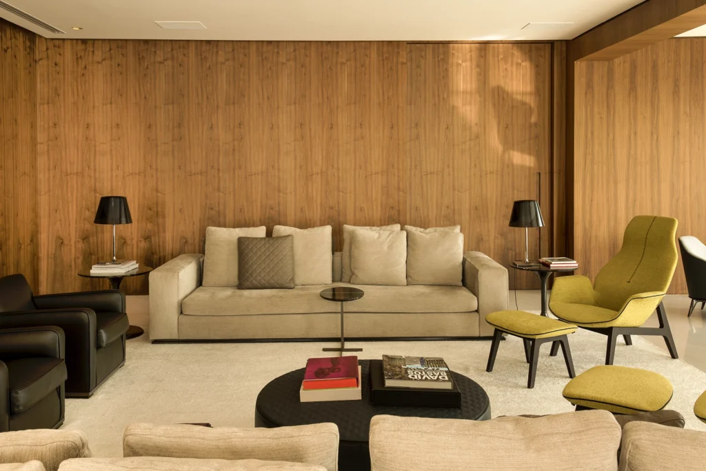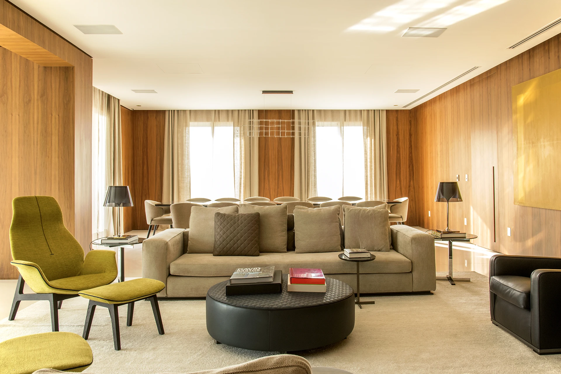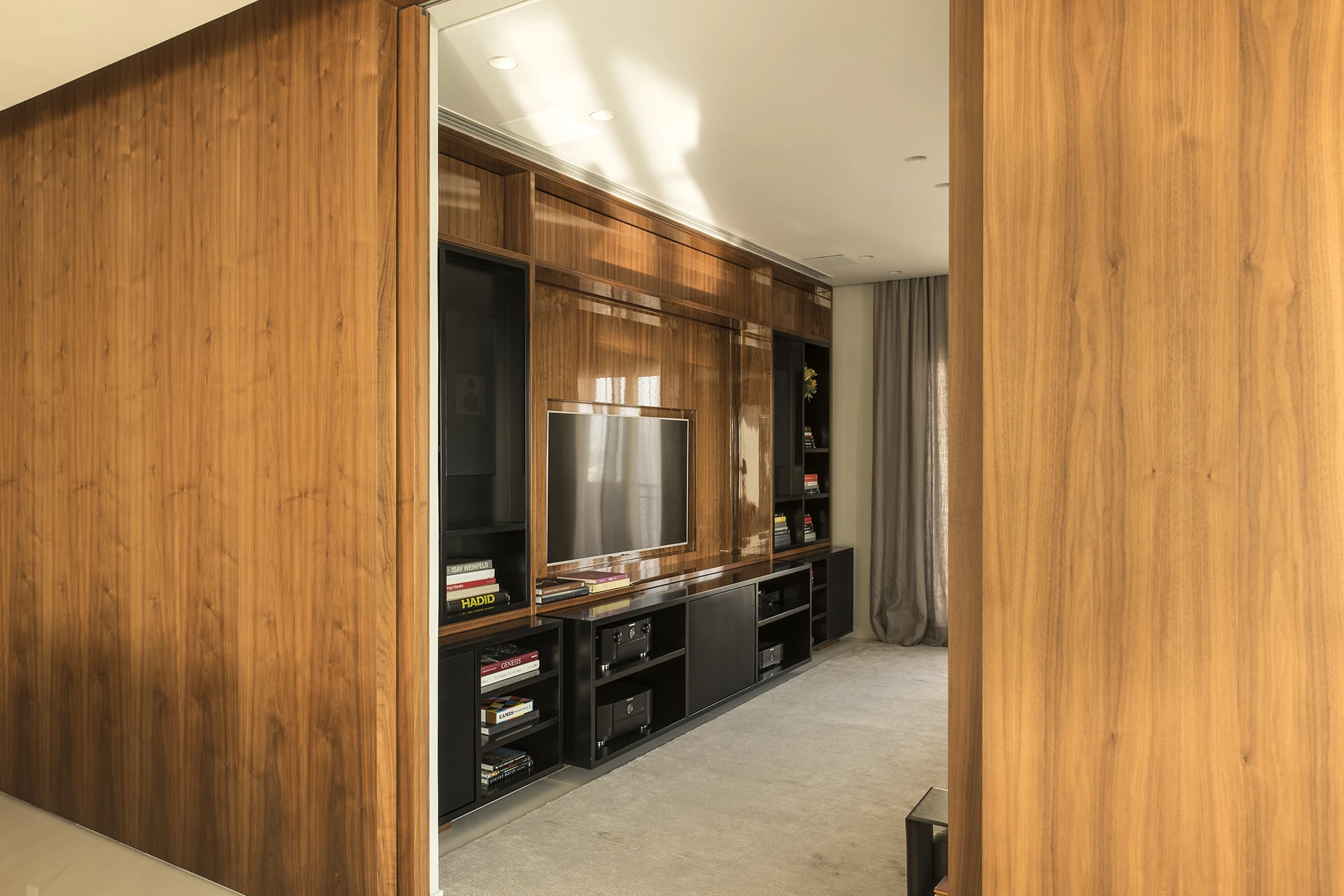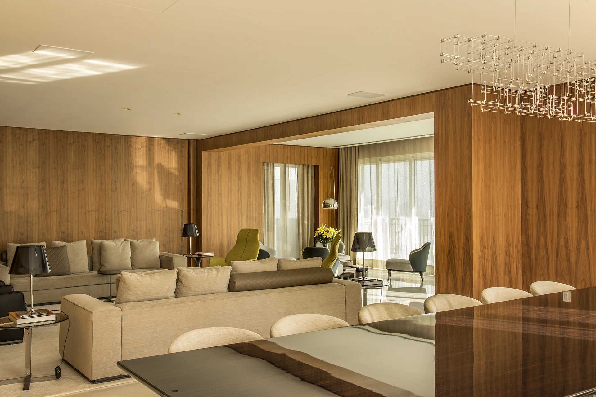 Na área social, painéis contínuos de madeira nogueira revestem paredes e marcam ritmos visuais que conduzem o olhar de forma discreta e sofisticada. O piso em mármore amplia a luminosidade natural e reforça o caráter atemporal do projeto. A integração dos ambientes — sala, jantar e estar — foi tratada com cuidado para manter a amplitude, mas garantir a intimidade desejada para o dia a dia.