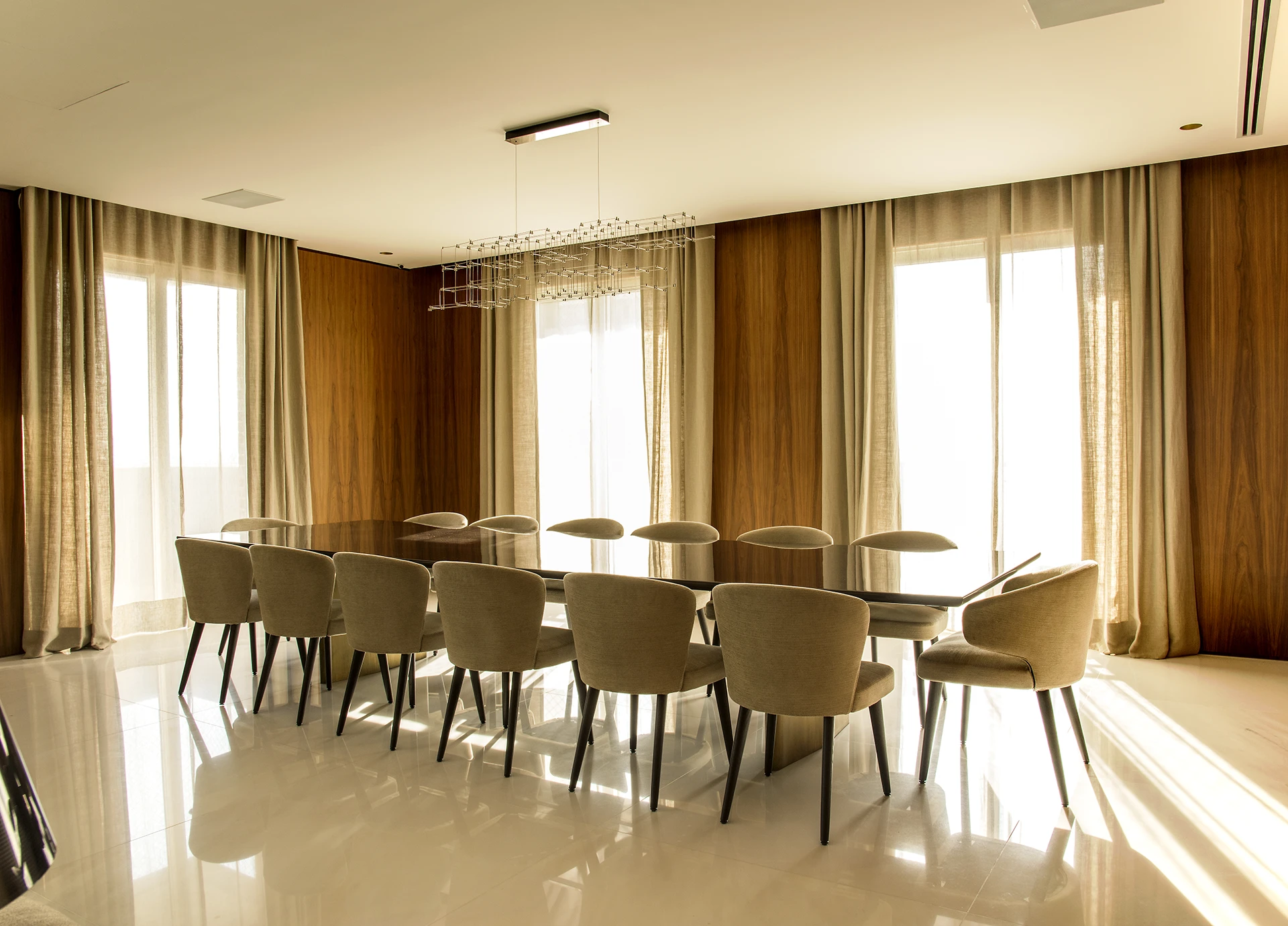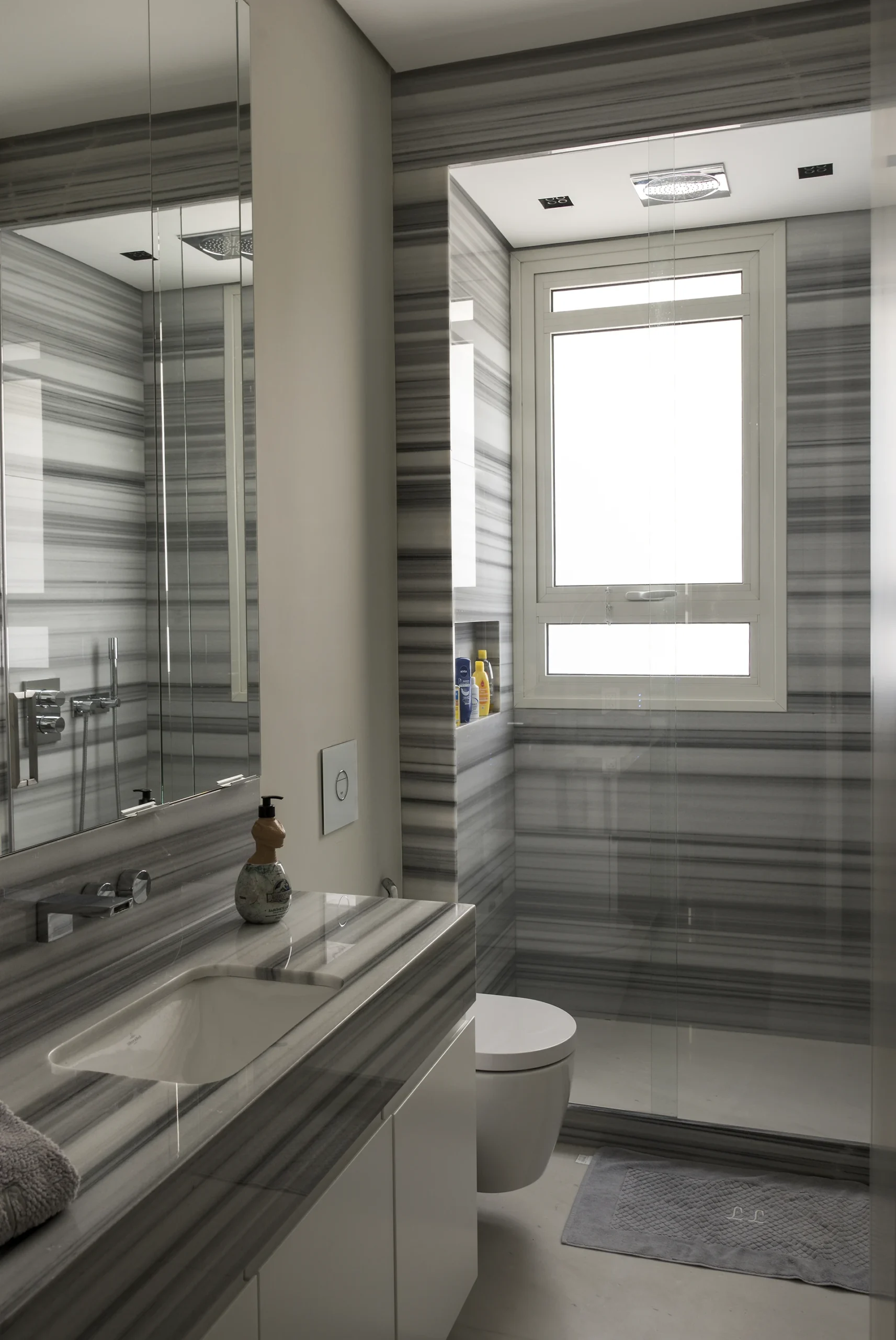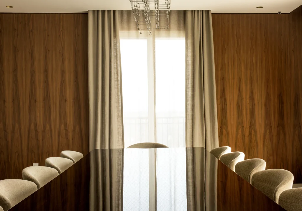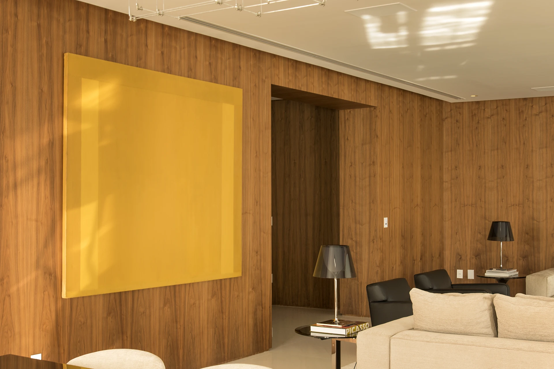 Na área social, painéis contínuos de madeira nogueira revestem paredes e marcam ritmos visuais que conduzem o olhar de forma discreta e sofisticada. O piso em mármore amplia a luminosidade natural e reforça o caráter atemporal do projeto. A integração dos ambientes — sala, jantar e estar — foi tratada com cuidado para manter a amplitude, mas garantir a intimidade desejada para o dia a dia.