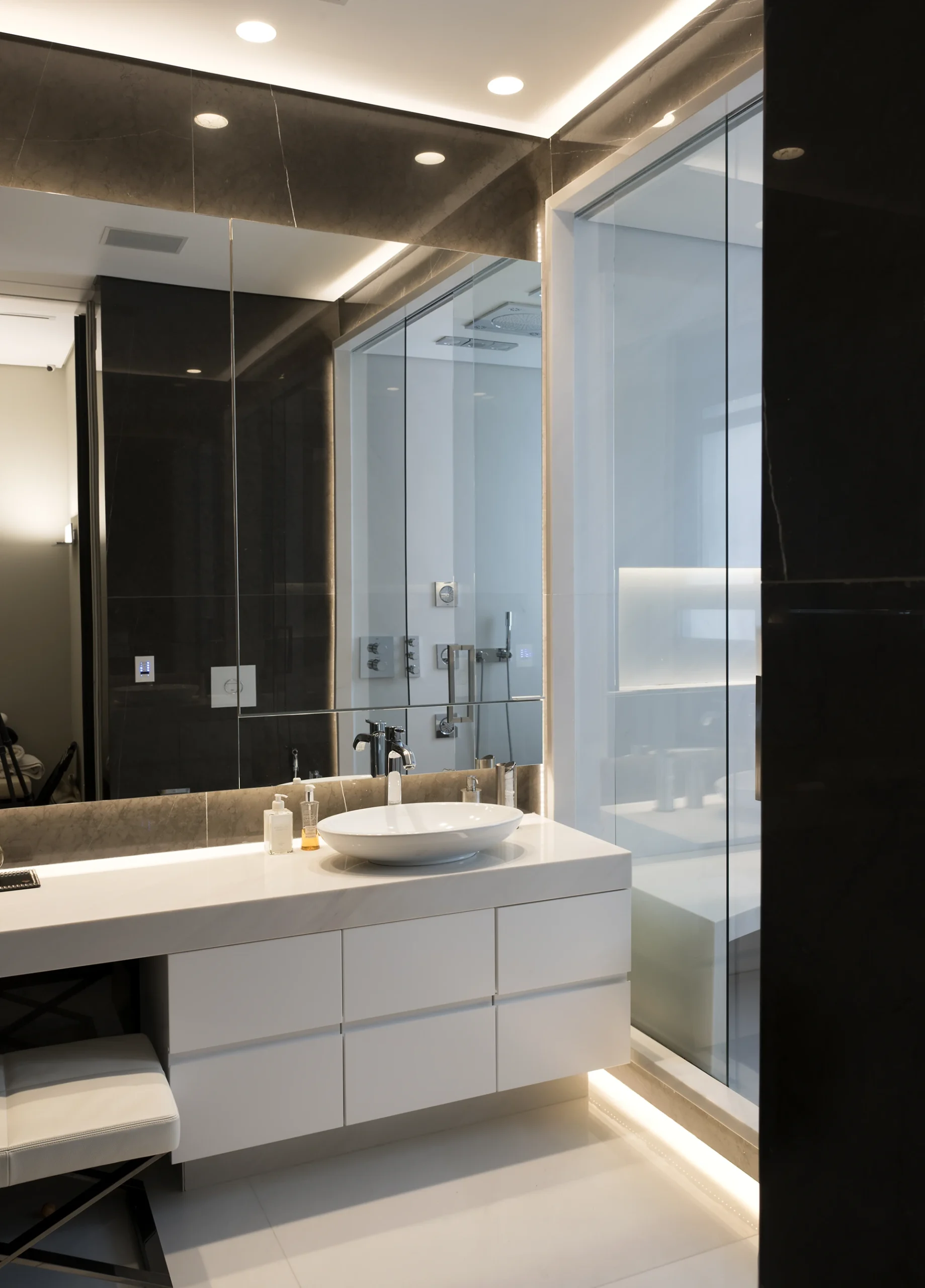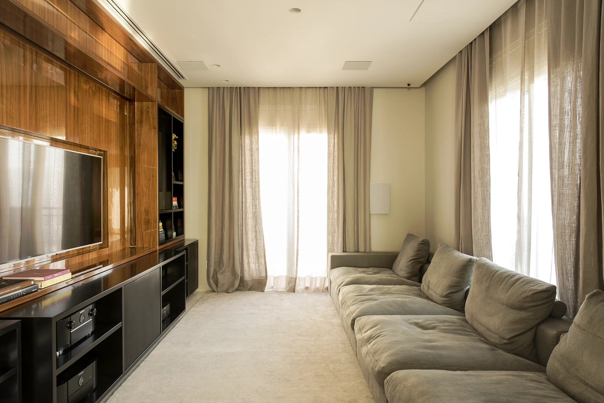 O home theater foi uma prioridade do cliente e recebeu um sistema de automação de última geração, com acústica otimizada, iluminação controlada e tecnologia embarcada para áudio e vídeo. Esse ambiente tornou-se o núcleo de convivência da família, combinando conforto, performance técnica e estética refinada.