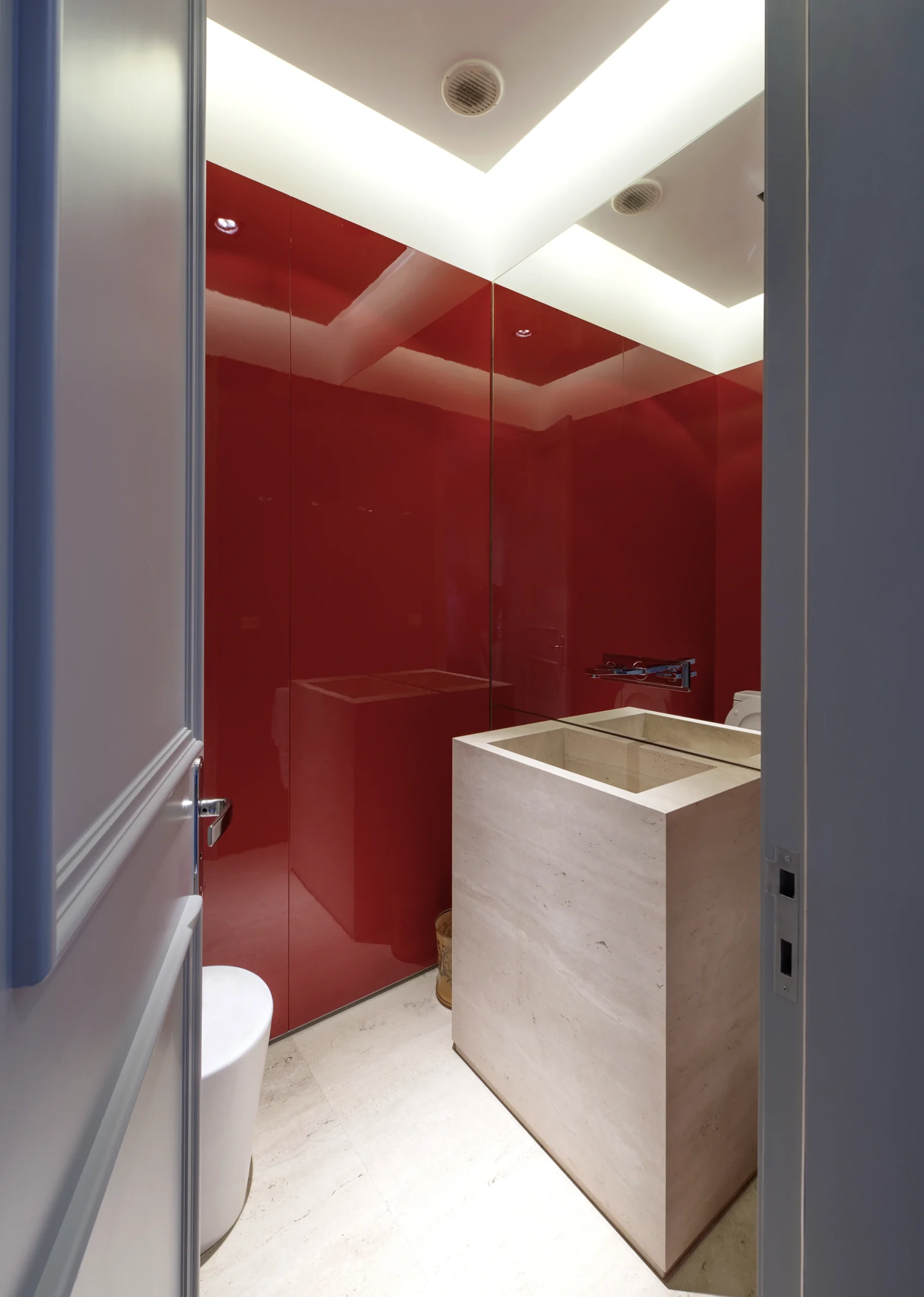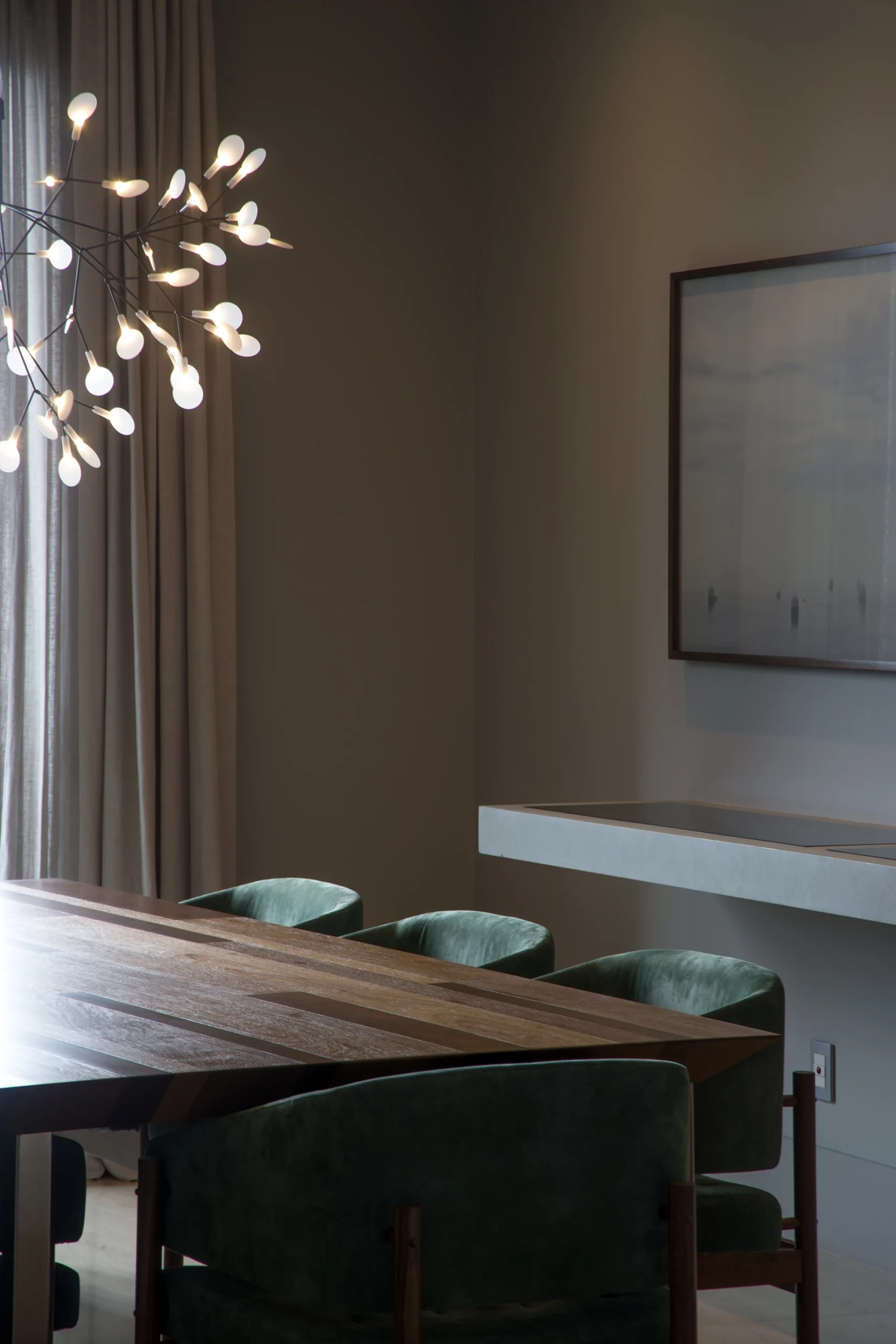A paleta neutra abre espaço para pontos de cor estrategicamente inseridos: o vermelho vibrante da divisória de vidro no lavabo, que transforma o ambiente em uma pequena instalação, e o verde das cadeiras de camurça que abraçam a mesa de jantar em madeira maciça. Elementos que quebram a monotonia e imprimem personalidade sem interferir na serenidade geral do projeto.