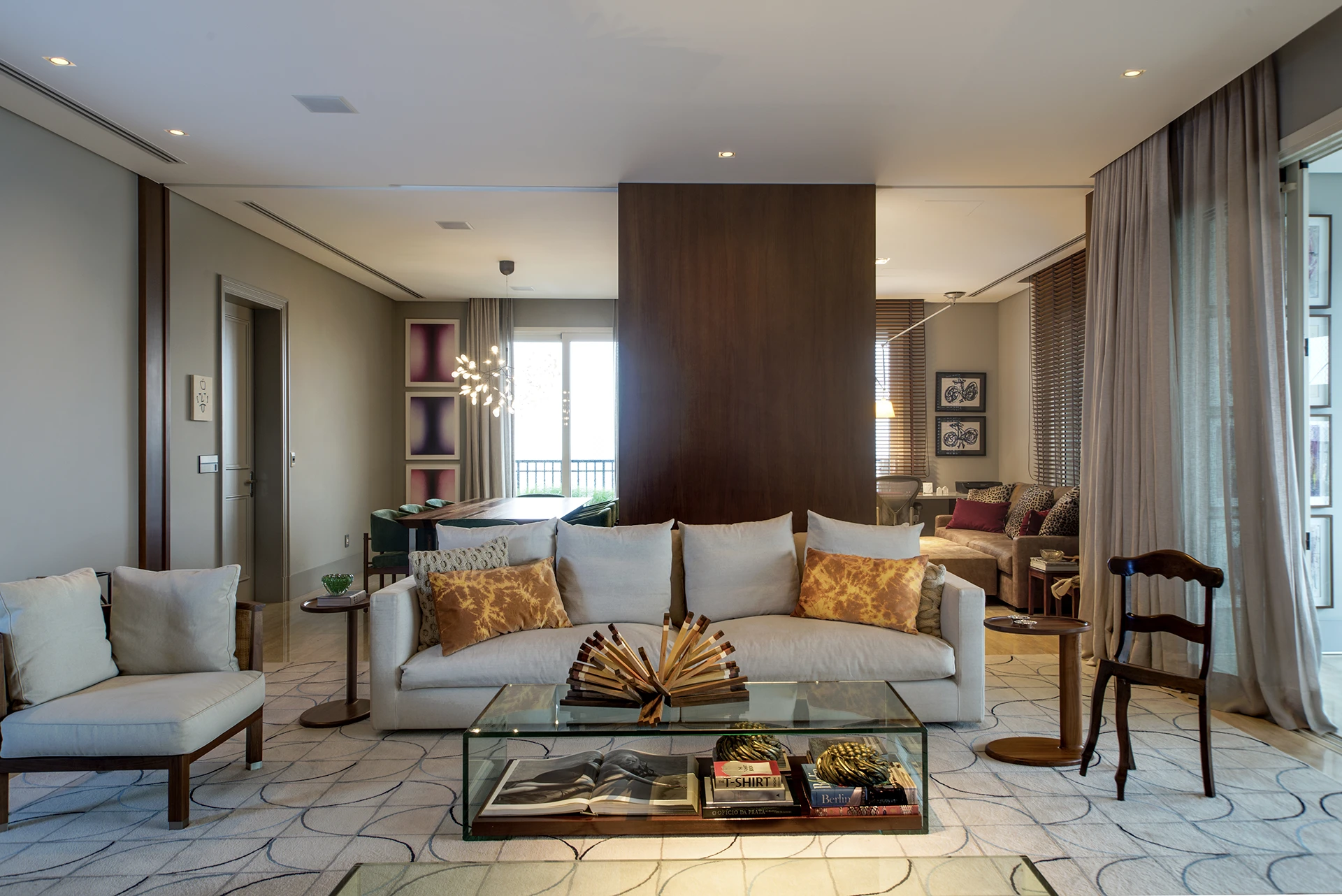 As paredes em tom de cinza criam uma base sofisticada que conduz o olhar, enquanto as cortinas de fibras naturais suavizam a luz e realçam os vãos envidraçados. No piso, o limestone em nuance creme reforça a sensação de amplitude e continuidade.