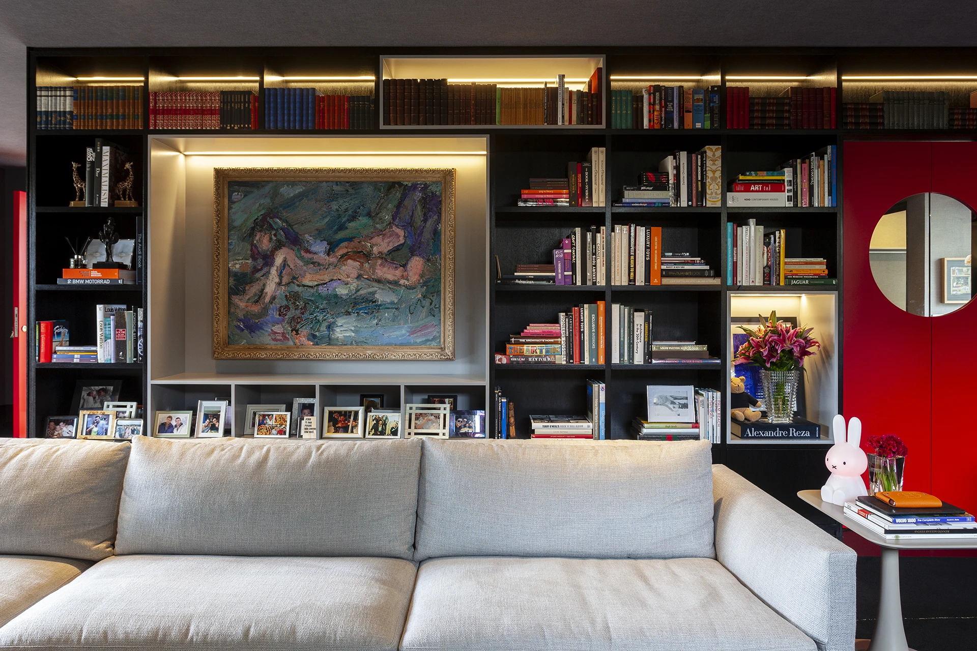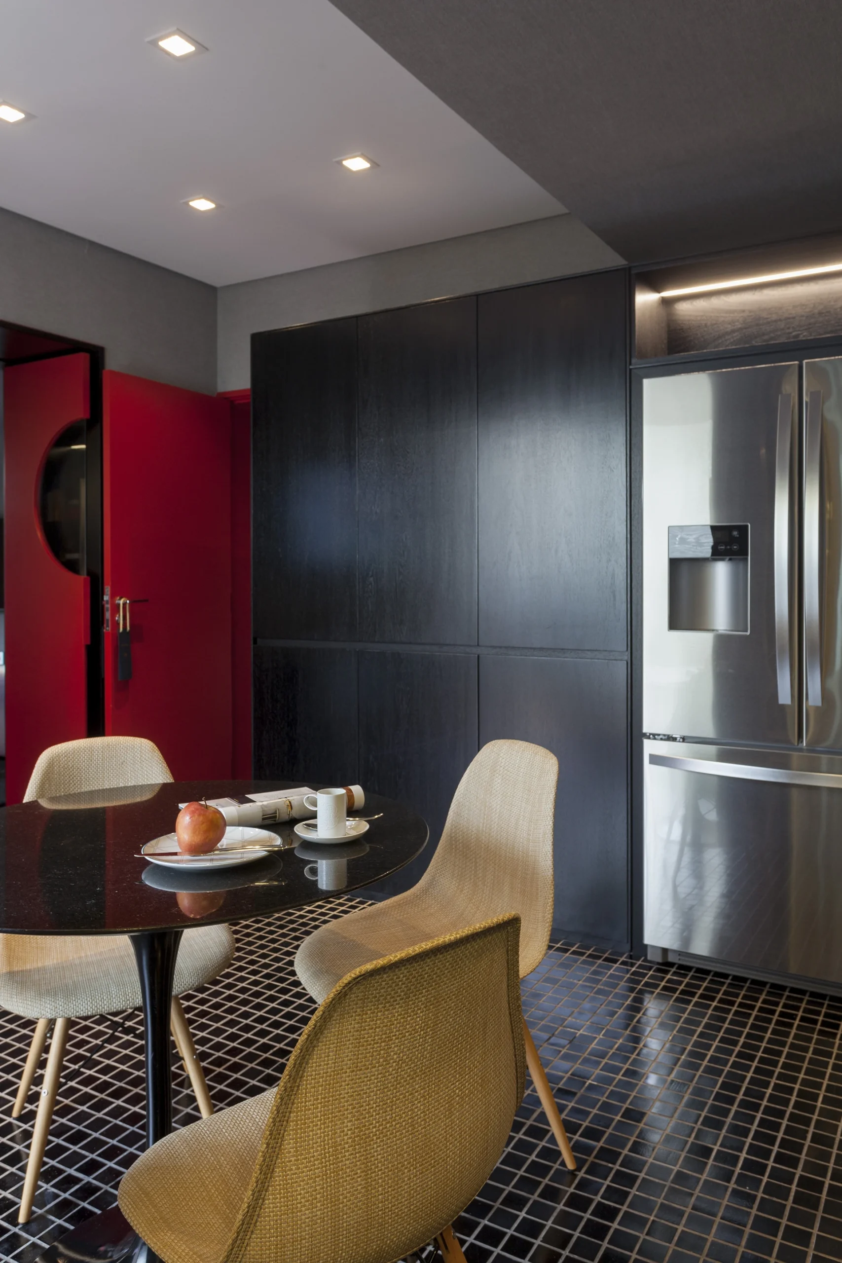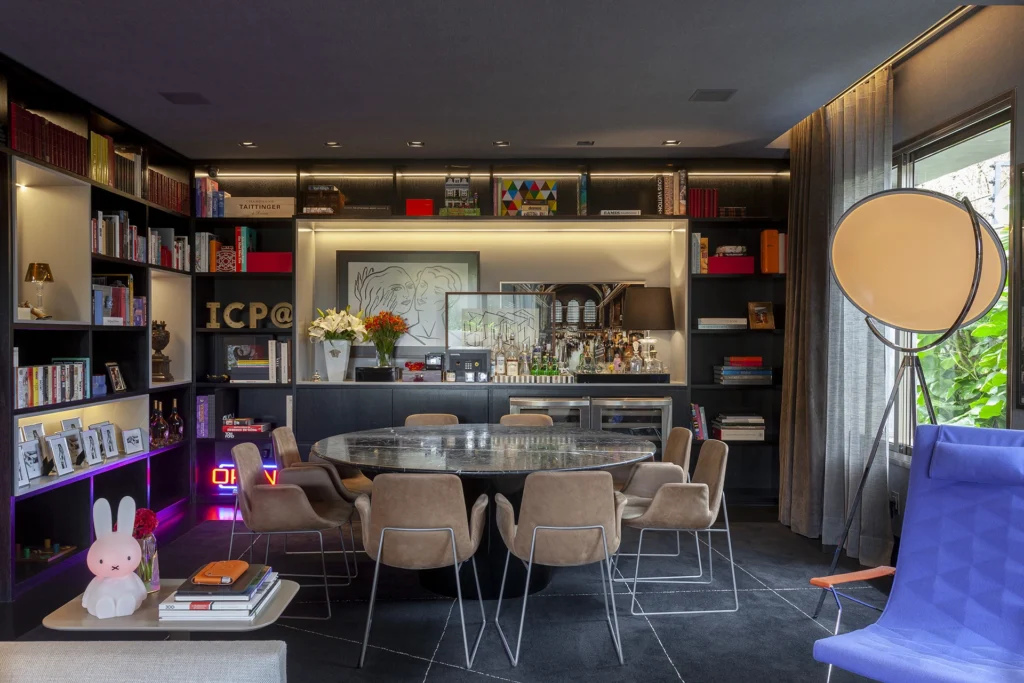 Uma reforma de interiores e decoração marcada por personalidade. O vermelho, em contraste direto com o verde do jardim e do entorno arborizado do Jardim Europa, deixa de ser detalhe e se espalha pelo pavimento térreo, definindo a identidade da casa. Sem alterar significativamente a planta, o projeto assinado por David Bastos valoriza as áreas sociais, pensadas para receber, e cria uma suíte de máximo conforto. Tons escuros dominam pisos, paredes e marcenaria, equilibrados por cinzas, beges e poucos detalhes em branco. Objetos de acento retrô e escolhas pessoais do morador trazem um toque kitsch e afetivo ao conjunto. Mobiliário assinado pela Casual Móveis.