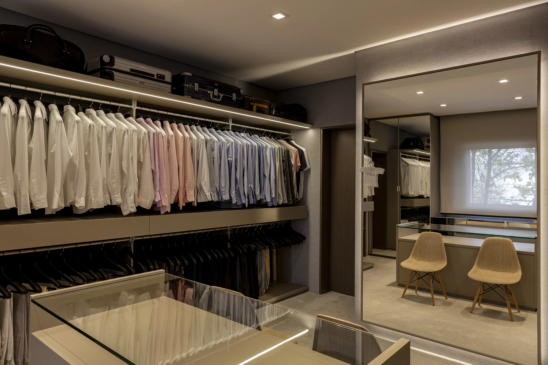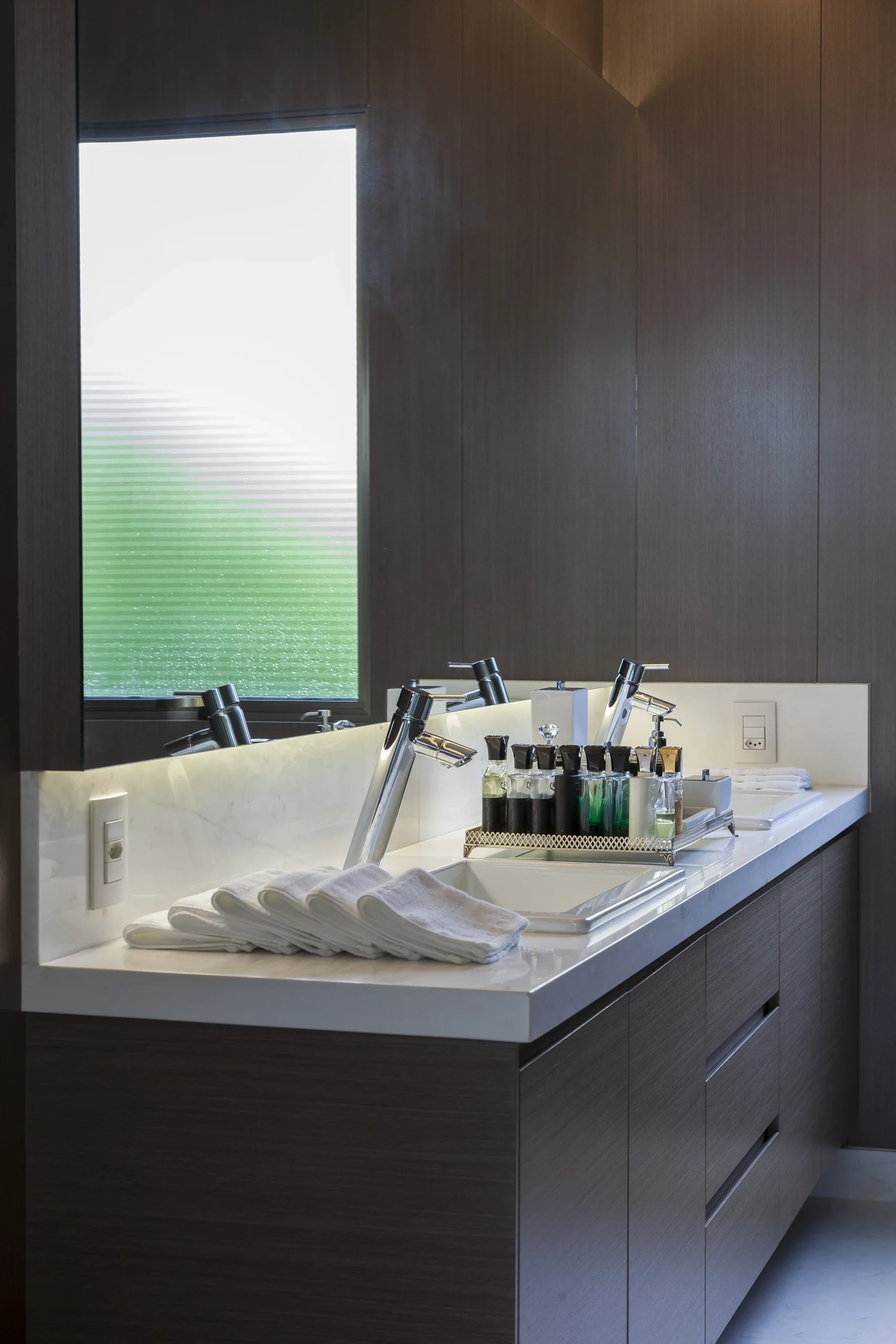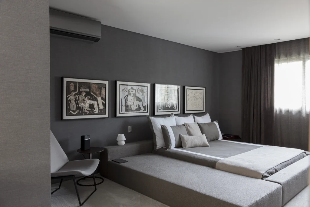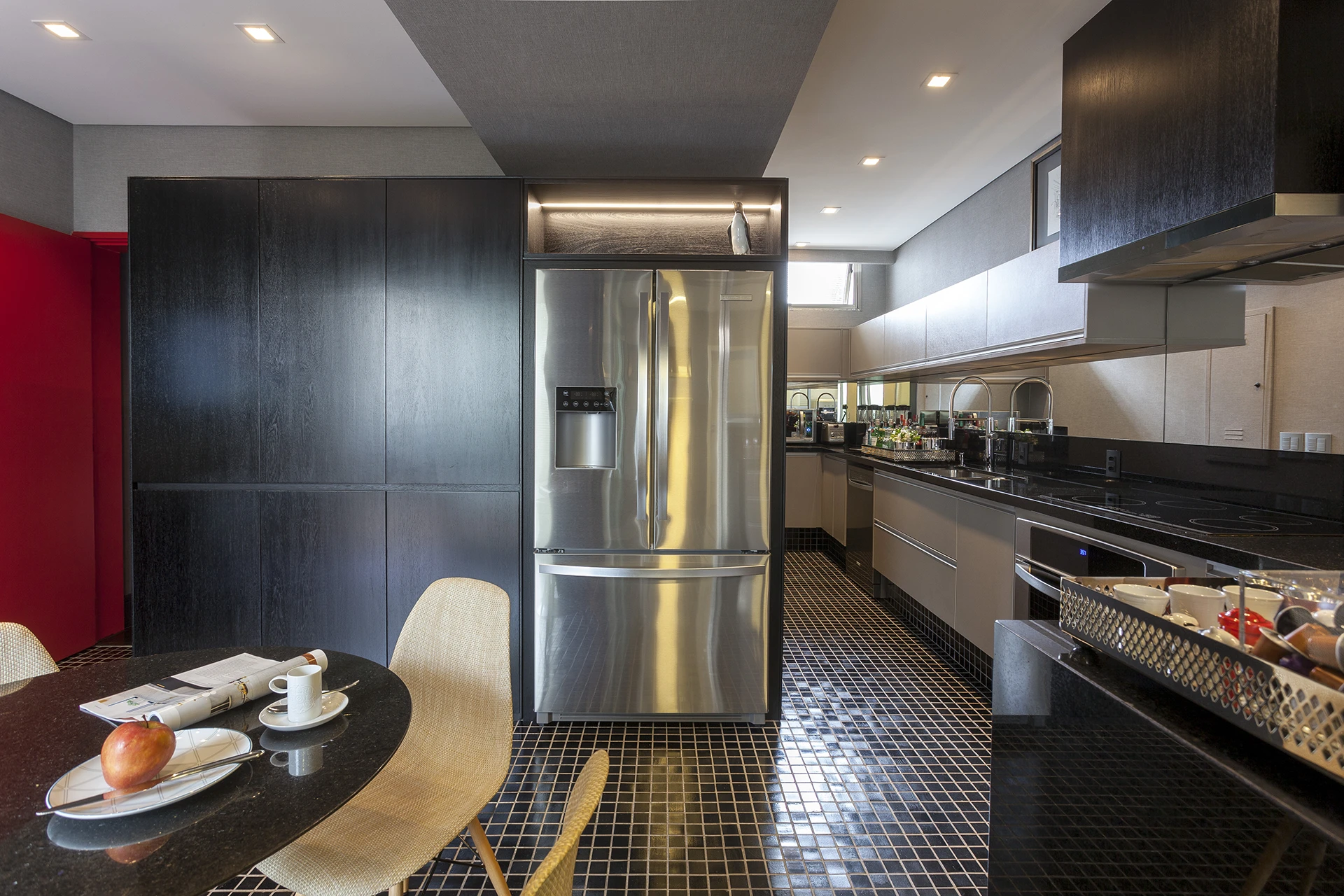 Uma reforma de interiores e decoração marcada por personalidade. O vermelho, em contraste direto com o verde do jardim e do entorno arborizado do Jardim Europa, deixa de ser detalhe e se espalha pelo pavimento térreo, definindo a identidade da casa. Sem alterar significativamente a planta, o projeto assinado por David Bastos valoriza as áreas sociais, pensadas para receber, e cria uma suíte de máximo conforto. Tons escuros dominam pisos, paredes e marcenaria, equilibrados por cinzas, beges e poucos detalhes em branco. Objetos de acento retrô e escolhas pessoais do morador trazem um toque kitsch e afetivo ao conjunto. Mobiliário assinado pela Casual Móveis.