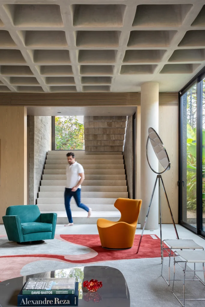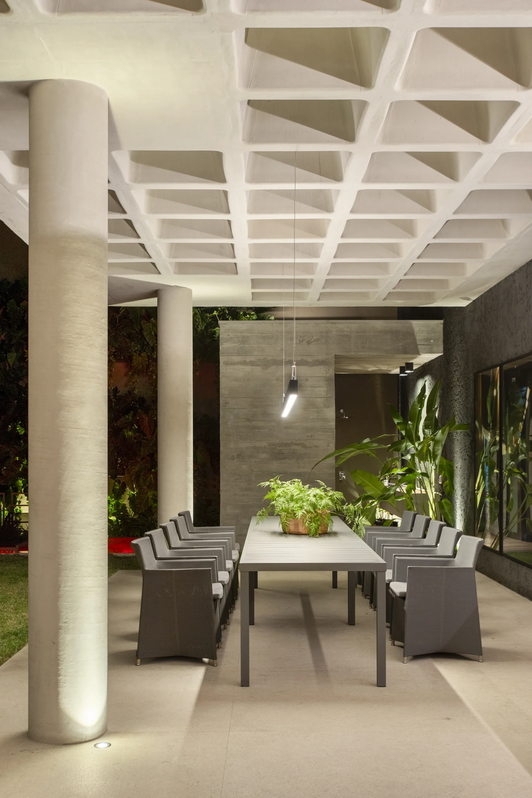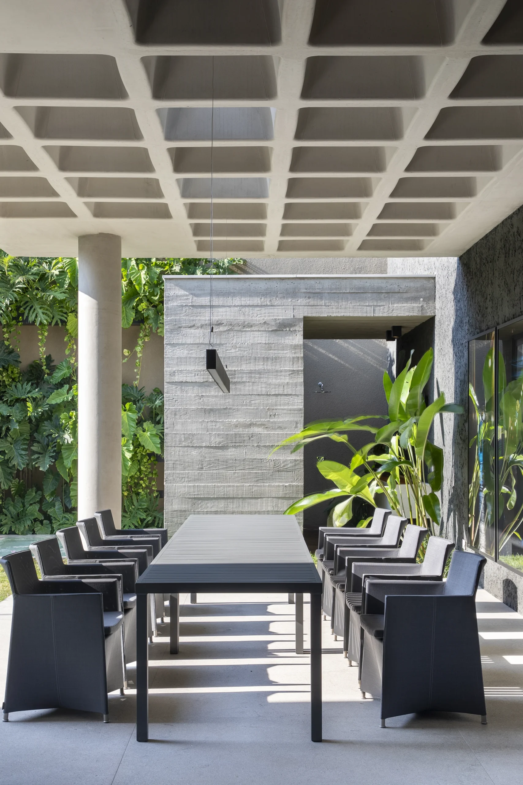 O sistema construtivo em concreto armado, com lajes nervuradas aparentes, define o caráter brutalista da residência. No piso térreo, praticamente sem paredes, os ambientes se integram em um grande espaço contínuo: estar, jantar, cozinha, gourmet e área externa se articulam de forma fluida, sempre voltados para os jardins e para a piscina. Os grandes vãos com esquadrias piso-teto em alumínio preto e vidro transparente reforçam a sensação de continuidade espacial, fazendo com que os limites entre dentro e fora se tornem quase imperceptíveis.