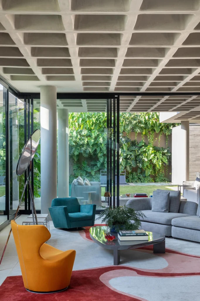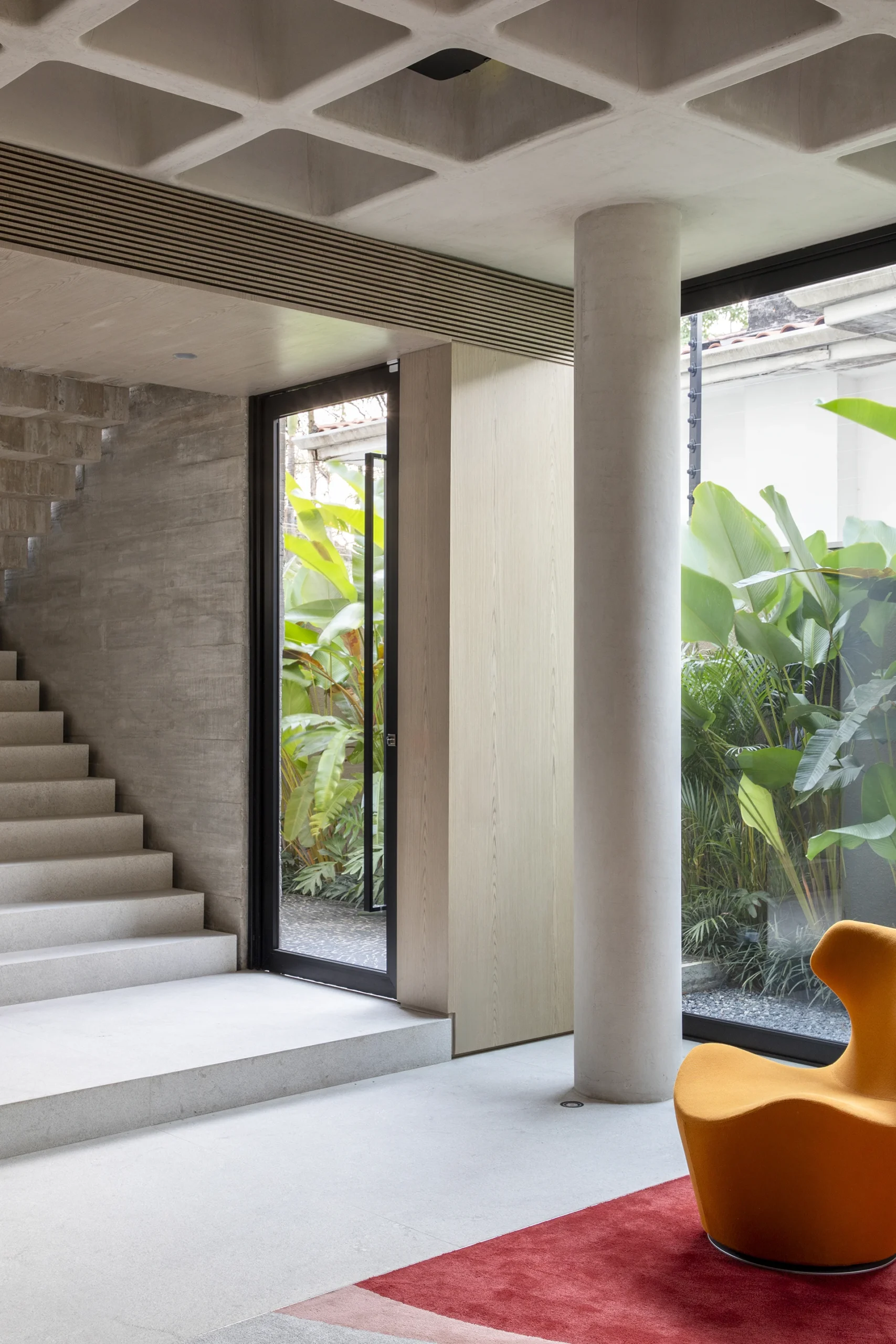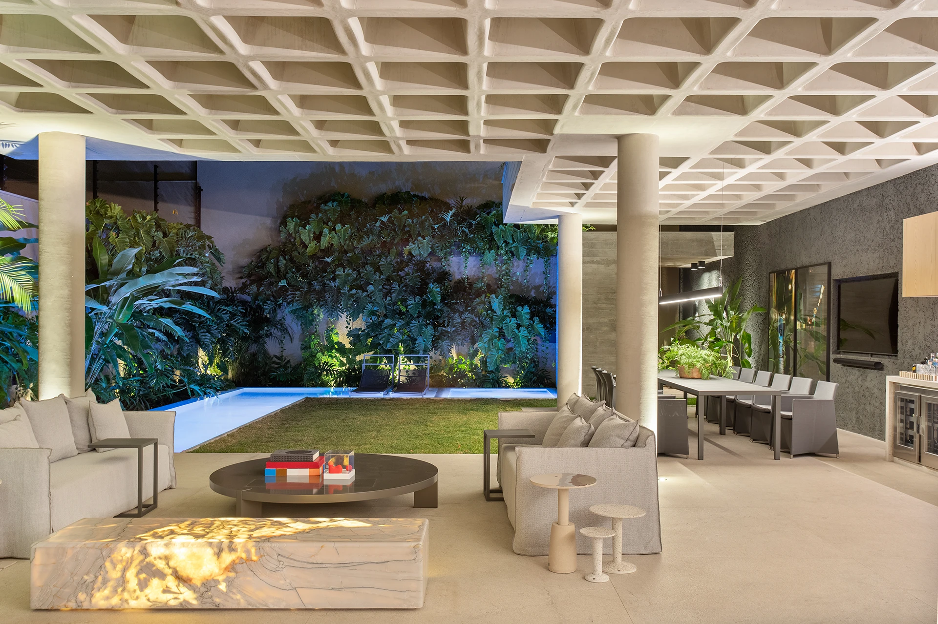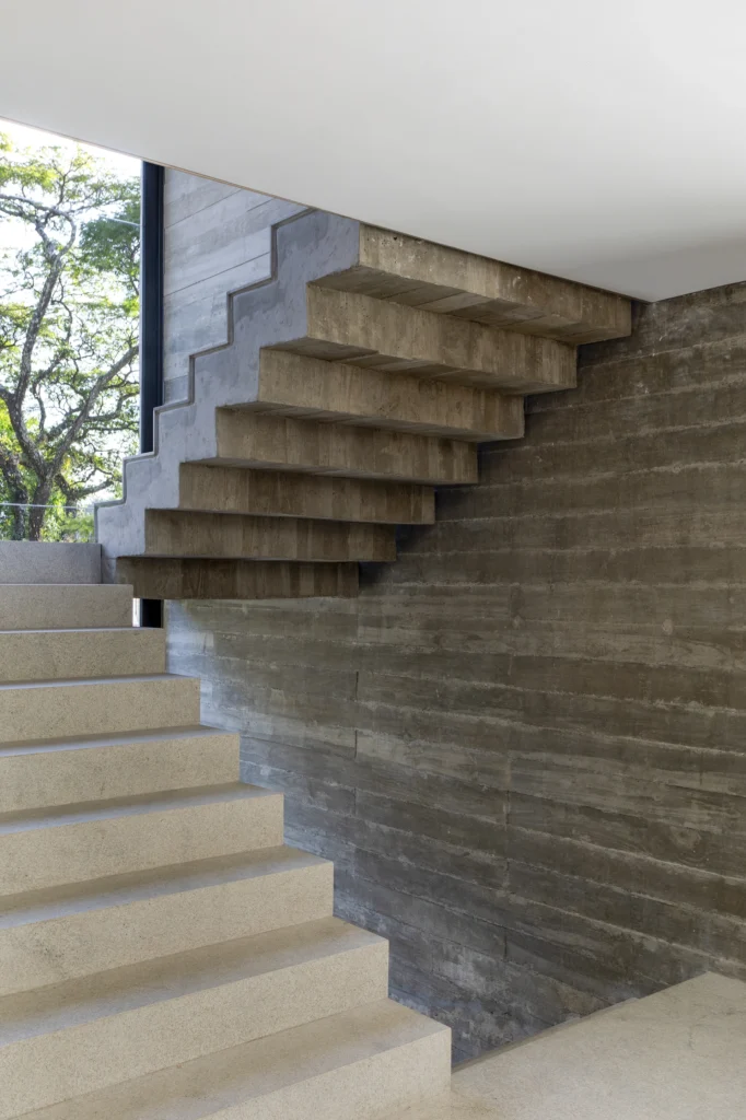 O sistema construtivo em concreto armado, com lajes nervuradas aparentes, define o caráter brutalista da residência. No piso térreo, praticamente sem paredes, os ambientes se integram em um grande espaço contínuo: estar, jantar, cozinha, gourmet e área externa se articulam de forma fluida, sempre voltados para os jardins e para a piscina. Os grandes vãos com esquadrias piso-teto em alumínio preto e vidro transparente reforçam a sensação de continuidade espacial, fazendo com que os limites entre dentro e fora se tornem quase imperceptíveis.