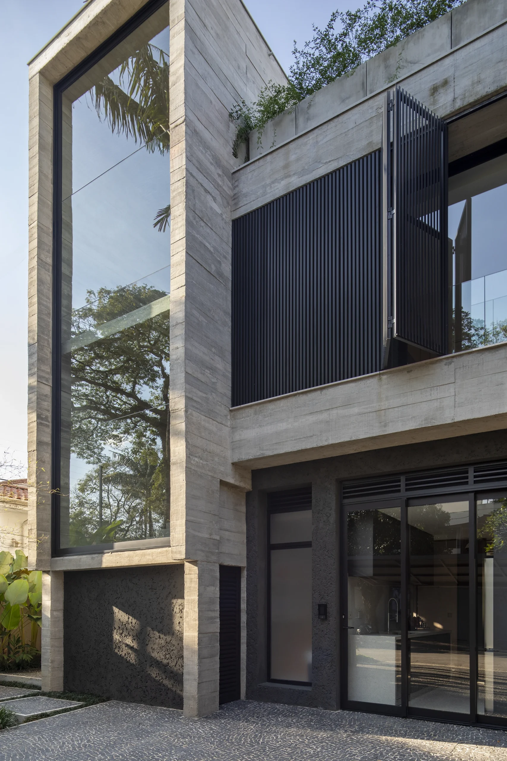 Localizada no bairro do Jardim Paulista, em São Paulo, esta casa de 580 m² foi concebida como uma residência urbana contemporânea, marcada pela força do concreto aparente, pela integração total entre interior e exterior e por uma área social generosa, pensada como o verdadeiro coração do projeto. Distribuída em três níveis — térreo, pavimento superior e terraço — a casa foi construída após a demolição da residência existente, mantendo a mancha original do lote, que carrega também um valor histórico: ali funcionou a antiga moradia do ex-governador André Franco Montoro.
