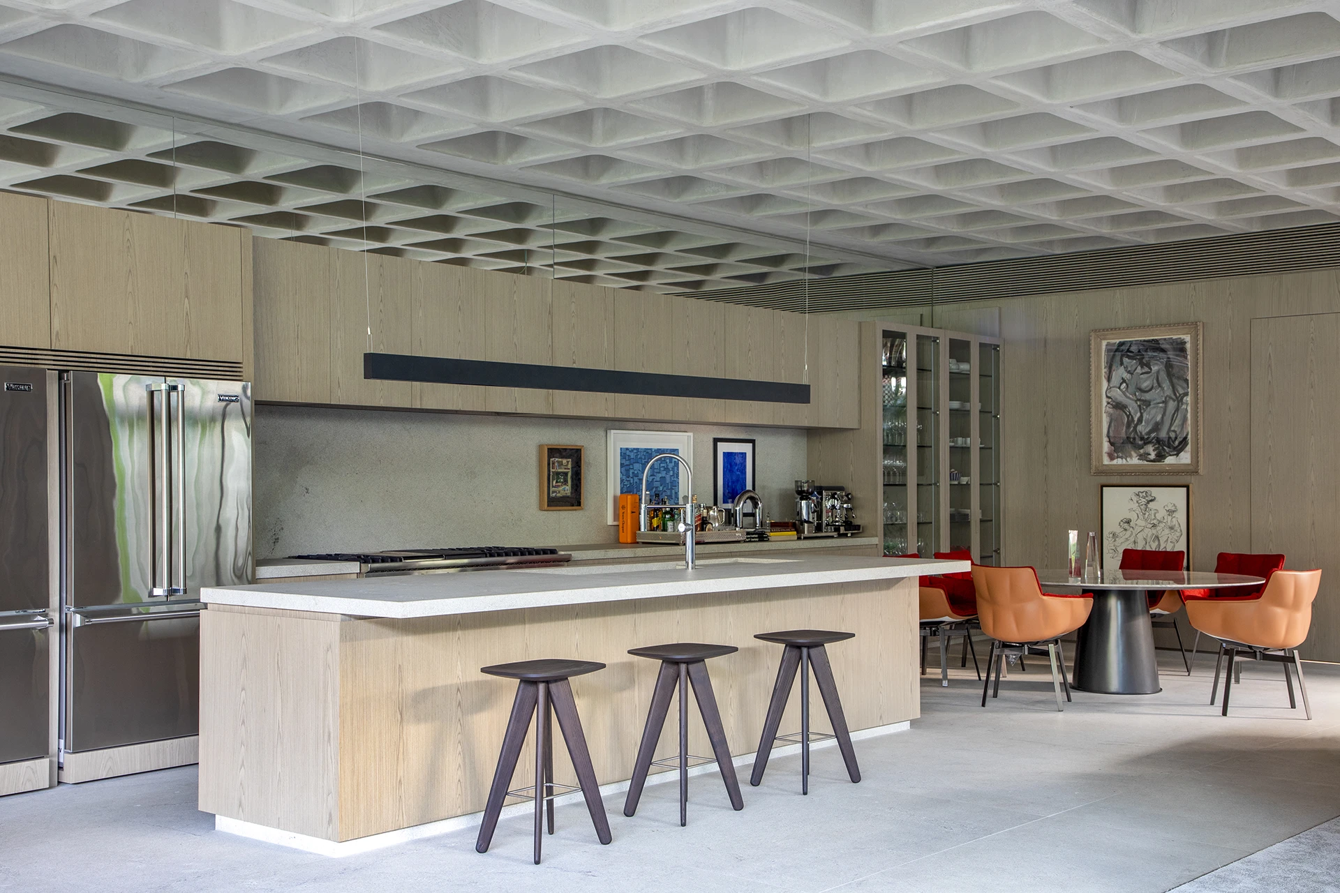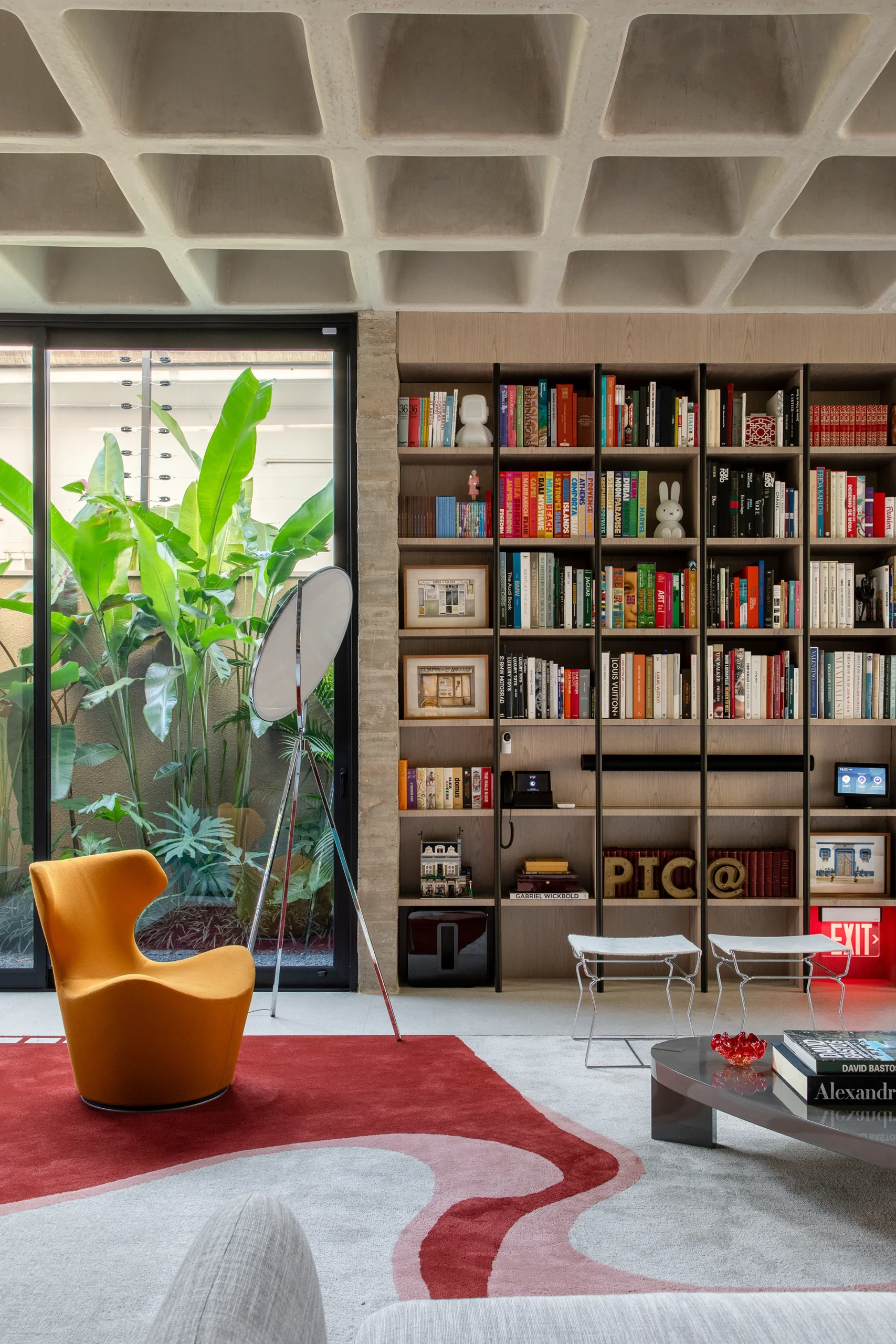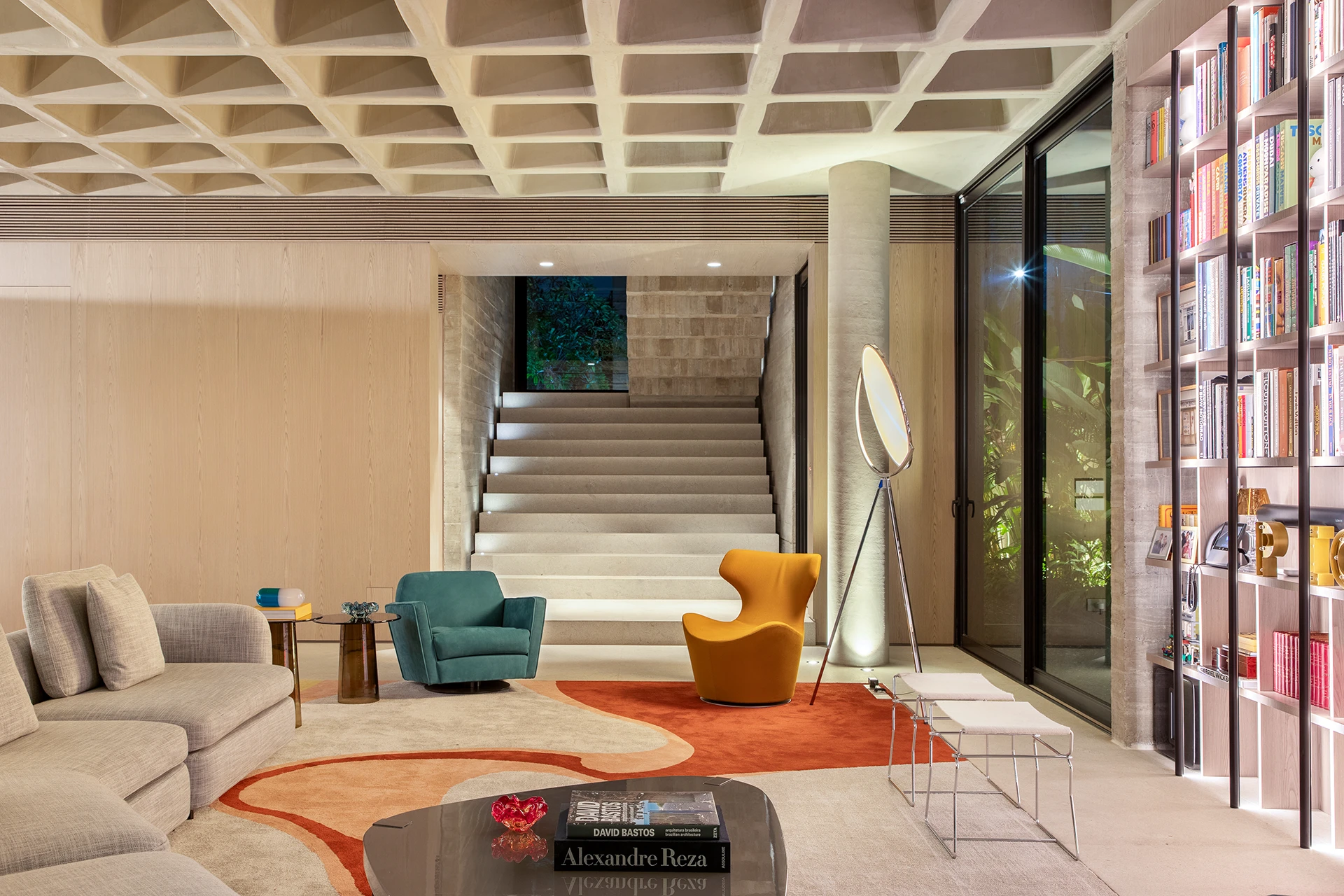 Entre os destaques do living estão a laje nervurada em concreto aparente, o tapete embutido no piso com desenho orgânico, desenvolvido pelo escritório, e os amplos planos de vidro que fazem da área externa uma extensão natural do espaço interno. O maior desafio do projeto esteve justamente em desenhar uma escada que dialogasse com a brutalidade do concreto, sem perder leveza, e em articular os grandes vãos de vidro com os jardins, criando uma arquitetura ao mesmo tempo forte e acolhedora.