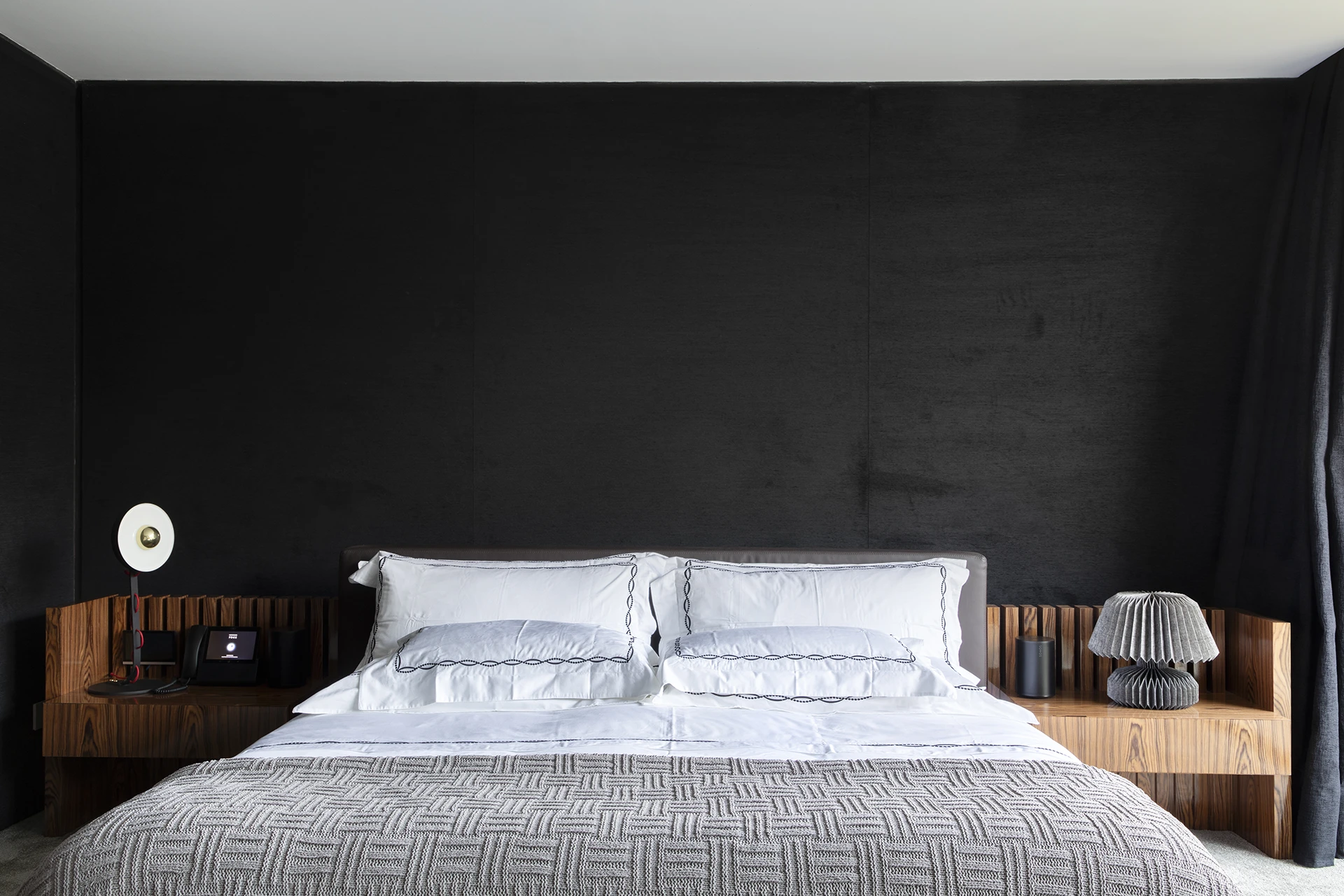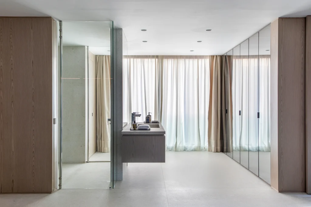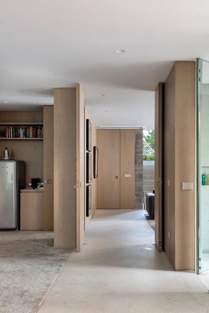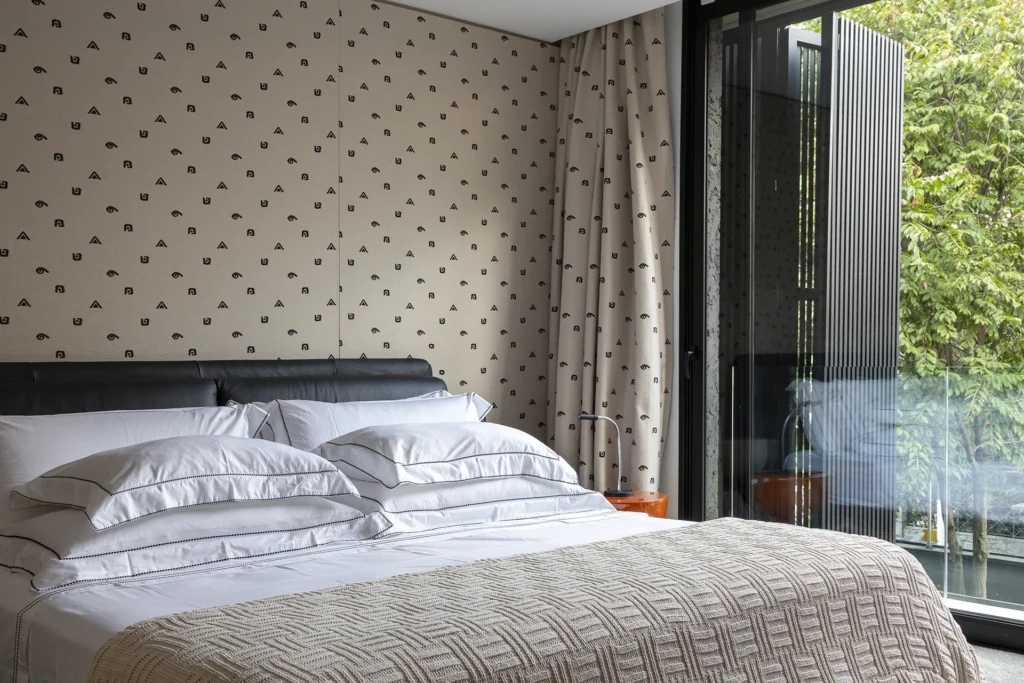 No pavimento superior, a atmosfera se transforma. A ala íntima recebeu tratamento mais acolhedor, com marcenarias em carvalho acinzentado, carpete no piso e tecidos aplicados às paredes. O programa inclui home theater, rouparia, uma suíte com varanda e a suíte master, que se destaca pela antessala, closet e varanda privativa, criando a sensação de estar em um hotel cinco estrelas. O layout foi pensado de forma flexível, permitindo que a atual configuração da suíte master possa, futuramente, originar uma terceira suíte.