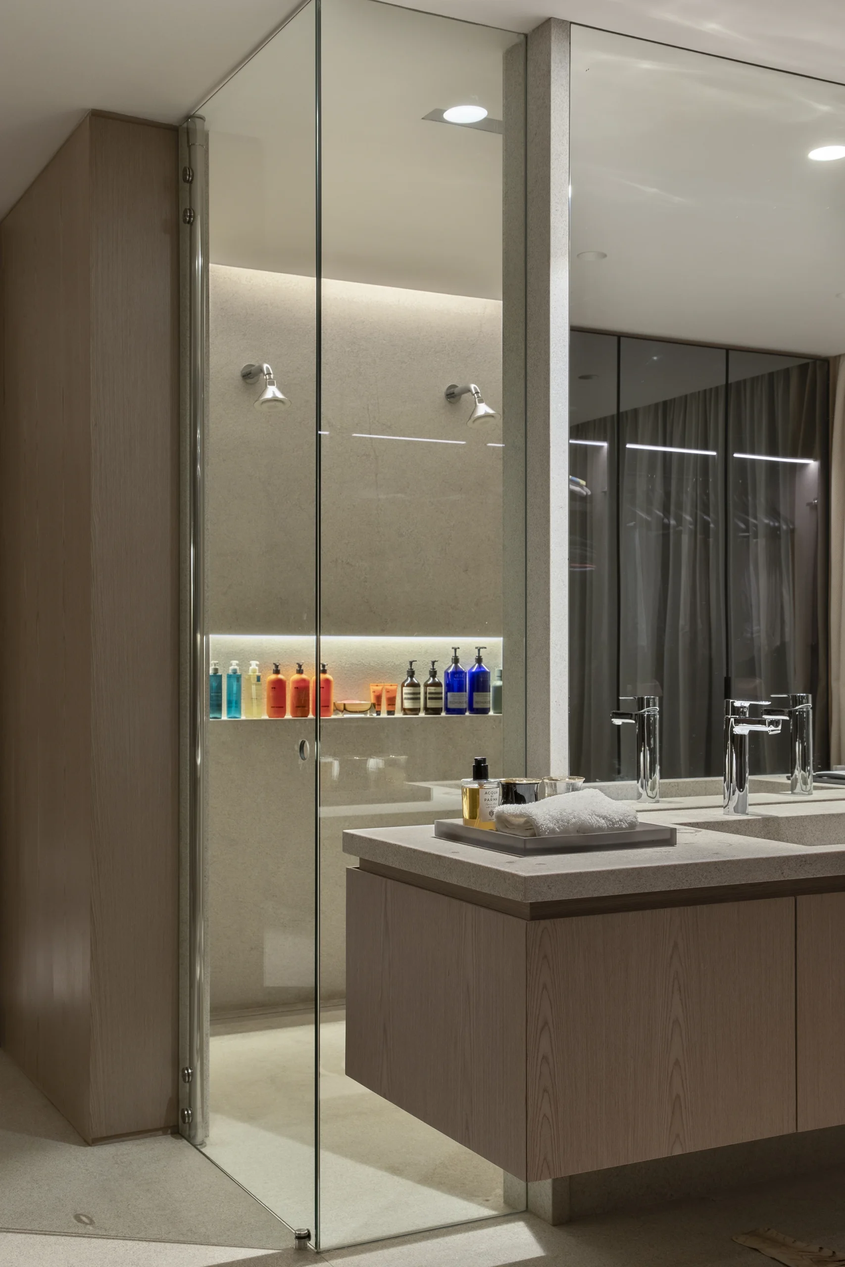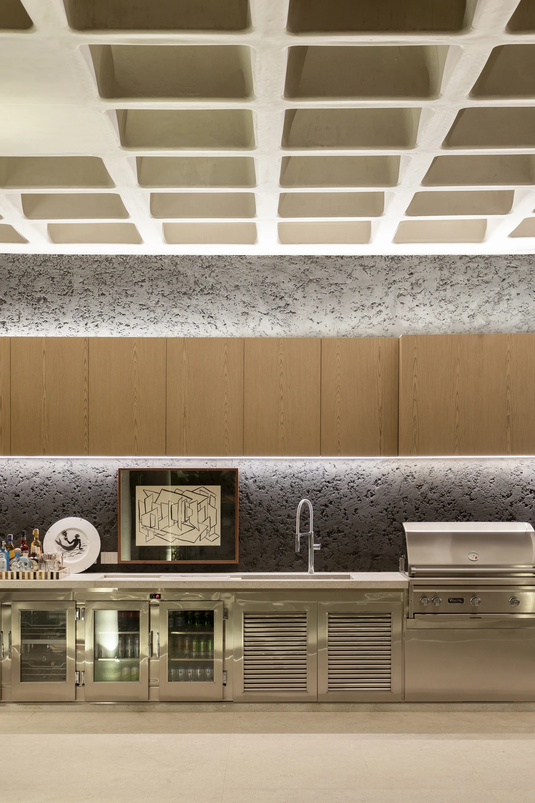 A área social foi desenhada para receber, com três lavabos estrategicamente distribuídos e a possibilidade de integrar totalmente piscina e espaço gourmet ao living. A cozinha social e a de apoio funcionam de forma independente, garantindo praticidade no uso cotidiano e em eventos. O piso em granito branco Itaúnas escovado aparece como elemento unificador dos ambientes, reforçando a leitura contínua do espaço.