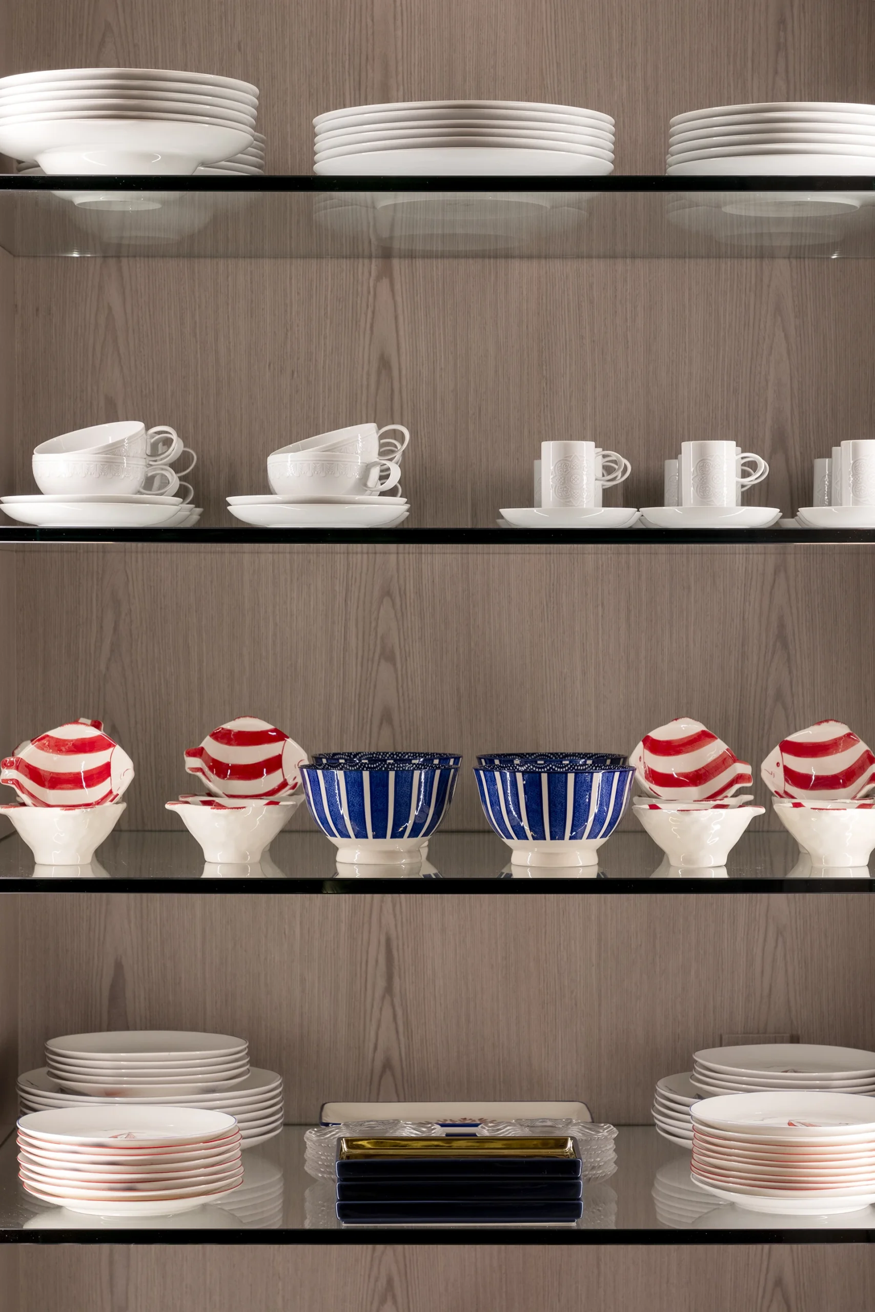 A curadoria de interiores priorizou móveis com personalidade e design assinado, escolhidos de forma pontual para manter a fluidez do layout. Destacam-se peças de Patricia Urquiola, Naoto Fukasawa, Jean-Marie Massaud, Paola Navone e Rodrigo Torres, além do sofá modular da Poliform, que se torna o maior e mais expressivo elemento do living. A mesa de jantar foi desenhada especialmente pelo escritório, a partir da escolha da pedra do tampo, reforçando o caráter autoral do projeto.