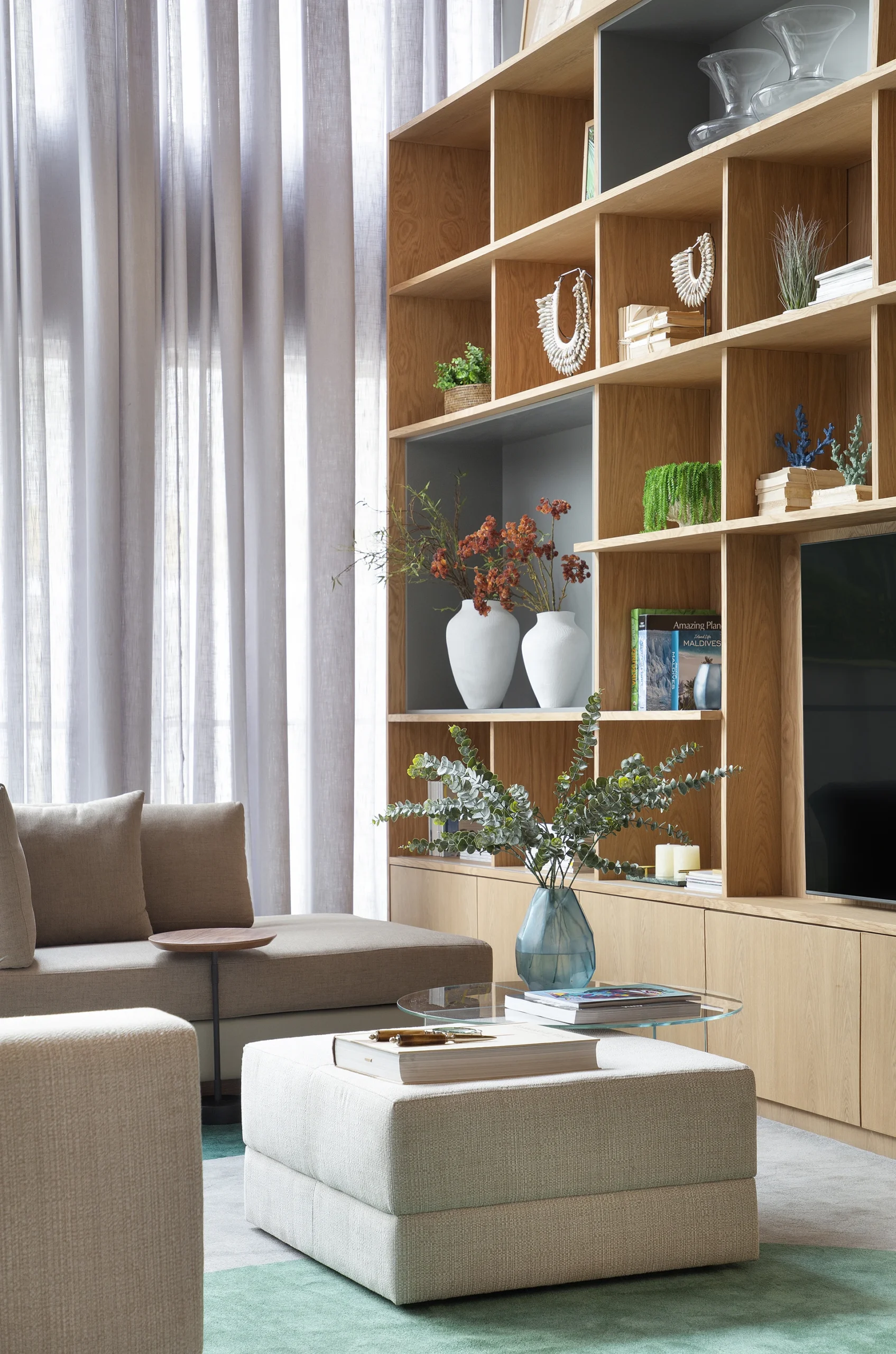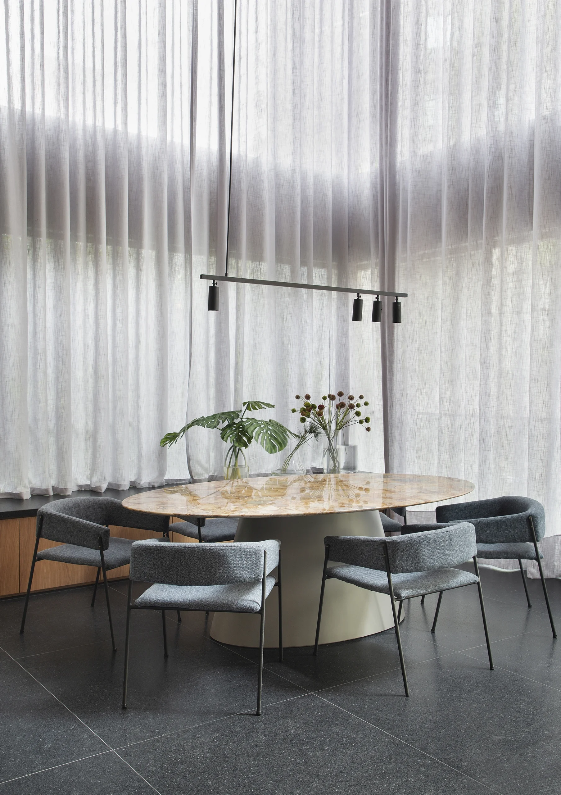 No jantar, a mesa desenhada exclusivamente por David Bastos se destaca como peça central do espaço, aliando proporção, desenho autoral e presença escultórica. O estar ganha conforto e personalidade com sofá e poltronas da Jocal Estofados, que reforçam o caráter elegante e convidativo do ambiente. Alguns móveis e objetos cuidadosamente selecionados pela Design Supplier complementam o projeto, acrescentando camadas de identidade e sofisticação.