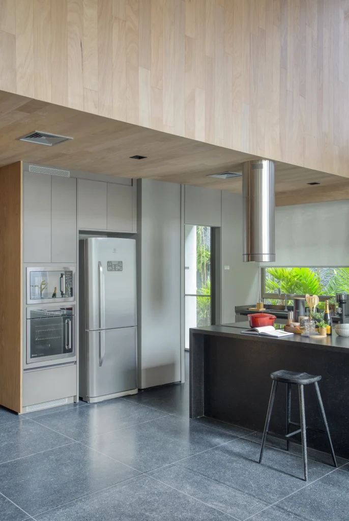 A cozinha, integrada de forma sutil à área social, alia praticidade e estética, com equipamentos embutidos e marcenaria que reforça a continuidade visual do projeto.