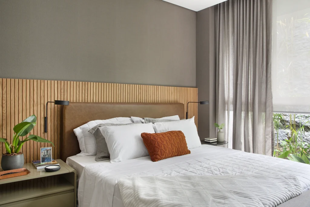 Na área íntima, as duas suítes foram concebidas como verdadeiros refúgios urbanos. A suíte principal se destaca pelo layout generoso, pela marcenaria precisa e pela paleta cromática suave, pensada para favorecer o descanso e a tranquilidade. Os banheiros seguem a mesma linguagem do apartamento, com desenho contemporâneo e soluções funcionais.