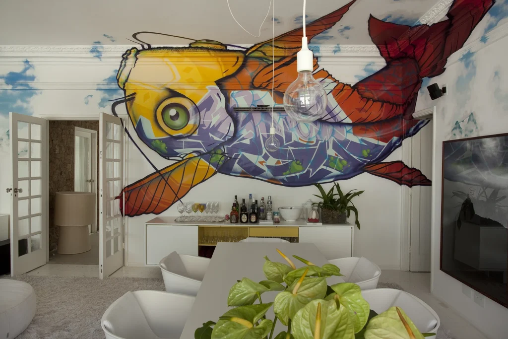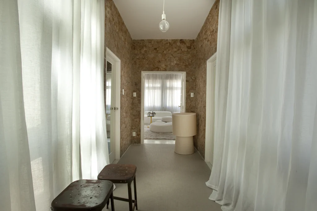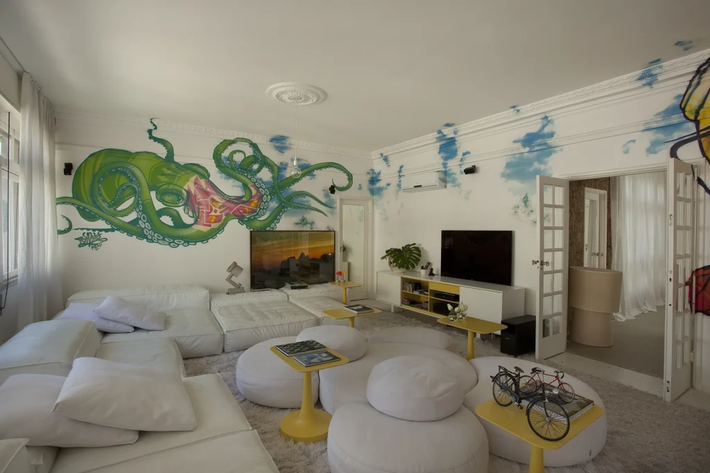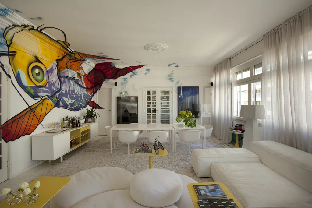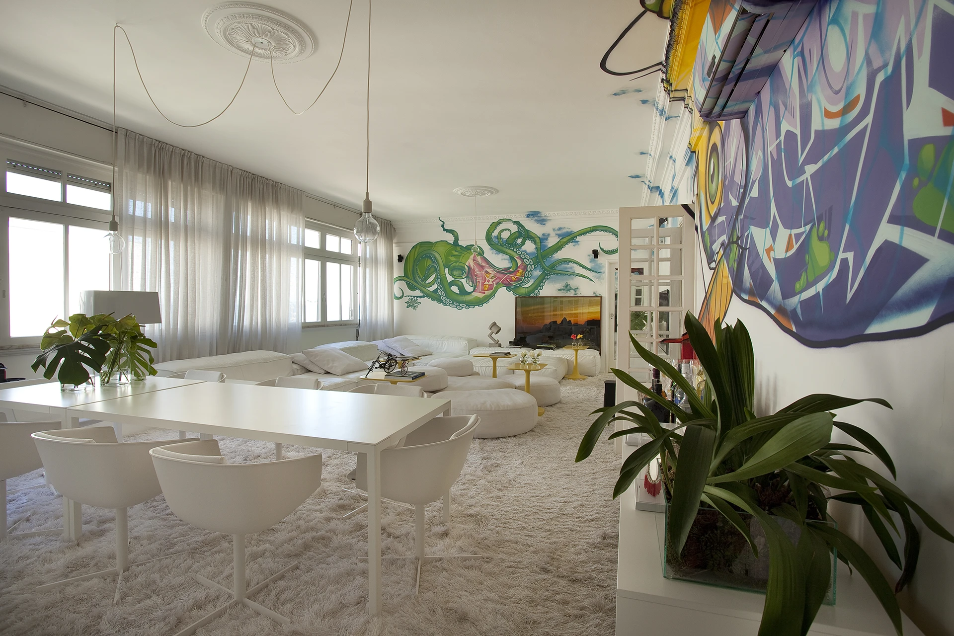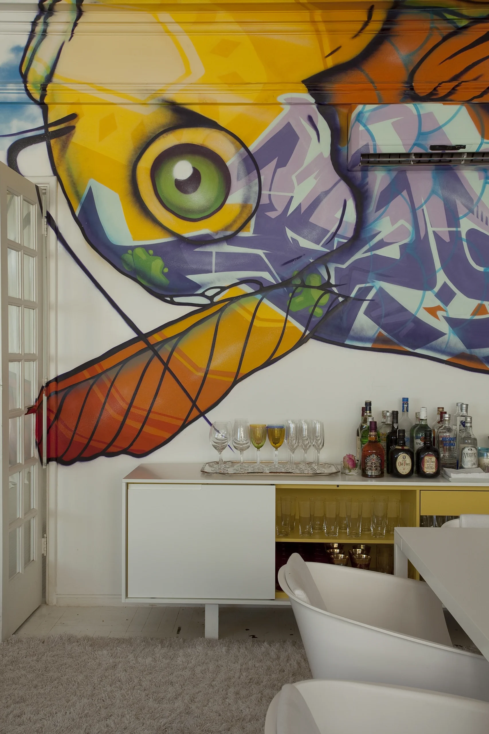 Elementos da arquitetura brutalista reforçam a estética singular do projeto, como as paredes de pedra no hall de entrada e as fiações aparentes responsáveis pela distribuição da iluminação. O piso original de taco foi repaginado e recebeu pintura branca, criando uma base neutra que valoriza a riqueza das texturas e dos detalhes. A exuberância da street art contrasta com a linguagem clean do espaço, quebrada pontualmente por peças de mobiliário e design da Casual Móveis.