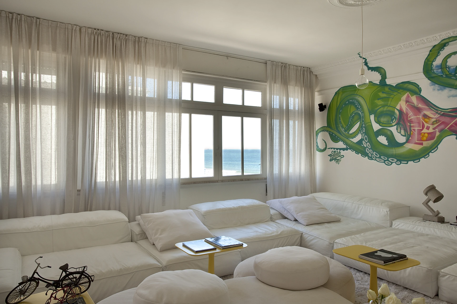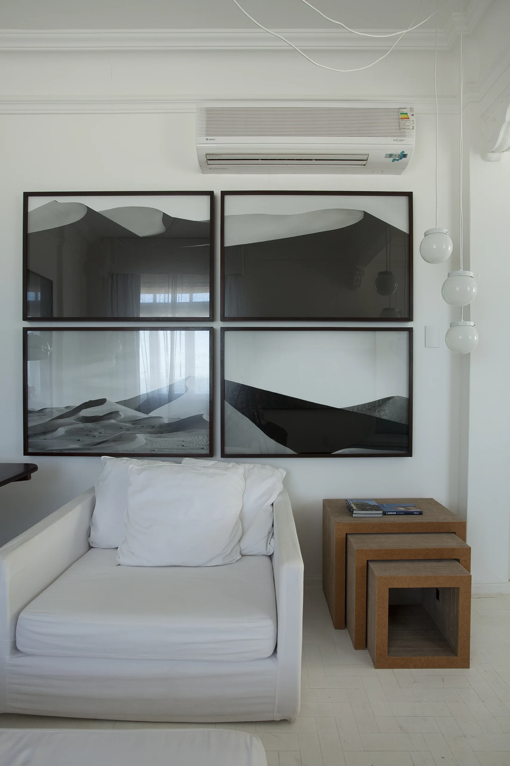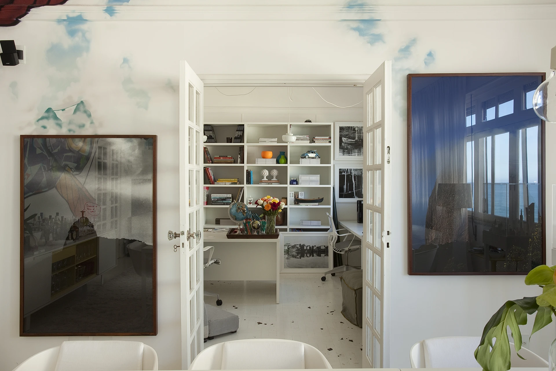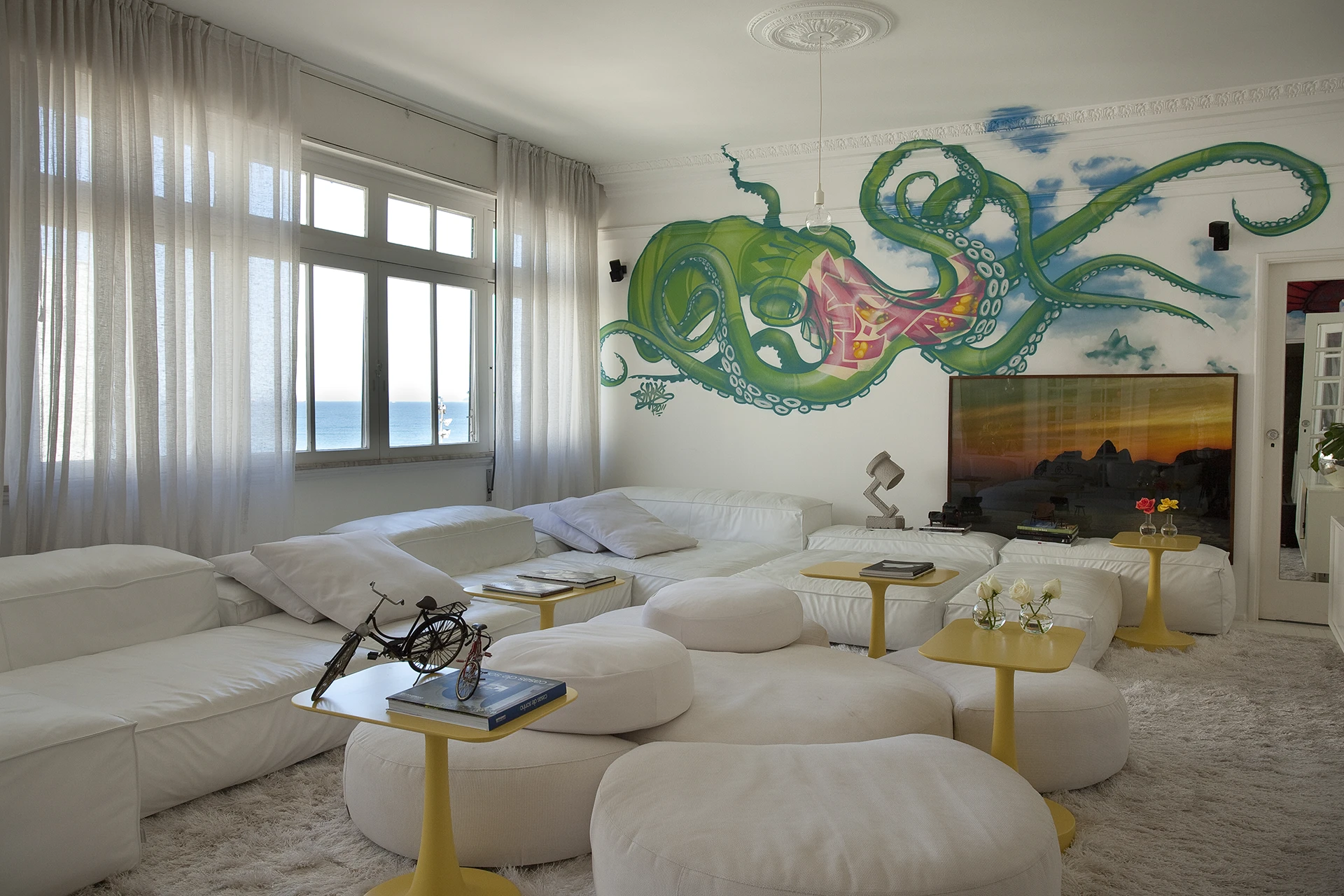 Gráficos de cores vivas, em dimensões generosas e provocadoras, dão o tom do apartamento. Assinadas por Binho Ribeiro, as criaturas marinhas parecem ter emergido diretamente da praia de Ipanema, a apenas 200 metros dali, invadindo o interior por uma das muitas janelas e convidando a imaginação a fluir livremente. As amplas aberturas para o exterior e a proximidade com o mar foram decisivas para encantar o arquiteto David Bastos durante a visita a este edifício da década de 1940, onde, em 2014, decidiu conceber sua morada carioca.