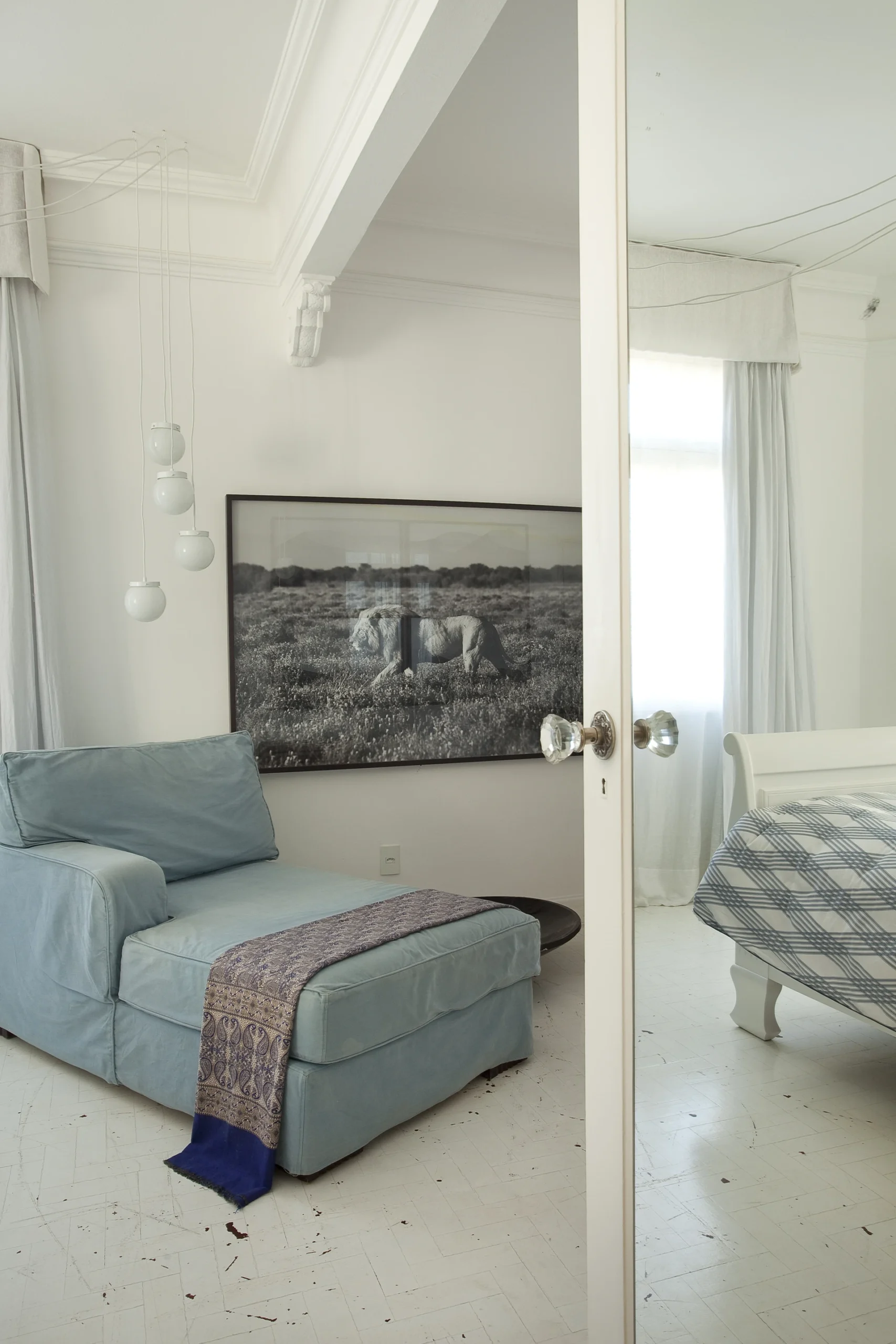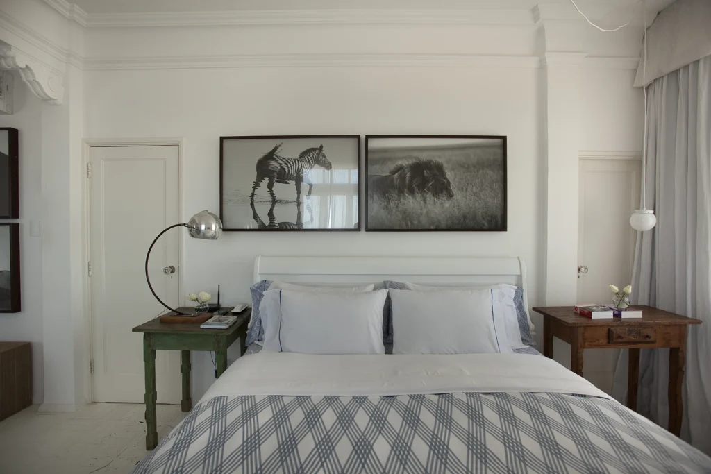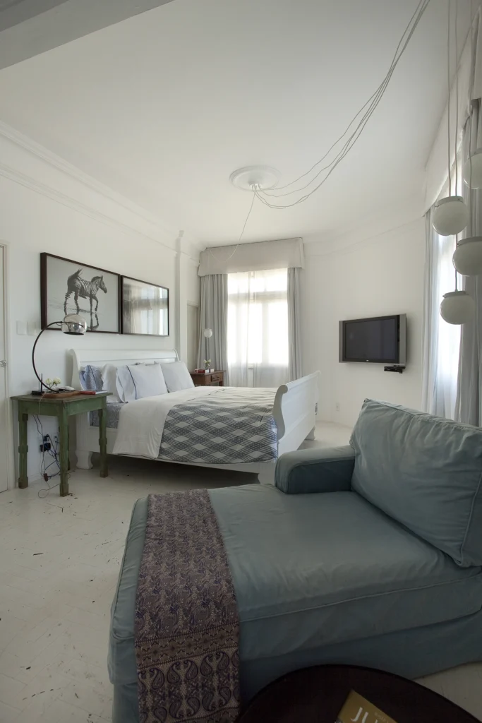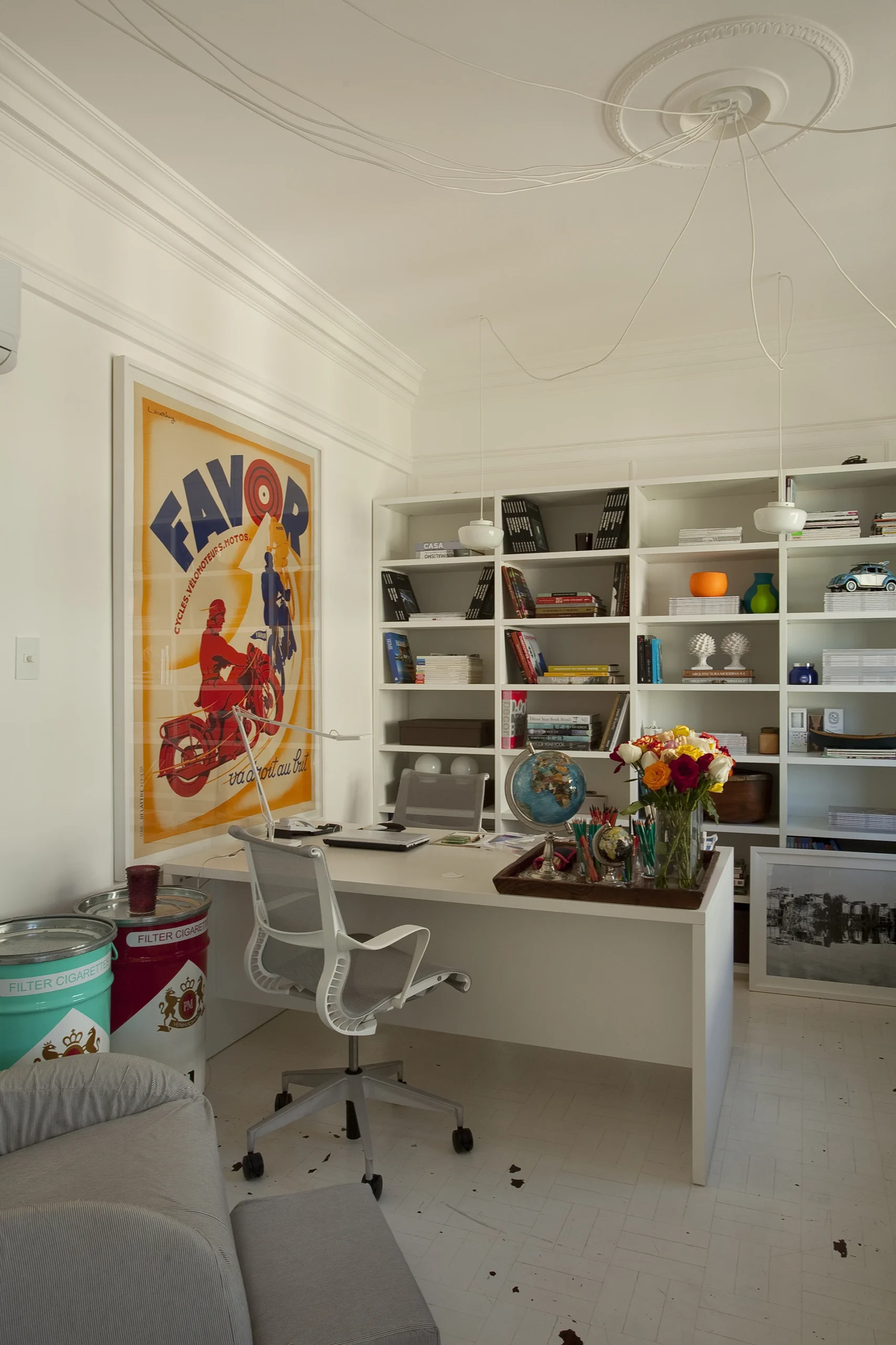 Rosetas e ornamentos no forro de gesso revelam vestígios da história do imóvel, reforçando o diálogo entre passado e presente. Esse jogo de contrastes — interior e exterior, sobriedade e informalidade, cores intensas e tons discretos — se estende também aos banheiros, que combinam espelhos venezianos dourados, louças vintage e cortinas de veludo. O resultado é uma leitura arrojada e contemporânea da Cidade Maravilhosa, celebrada ainda nas paredes, onde surgem desenhos icônicos do Cristo Redentor, do Corcovado e do Pão de Açúcar.