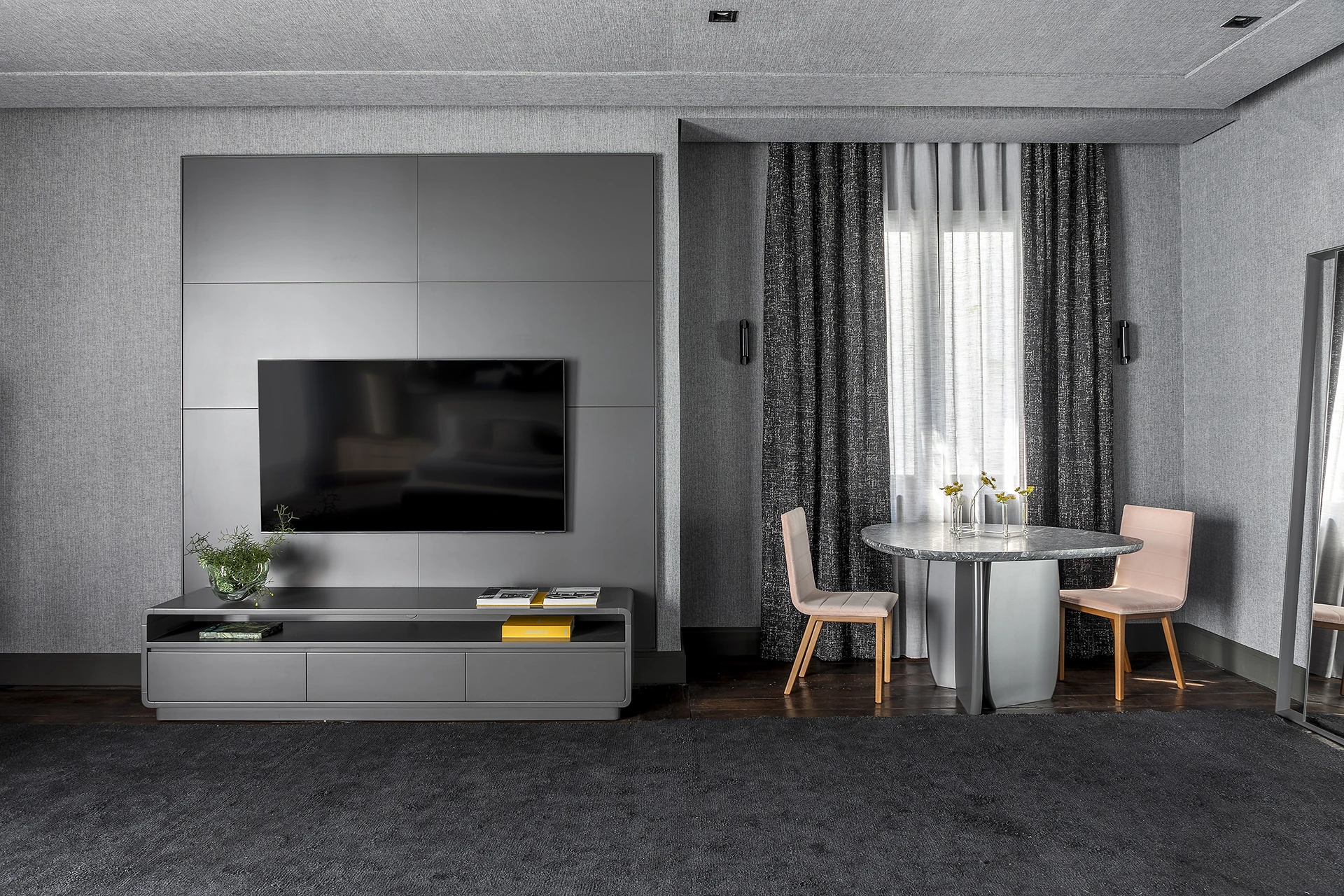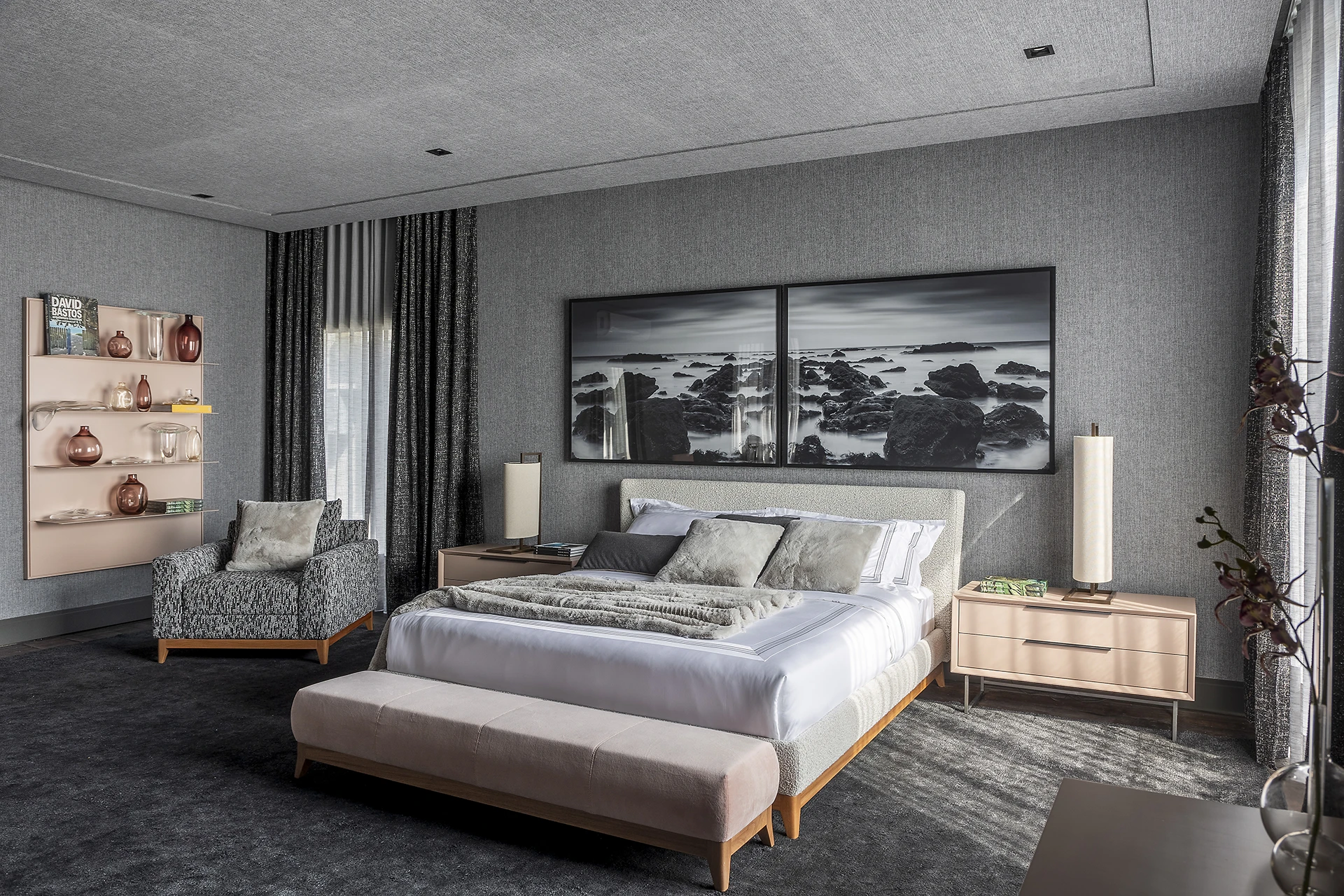 by Kamy – tapetes de destaque nos ambientes da mostra, incluindo o “Liberdade” de David Bastos (tapete Madras Black Silk Mix).