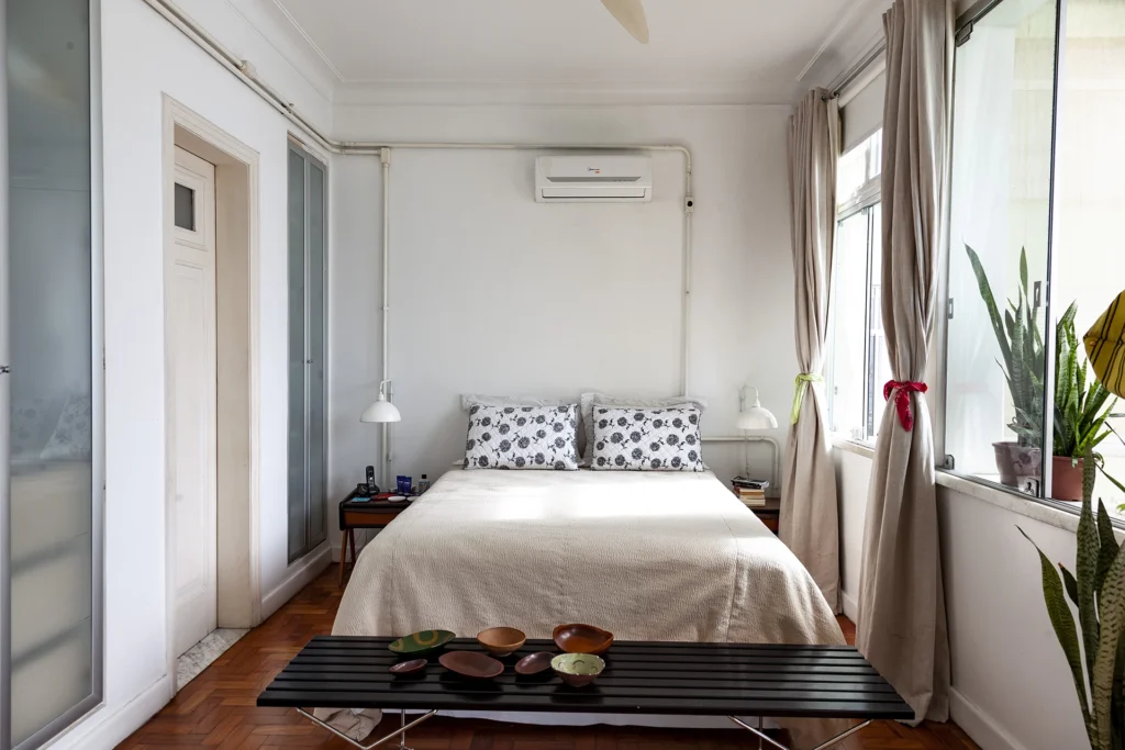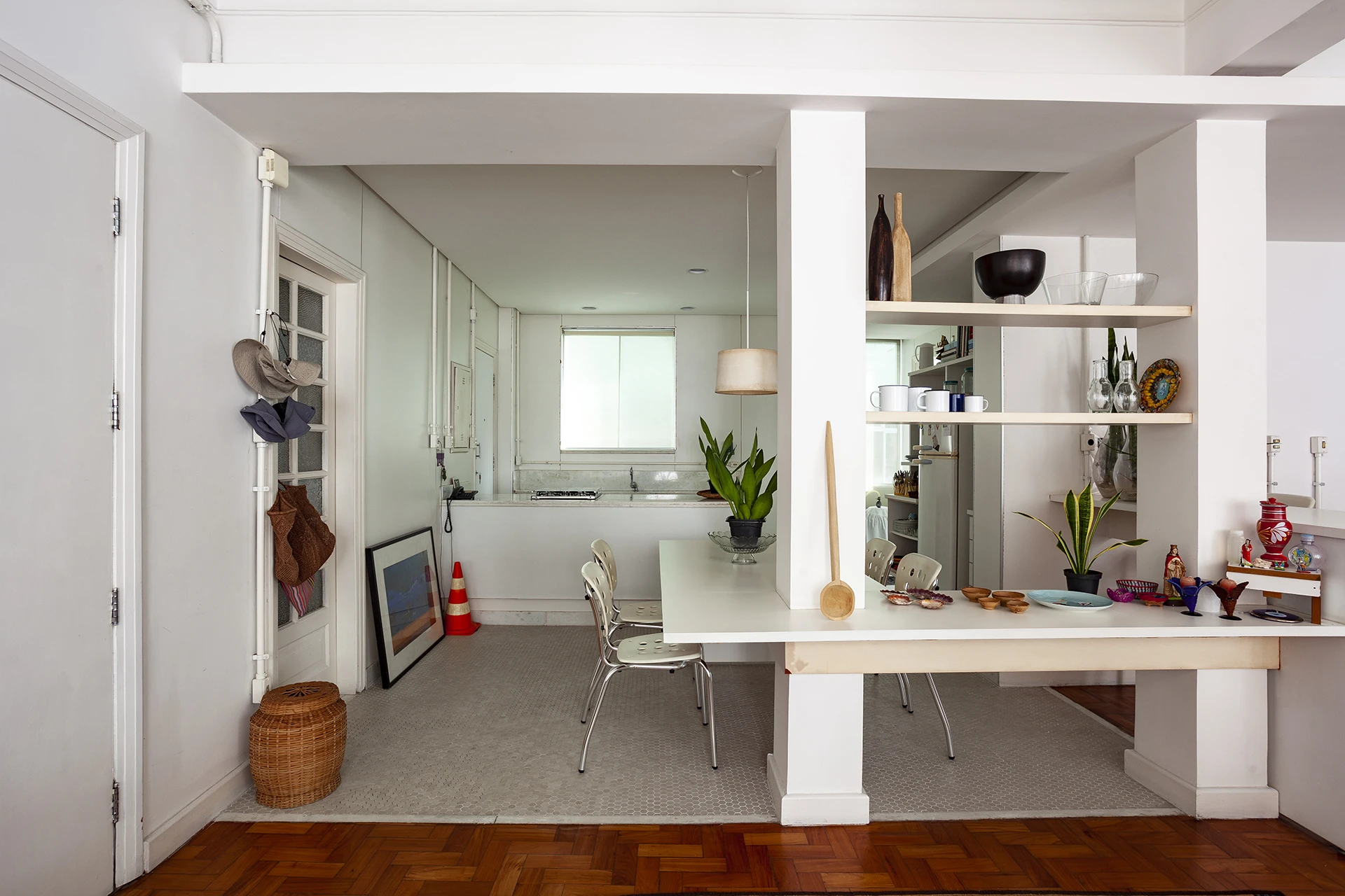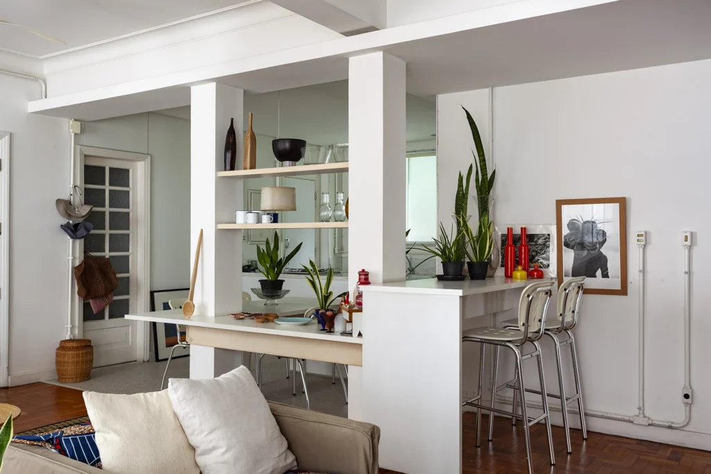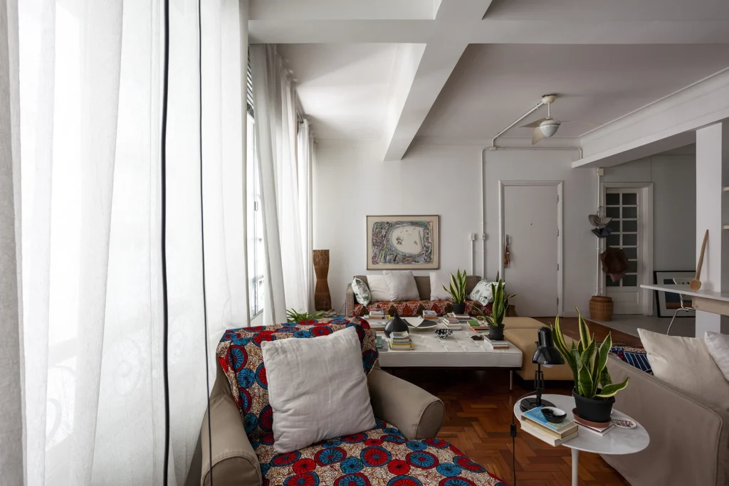 Após uma intervenção delicada e precisa, o apartamento dos anos 1930 revela o estilo despojado e afetivo de sua proprietária, Joyce Pascovitch. A reforma partiu da reorganização da planta original: dois dormitórios deram lugar a uma suíte ampla, enquanto a varanda foi fechada com folhas de vidro, protegendo o interior dos ventos fortes vindos do mar e ampliando a área social.
