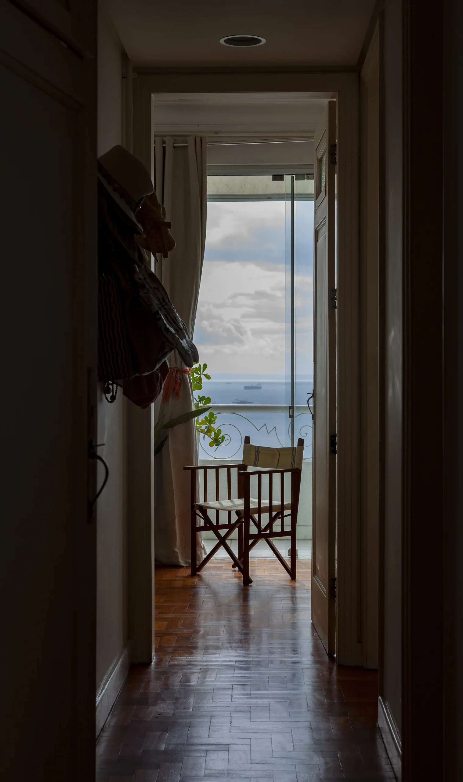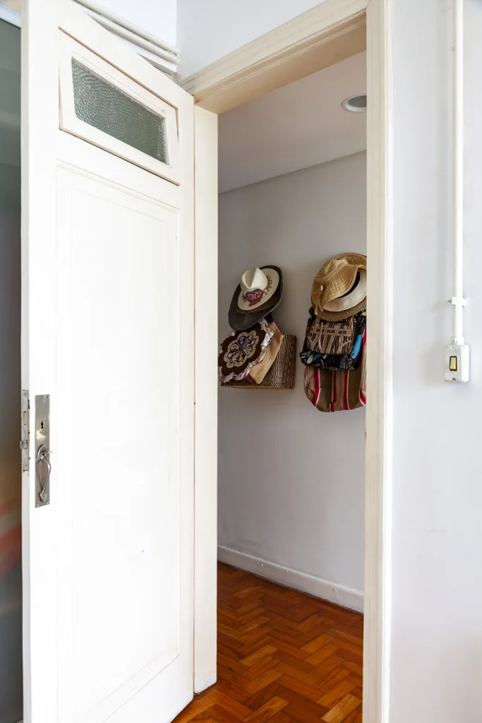 Jornalista e empresária, Joyce imprime personalidade ao espaço com chapéus, mantas, bolsas e castiçais de cores vibrantes, trazidos de diferentes lugares. Esses elementos convivem em harmonia com o charme art déco do edifício, evidenciado pelos gradis de ferro trabalhado, janelas em forma de escotilha e tetos ornamentados em gesso. Com vista ampla para a Baía de Todos-os-Santos, o apartamento se transforma em um refúgio de verão onde identidade pessoal e patrimônio arquitetônico se encontram, permitindo que a moradora se reconheça plenamente em cada detalhe.