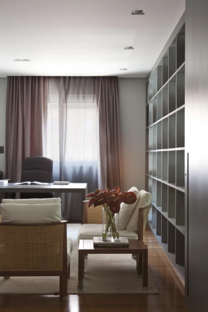 Elemento recorrente nas casas assinadas por David Bastos, os palletões de madeira surgem aqui de forma discreta, utilizados como divisória entre a sala e a varanda integrada, estabelecendo uma transição sutil entre os ambientes e adicionando textura e identidade ao espaço.