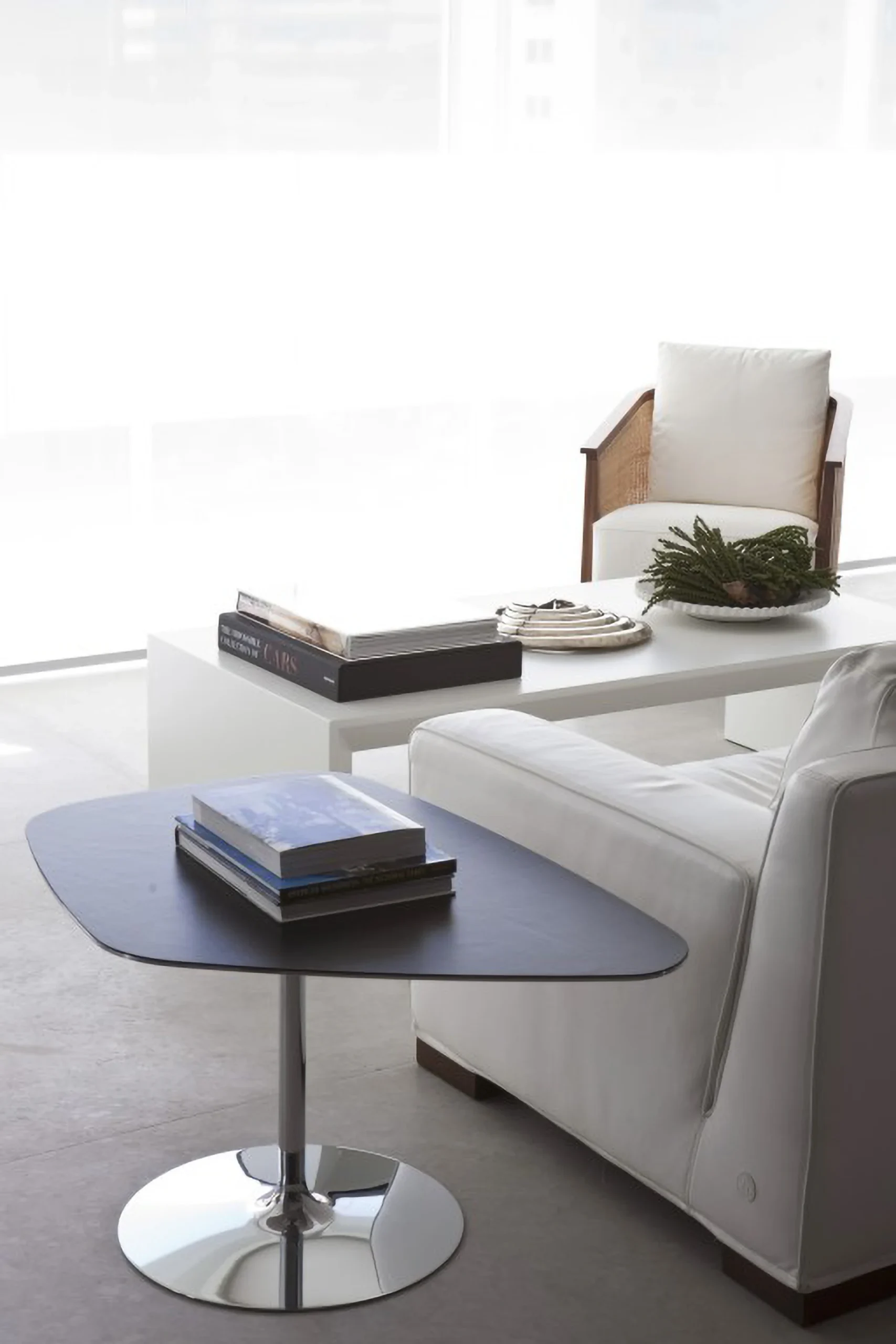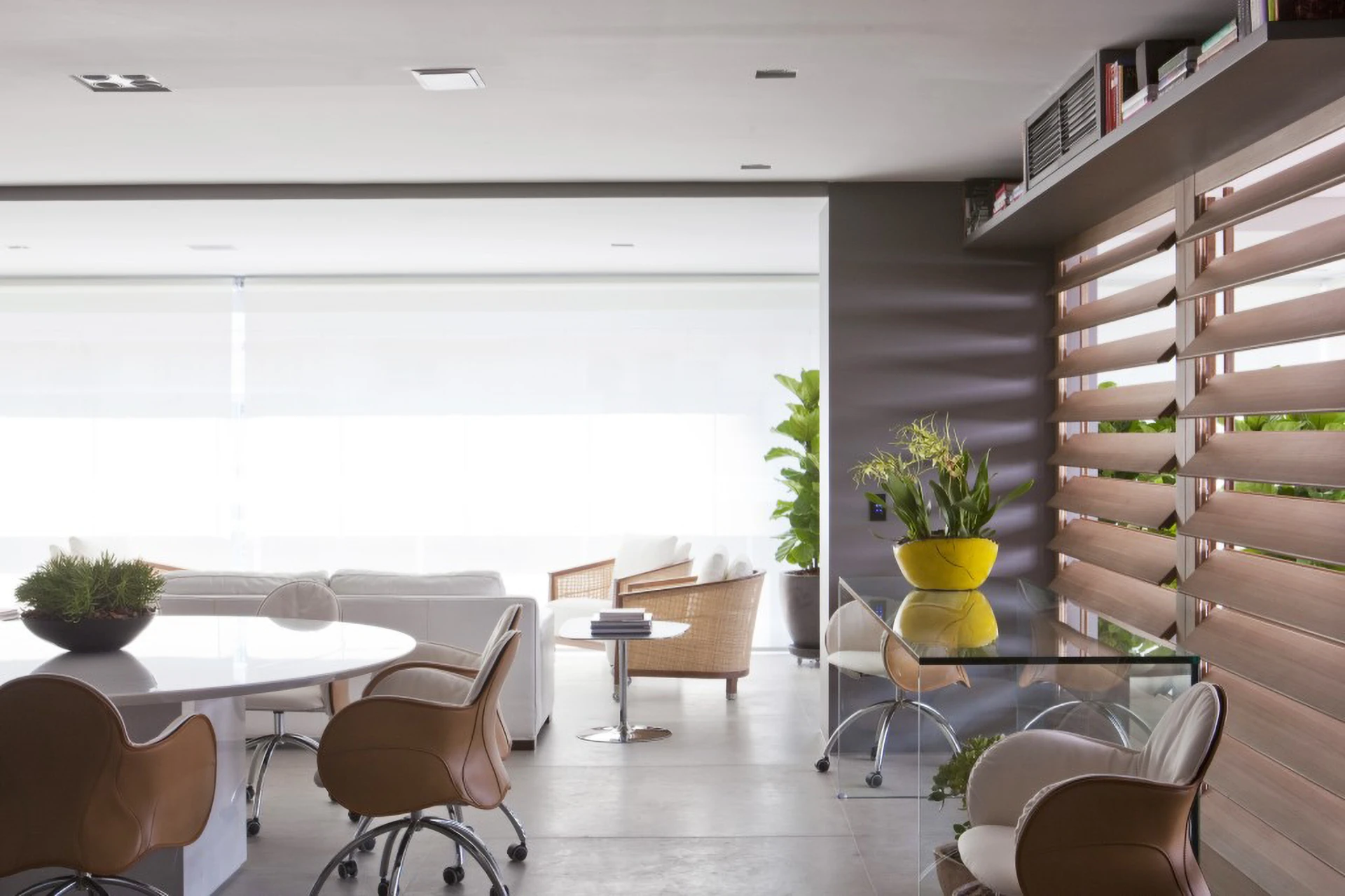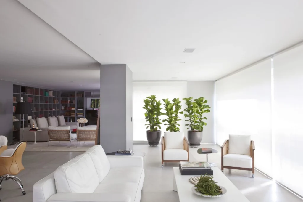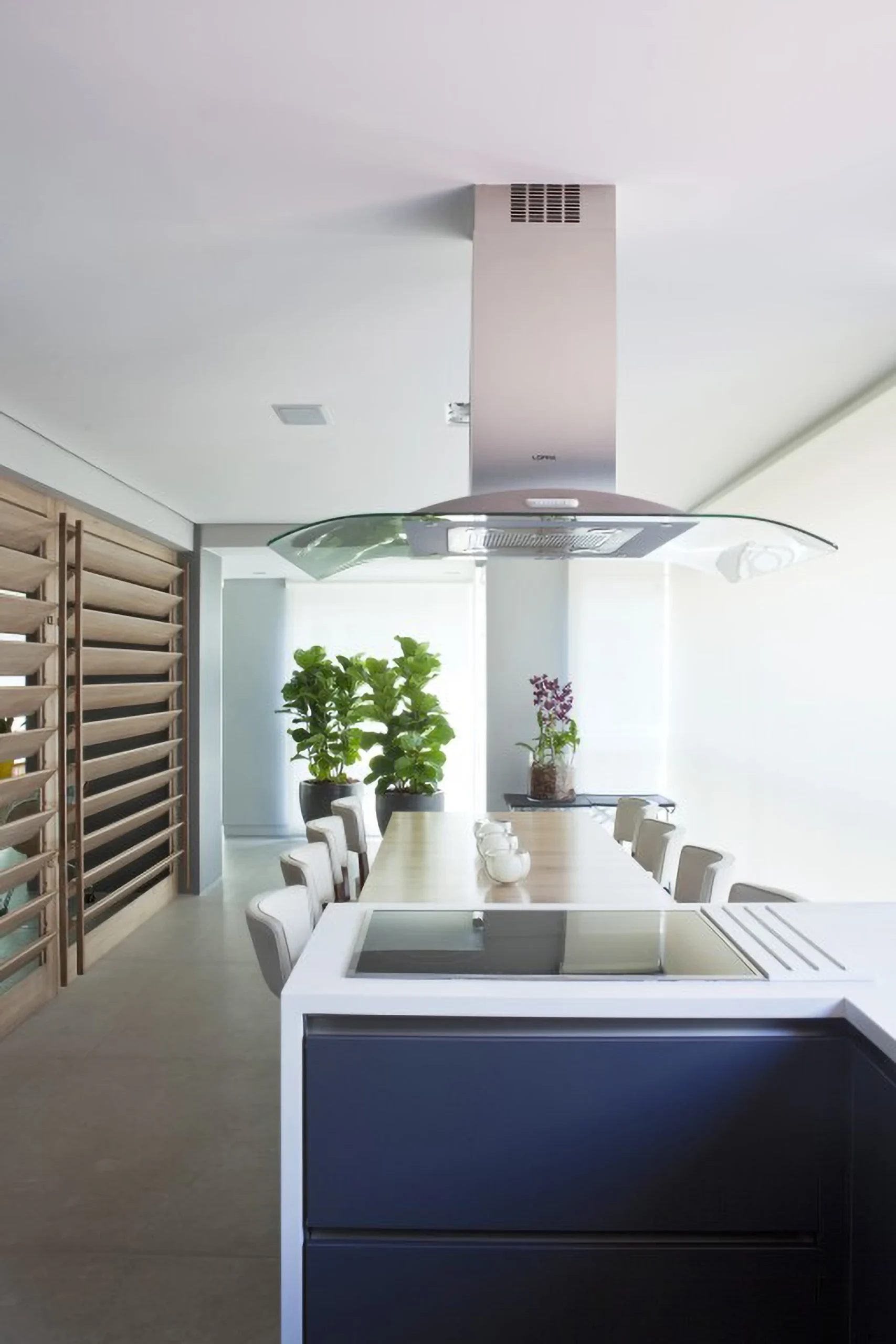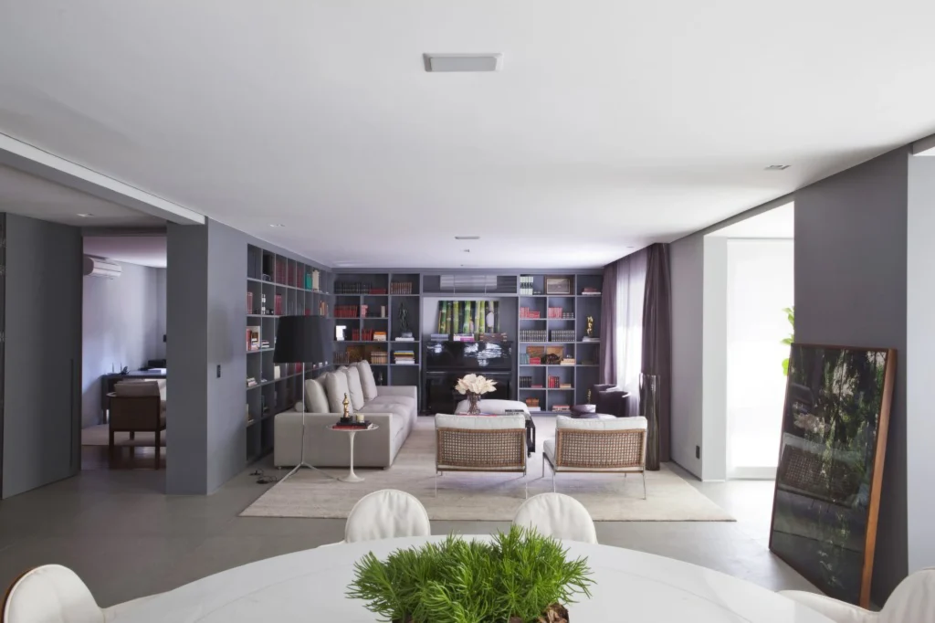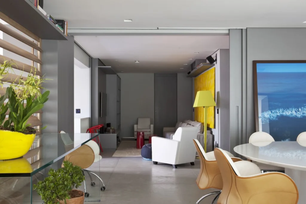Localizado em Moema, este apartamento de 200 m² passou por uma reconfiguração que privilegiou a integração da sacada à sala, ampliando a área social. O novo layout incorporou um espaço gourmet, pensado para receber, e uma mesa de jantar com cadeiras da italiana De Padova, que reforçam o caráter contemporâneo do projeto.