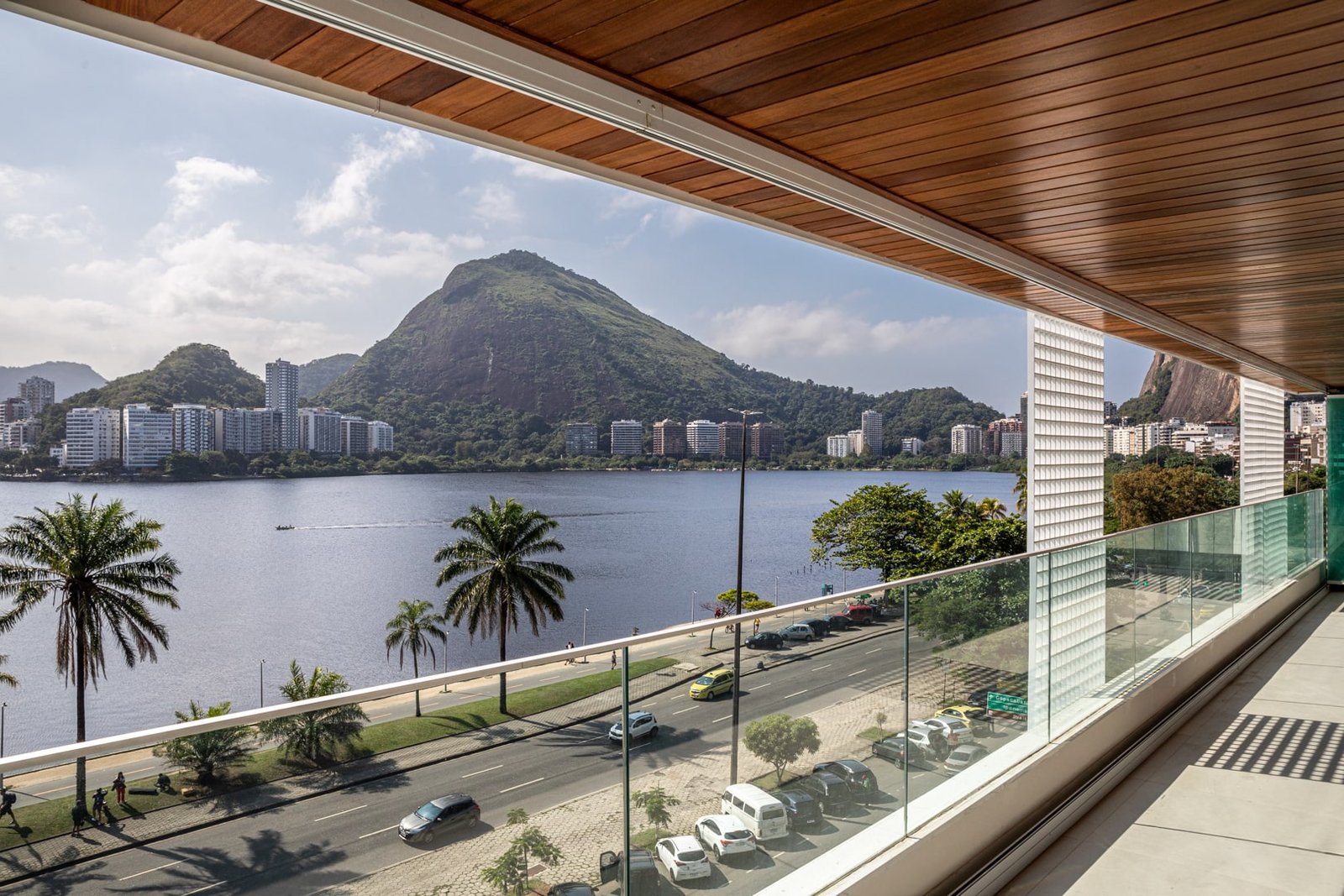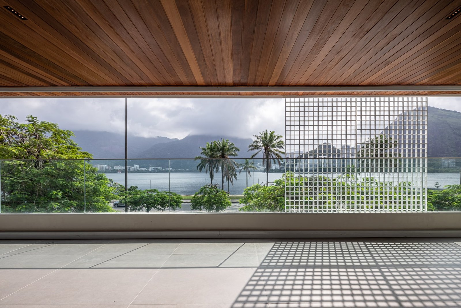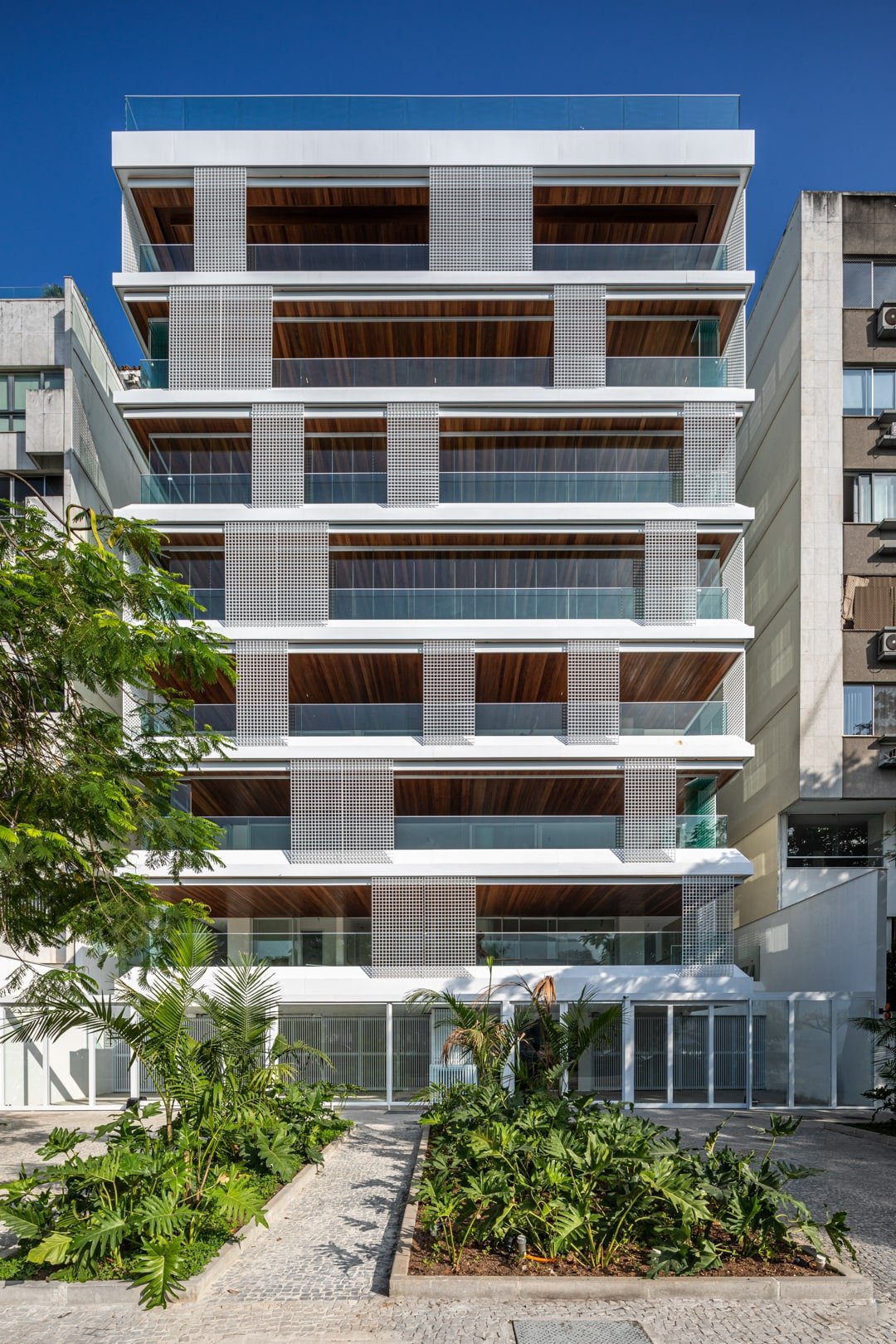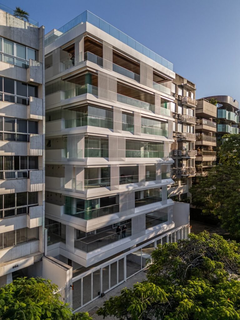 A fachada se destaca pela composição equilibrada entre cheios e vazios, transparências e elementos de proteção solar. O desenho explora a verticalidade de forma leve e ritmada, utilizando materiais nobres e soluções arquitetônicas que promovem conforto térmico e visual. Elementos móveis e planos filtrantes criam um jogo dinâmico de luz e sombra, além de garantir privacidade sem comprometer a vista privilegiada da Lagoa. O resultado é uma arquitetura expressiva, contemporânea e profundamente conectada ao entorno.