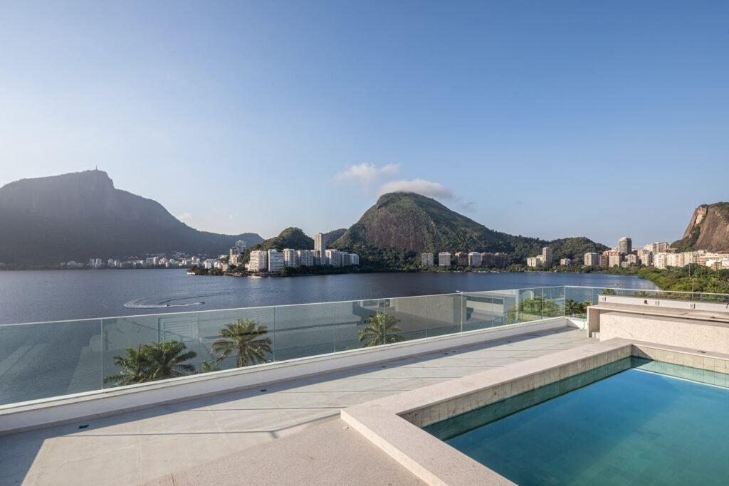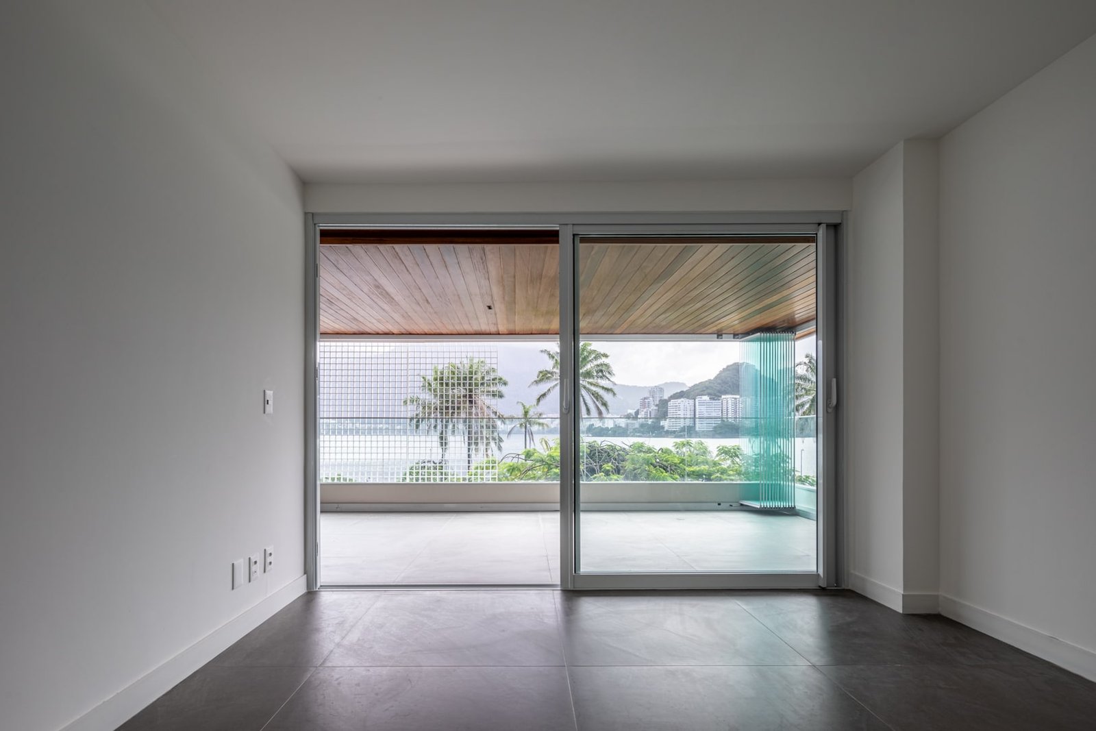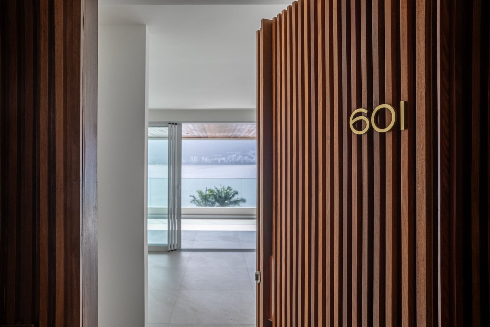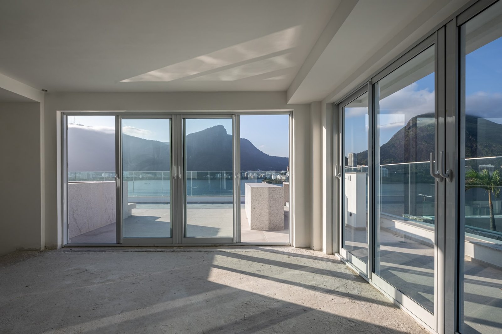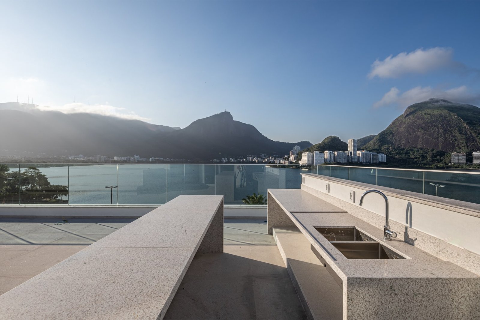 A fachada se destaca pela composição equilibrada entre cheios e vazios, transparências e elementos de proteção solar. O desenho explora a verticalidade de forma leve e ritmada, utilizando materiais nobres e soluções arquitetônicas que promovem conforto térmico e visual. Elementos móveis e planos filtrantes criam um jogo dinâmico de luz e sombra, além de garantir privacidade sem comprometer a vista privilegiada da Lagoa. O resultado é uma arquitetura expressiva, contemporânea e profundamente conectada ao entorno.