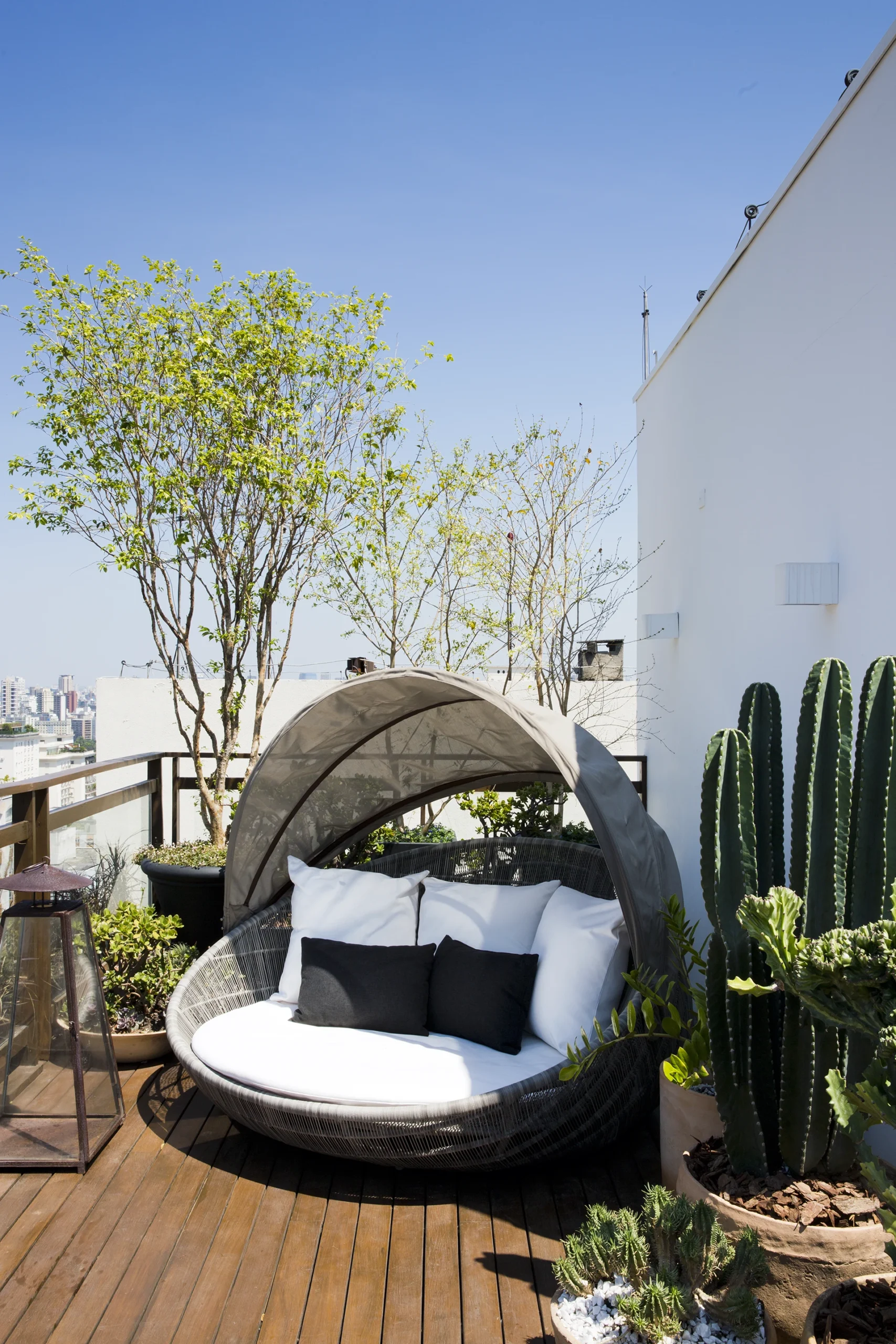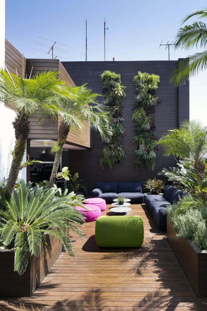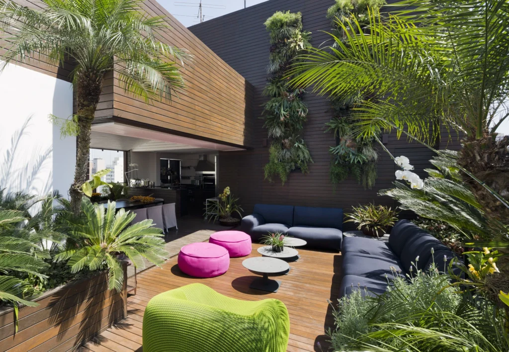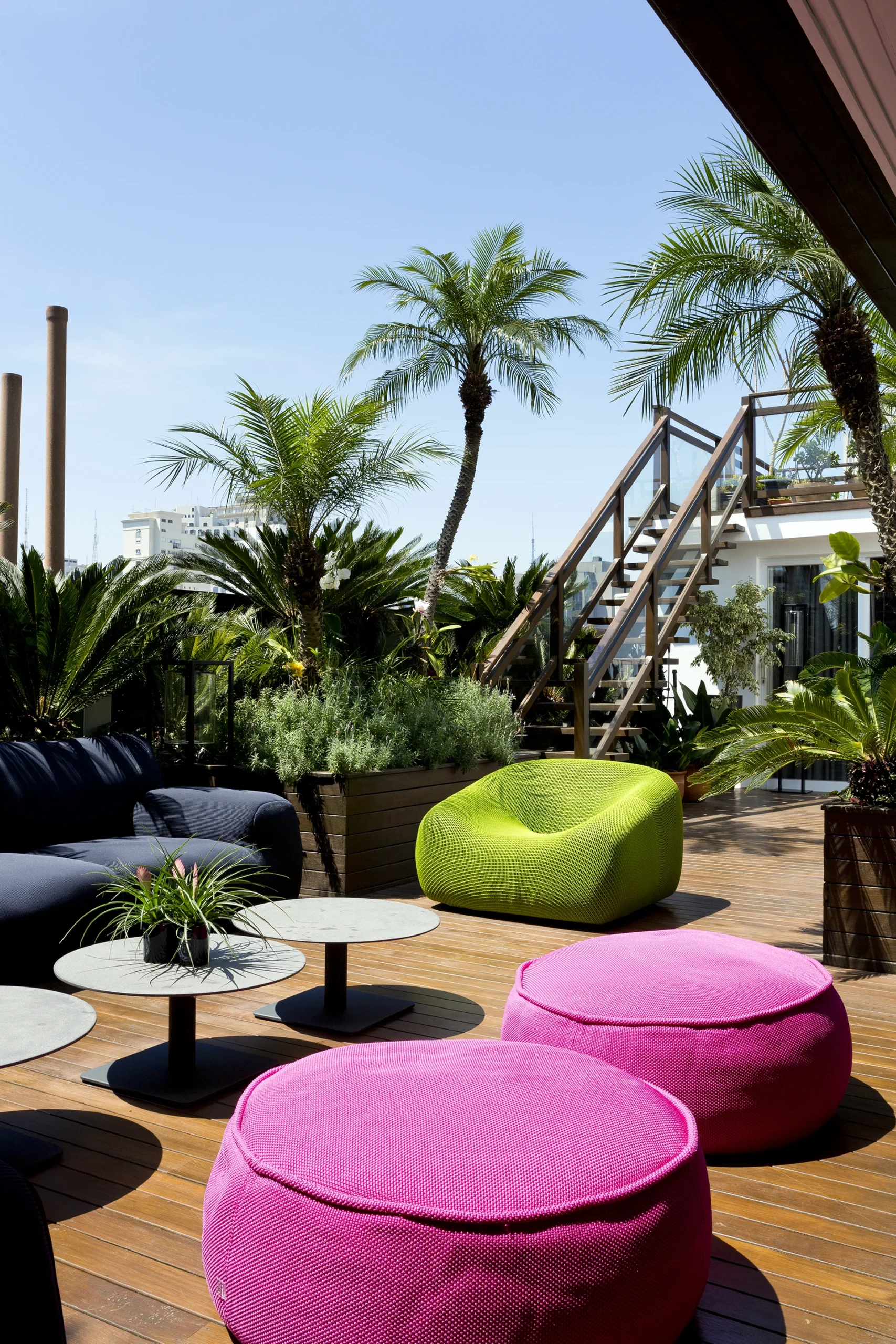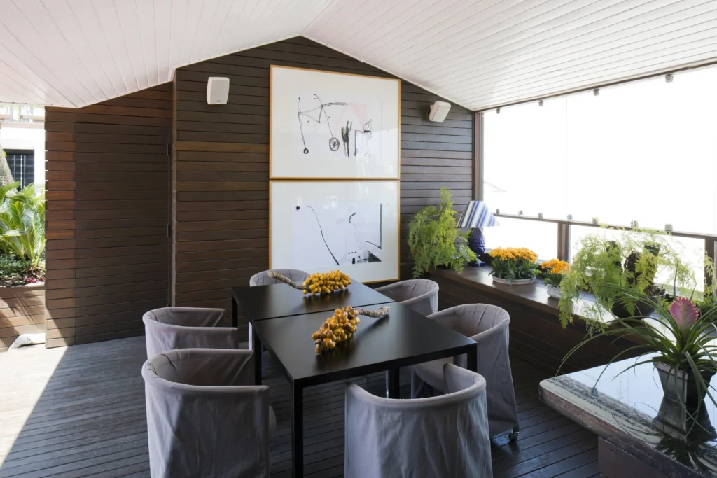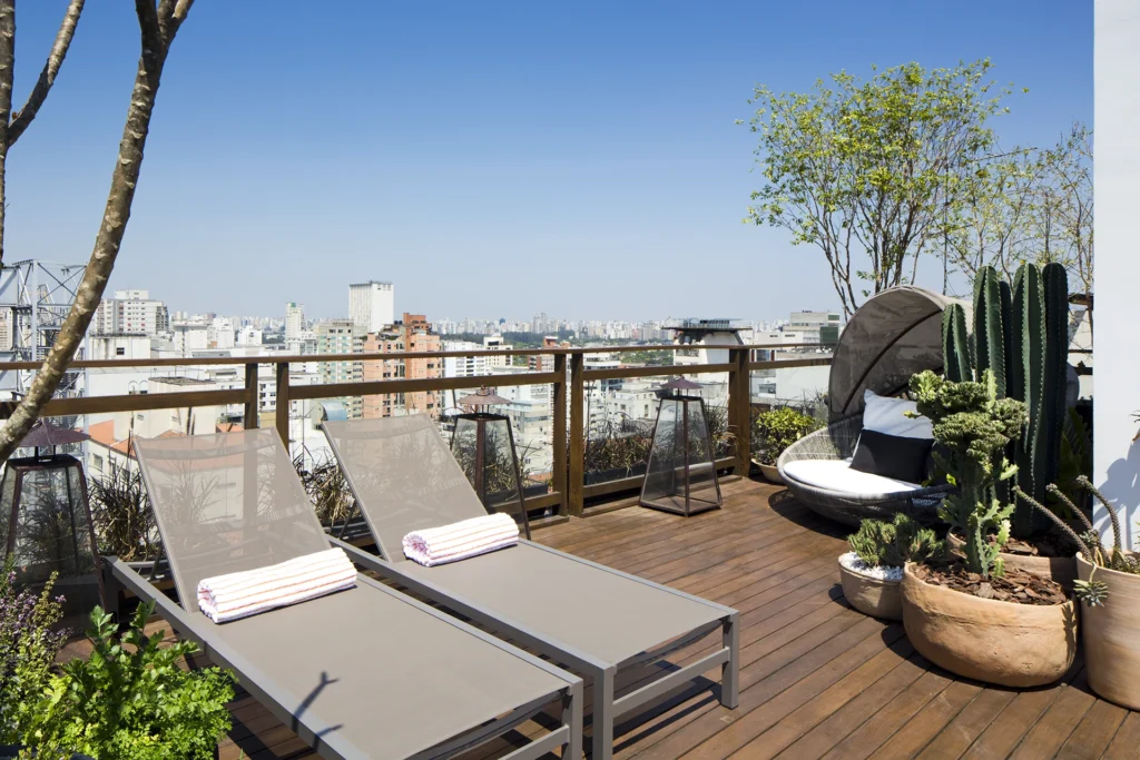 Na cobertura, o projeto se abre para o exterior e assume um caráter mais descontraído. Sofás e pufes da italiana Paola Lenti trazem conforto e acolhimento ao espaço ao ar livre, criando um ambiente convidativo para o descanso e a convivência. A combinação entre design, materiais próprios para áreas externas e a relação com o céu e a cidade transforma a cobertura em uma extensão natural do morar.