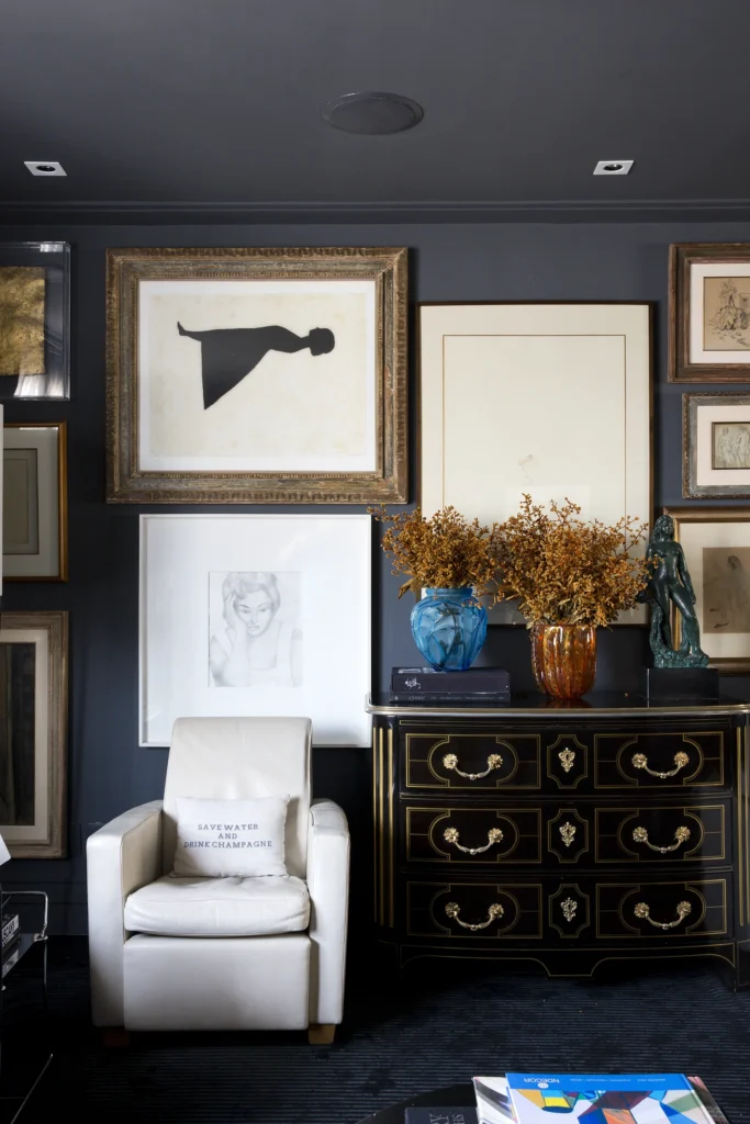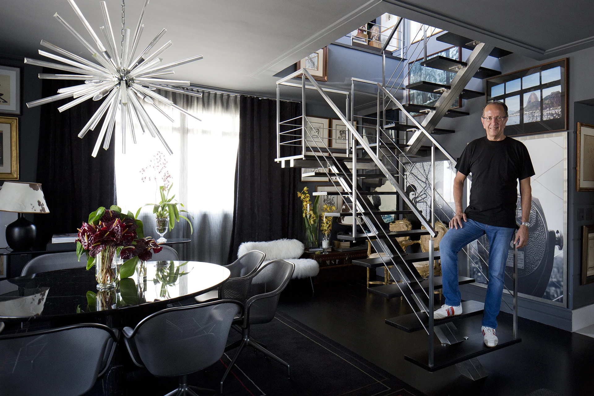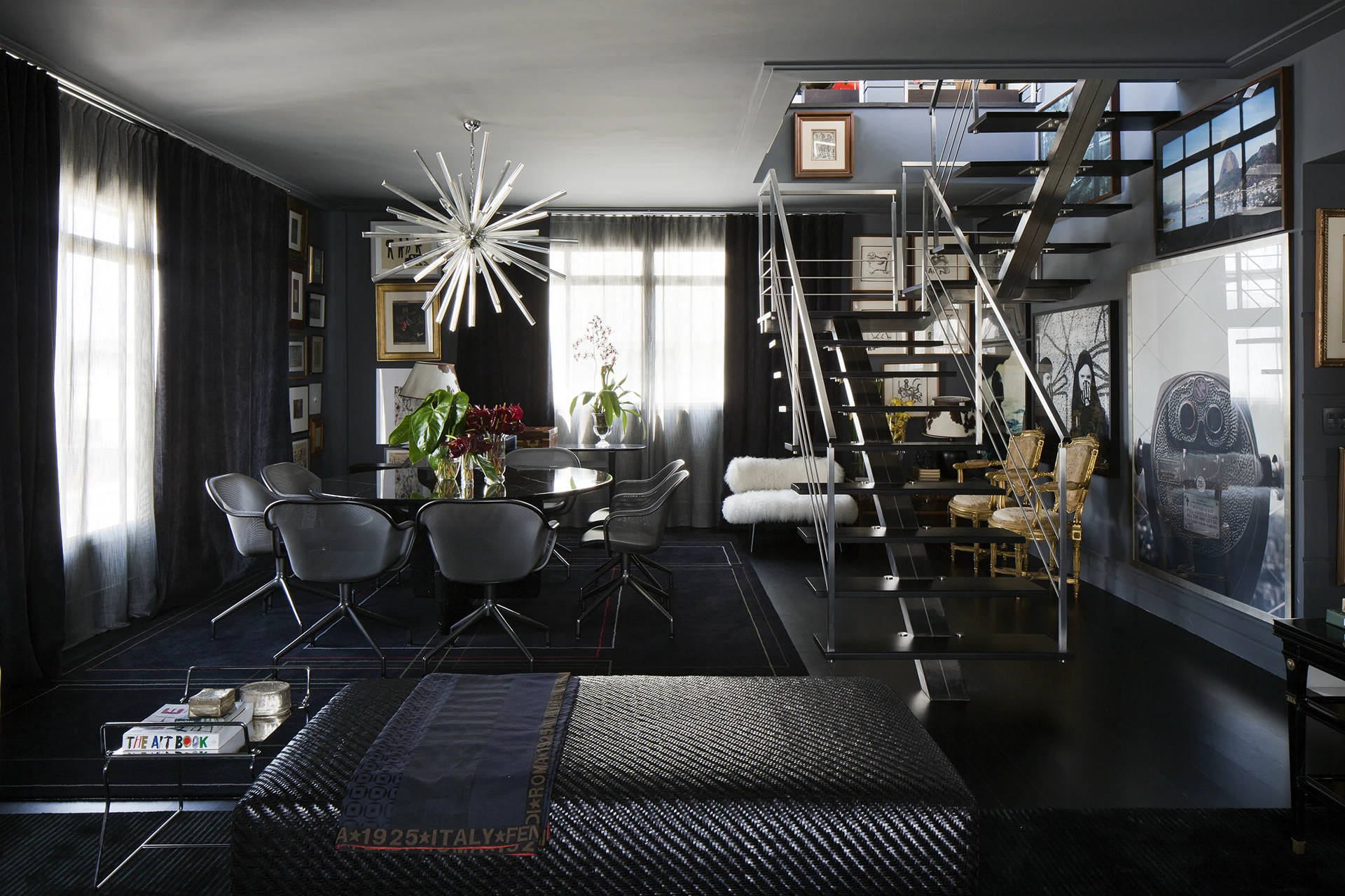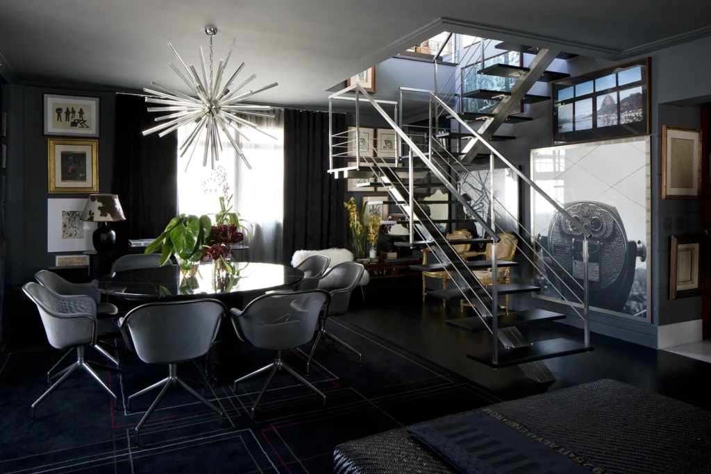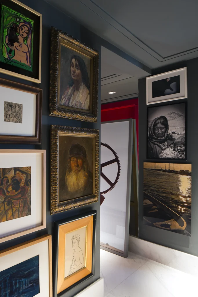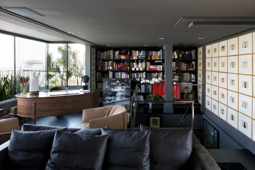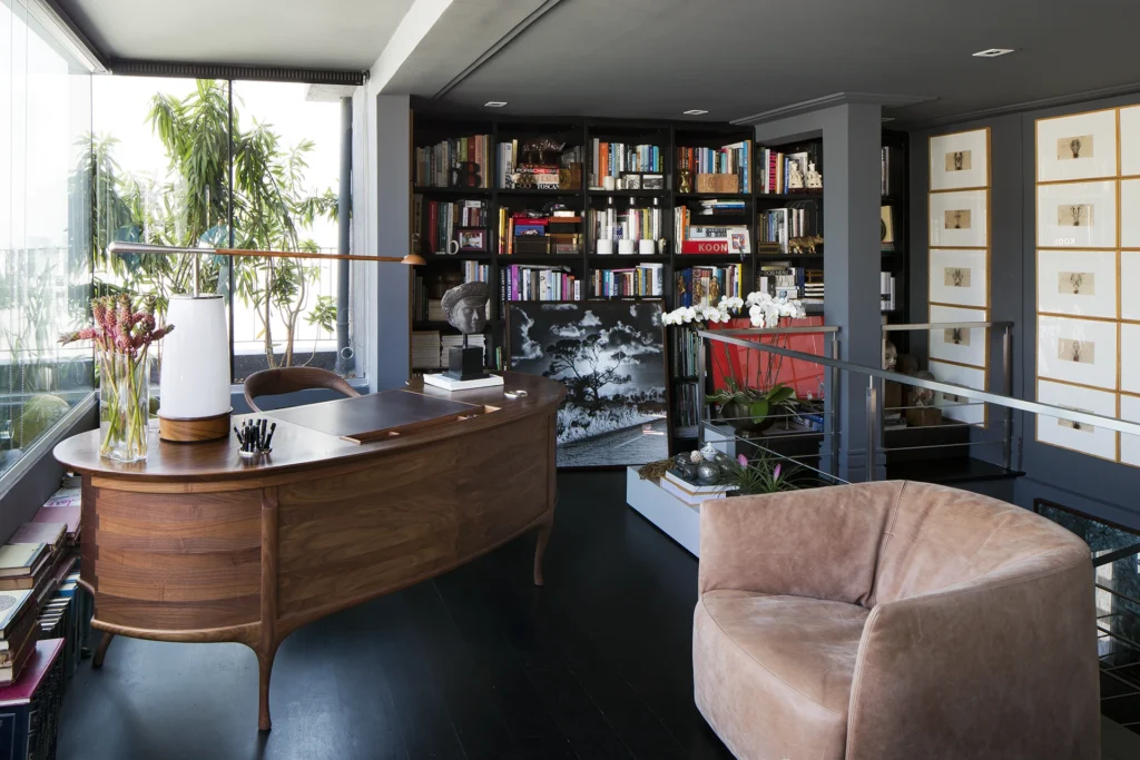 Na área interna, a paleta é predominantemente preta, conferindo profundidade e sofisticação aos ambientes. Longe de torná-los escuros, as obras de arte assumem papel fundamental ao iluminar e dinamizar os espaços, criando contrastes visuais que quebram a sobriedade e reforçam a personalidade do projeto. A arte, aqui, não é coadjuvante: ela estrutura o olhar, estabelece ritmos e transforma a neutralidade em expressão.