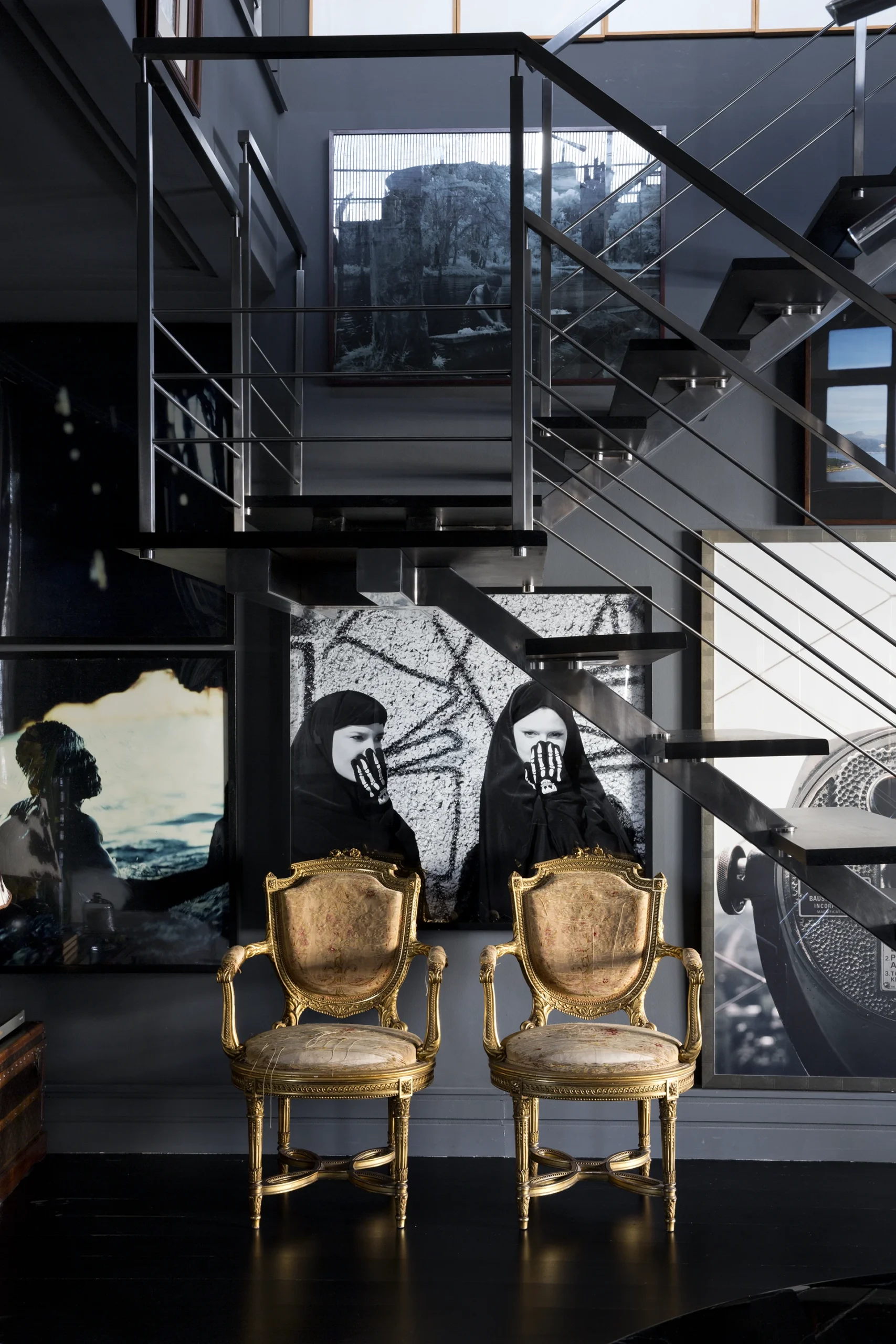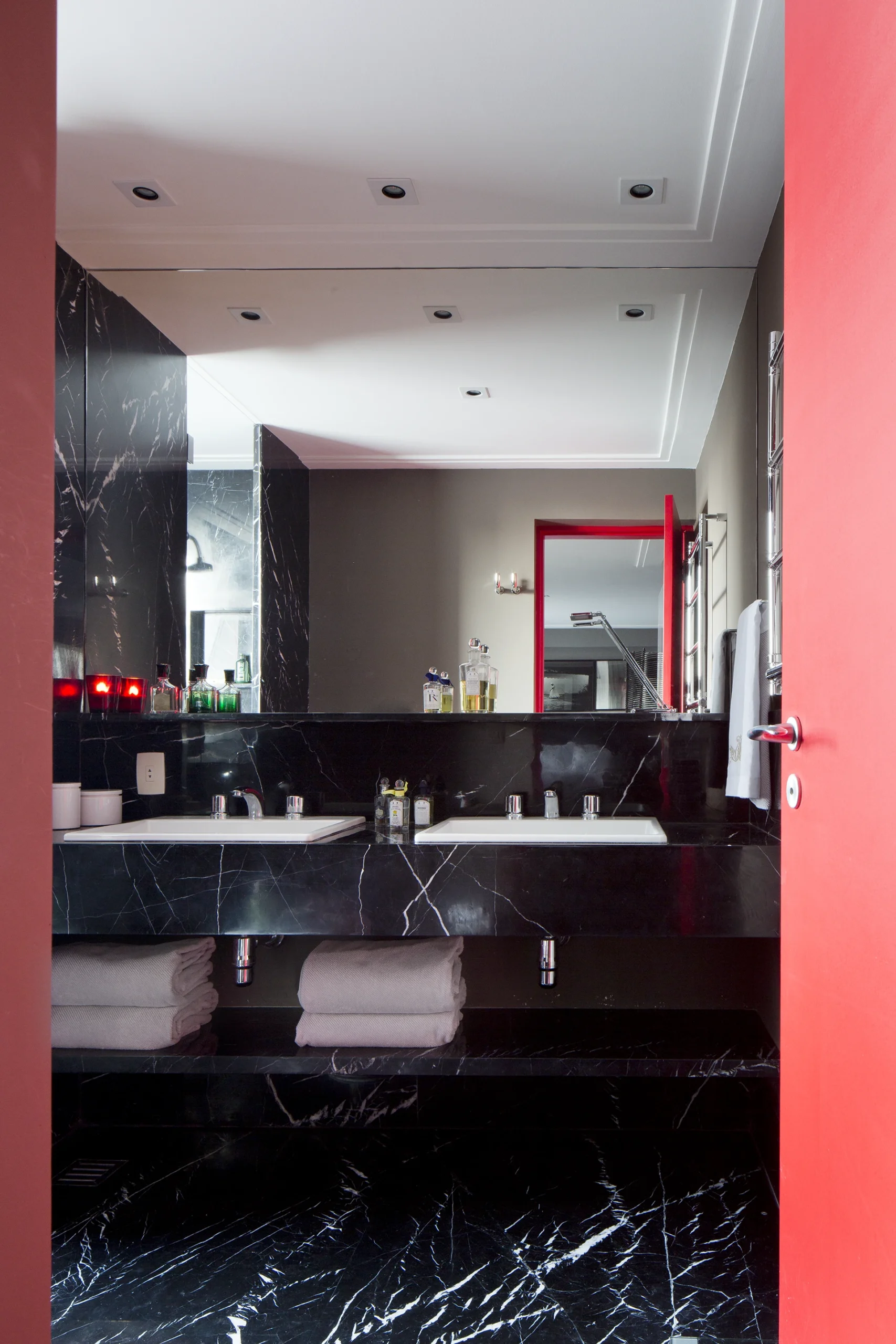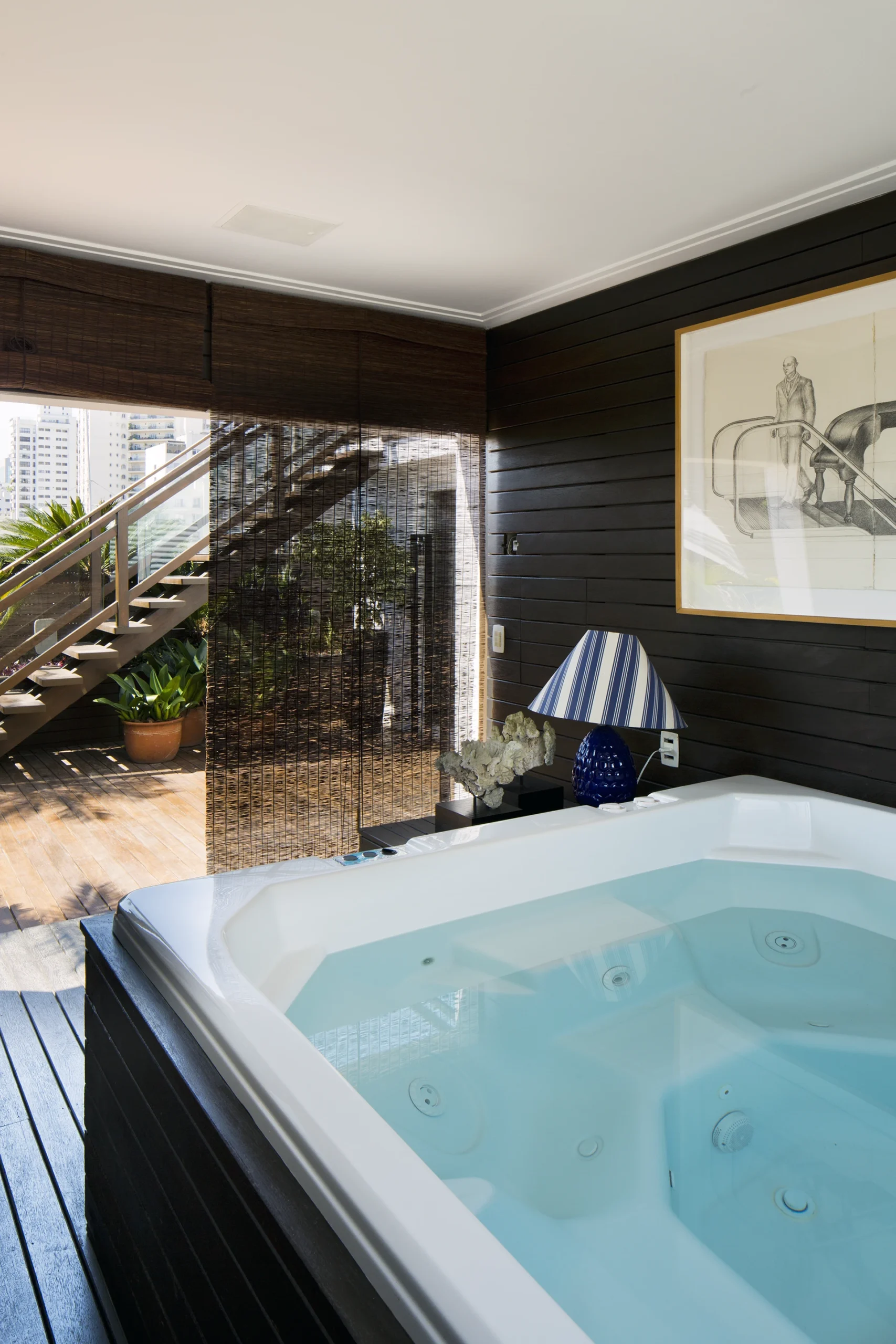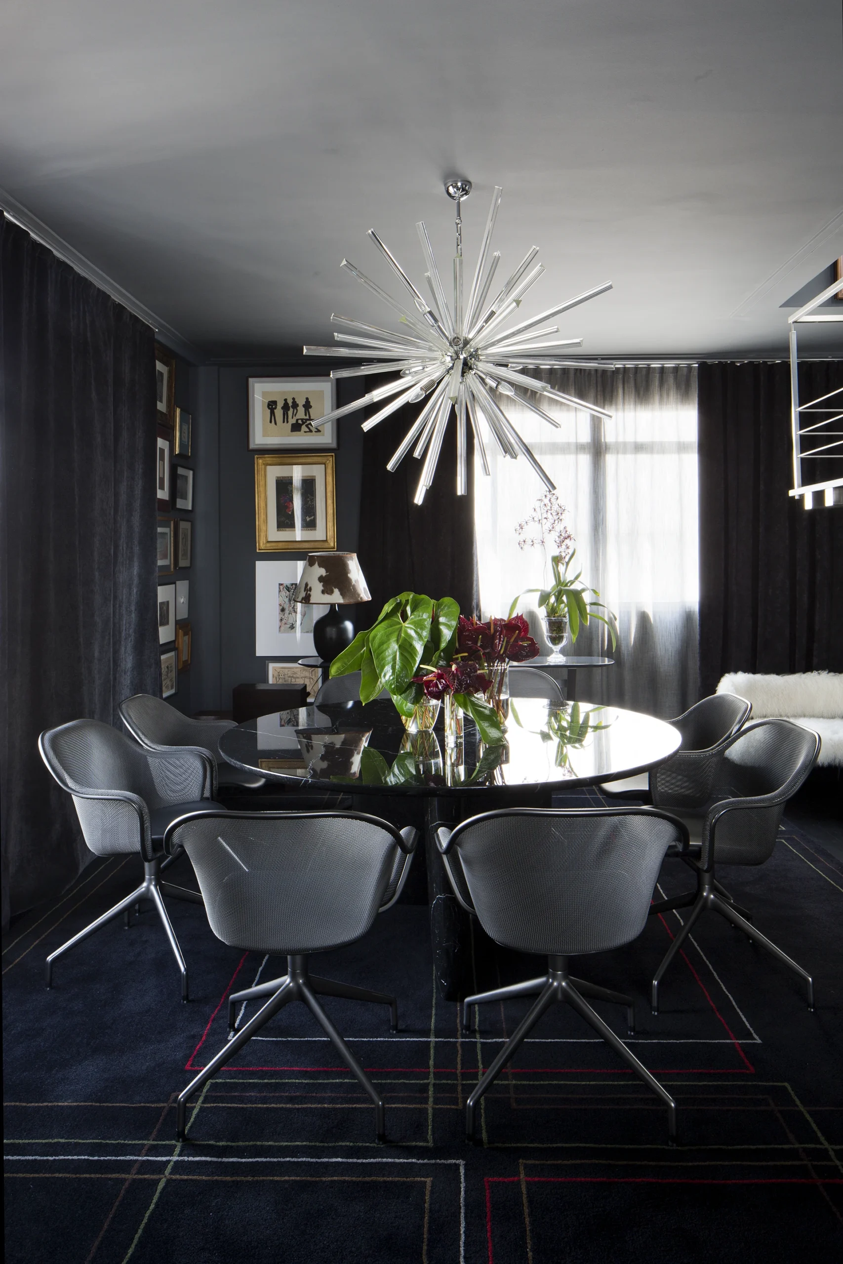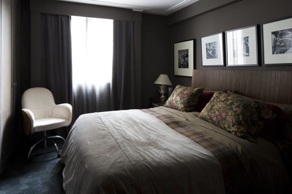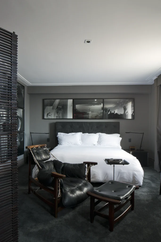 Na área interna, a paleta é predominantemente preta, conferindo profundidade e sofisticação aos ambientes. Longe de torná-los escuros, as obras de arte assumem papel fundamental ao iluminar e dinamizar os espaços, criando contrastes visuais que quebram a sobriedade e reforçam a personalidade do projeto. A arte, aqui, não é coadjuvante: ela estrutura o olhar, estabelece ritmos e transforma a neutralidade em expressão.