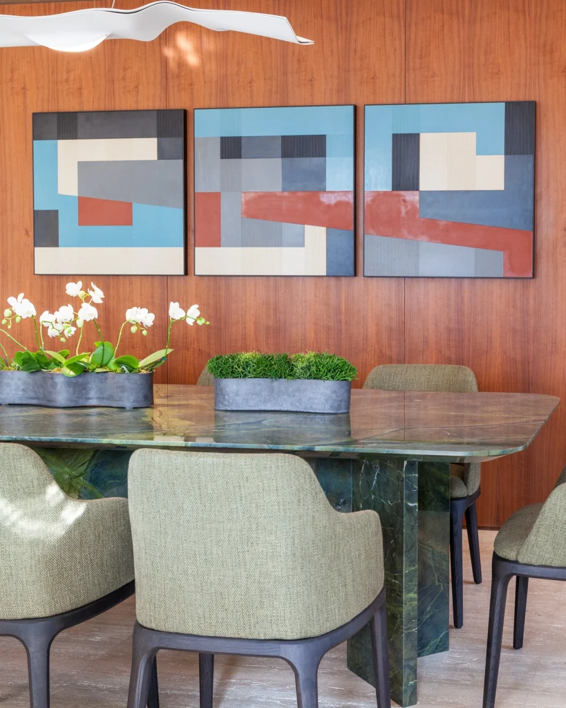 Entre os destaques está a mesa de jantar com tampo de mármore verde em peça única, que traz imponência e caráter singular ao espaço.
