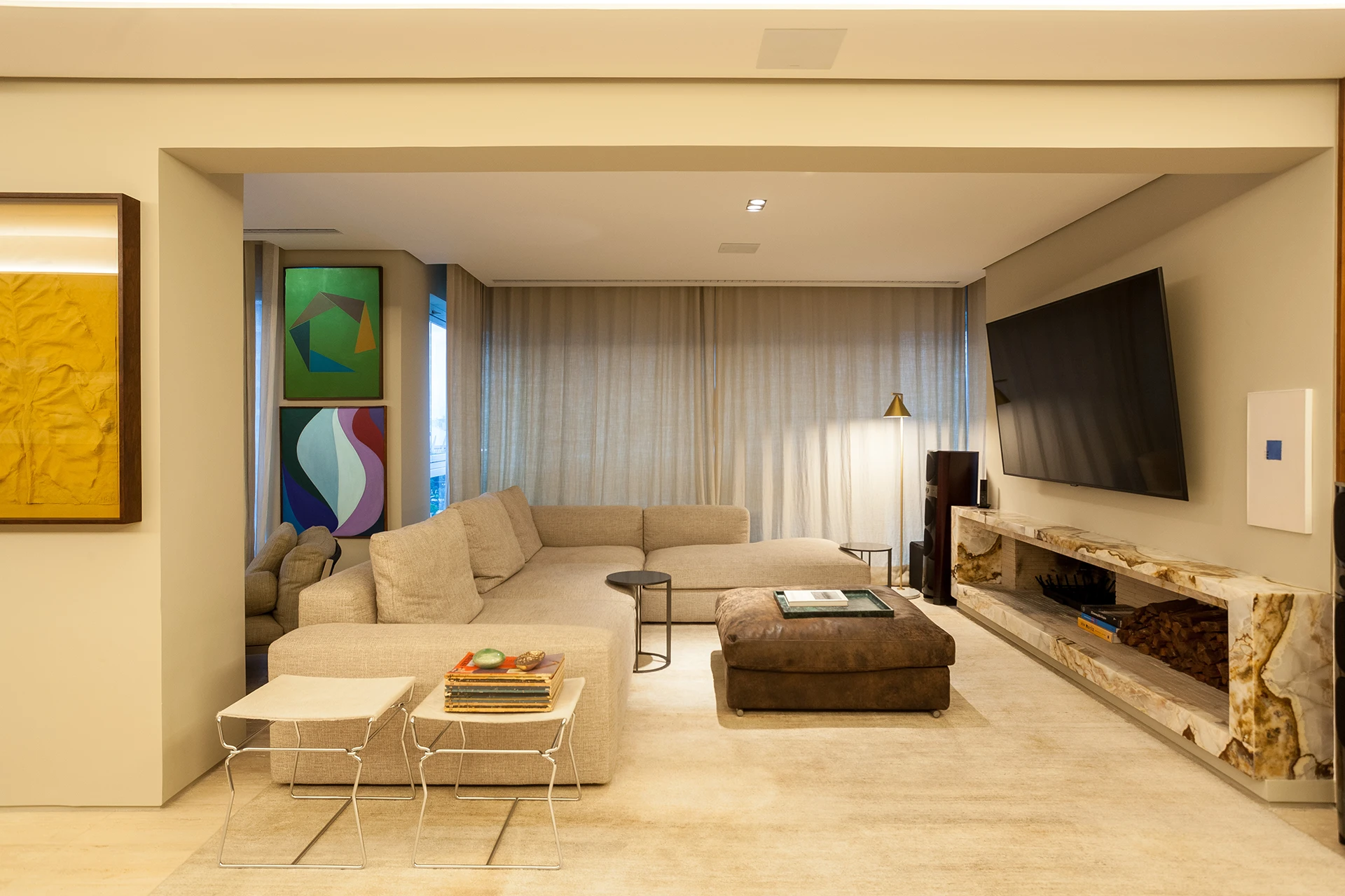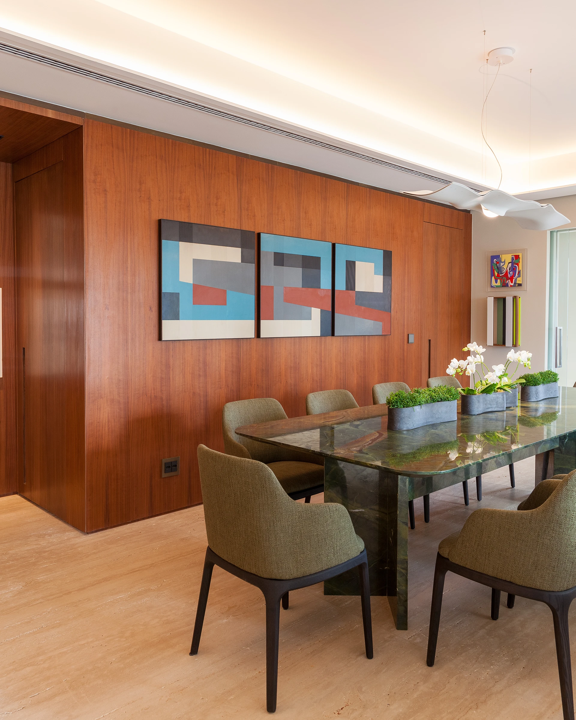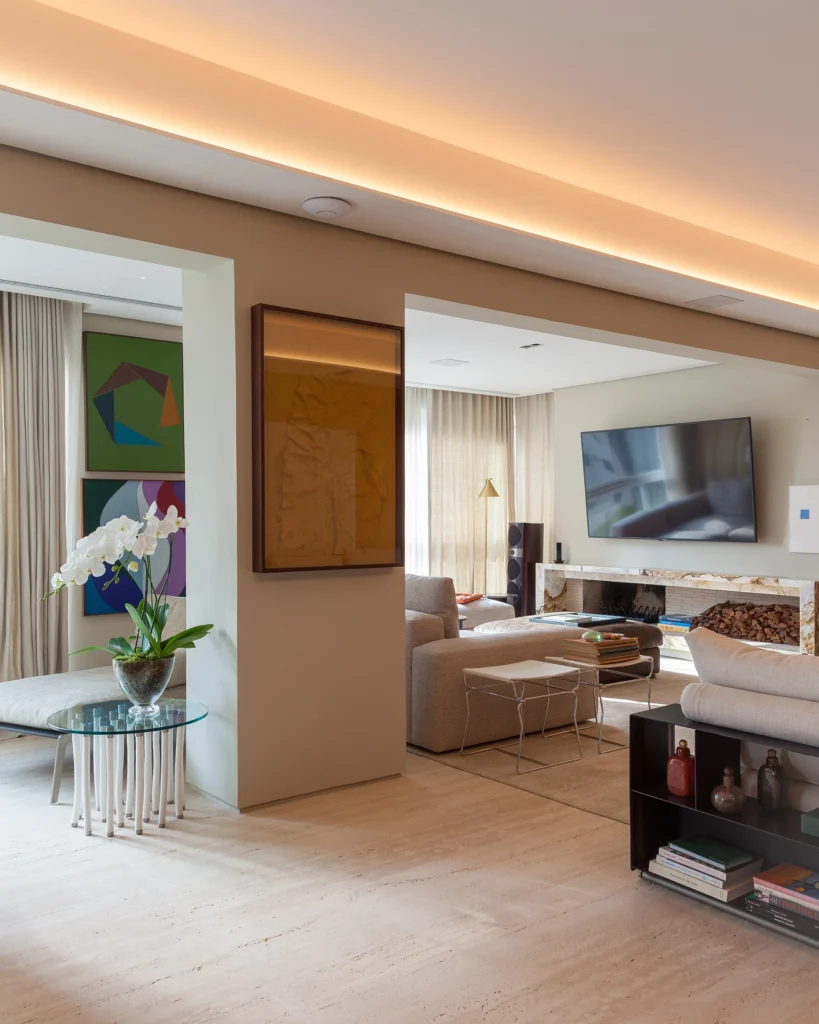 O projeto valoriza materiais naturais e superfícies contínuas: o piso em mármore percorre os principais ambientes, enquanto um grande painel de madeira abraça a sala de estar e jantar, desdobrando-se no painel camarão que garante privacidade ao office quando necessário. Nas áreas íntimas, papéis de parede e tecidos reforçam o conforto visual.