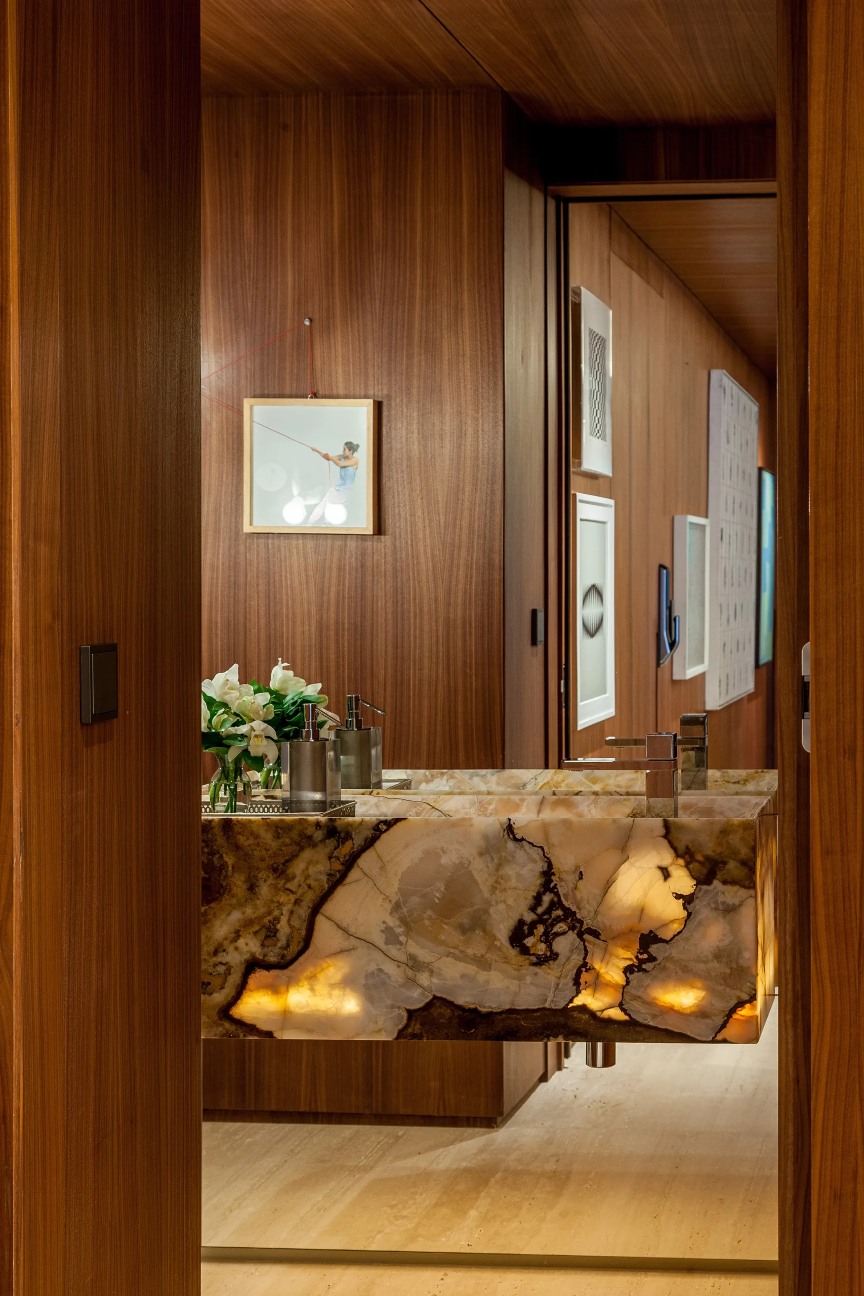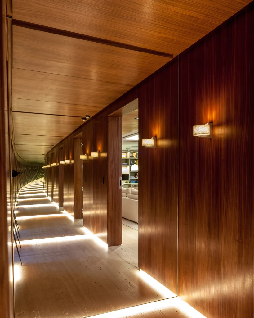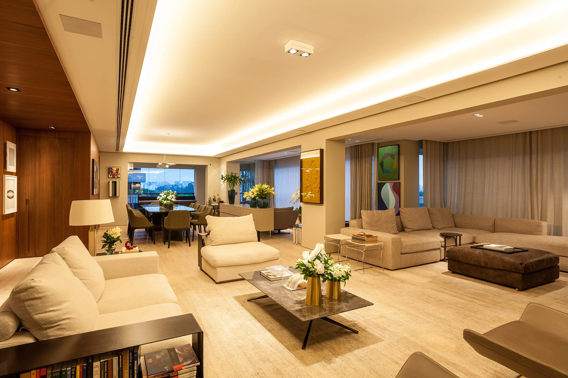 O projeto valoriza materiais naturais e superfícies contínuas: o piso em mármore percorre os principais ambientes, enquanto um grande painel de madeira abraça a sala de estar e jantar, desdobrando-se no painel camarão que garante privacidade ao office quando necessário. Nas áreas íntimas, papéis de parede e tecidos reforçam o conforto visual.