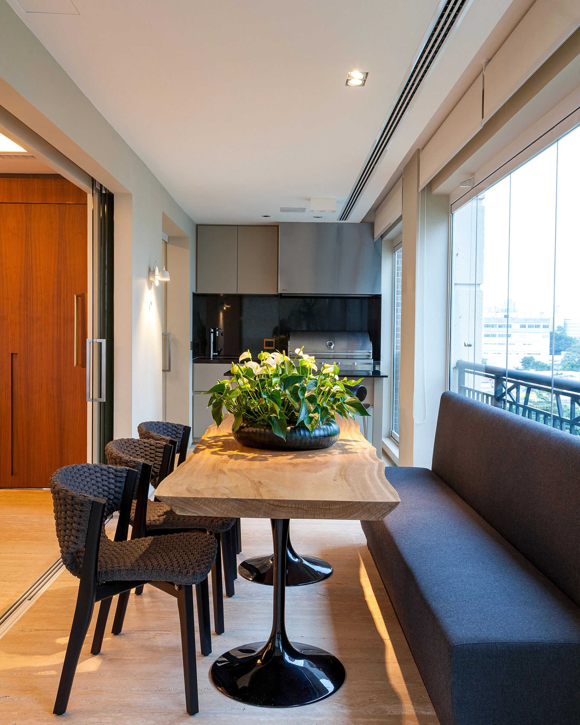 A reforma atualizou o imóvel por completo, incluindo a troca de toda a parte elétrica para receber o sistema de automação. Um dos dormitórios foi convertido em office, e os peitoris das janelas da sala foram removidos para criar vãos piso-teto que inundam o ambiente de luz natural. A varanda, que contorna o jantar e se conecta ao estar, tornou-se uma extensão essencial da área social.