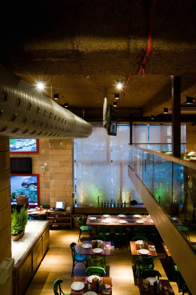 Implantado em um dos centros comerciais mais tradicionais de Salvador, o projeto foi concebido para criar uma identidade arquitetônica própria dentro do ambiente do shopping. Um dos elementos marcantes do espaço é o mezanino, que amplia a capacidade do restaurante e contribui para a leitura vertical do ambiente, reforçando a sensação de amplitude e integração visual entre os diferentes níveis.