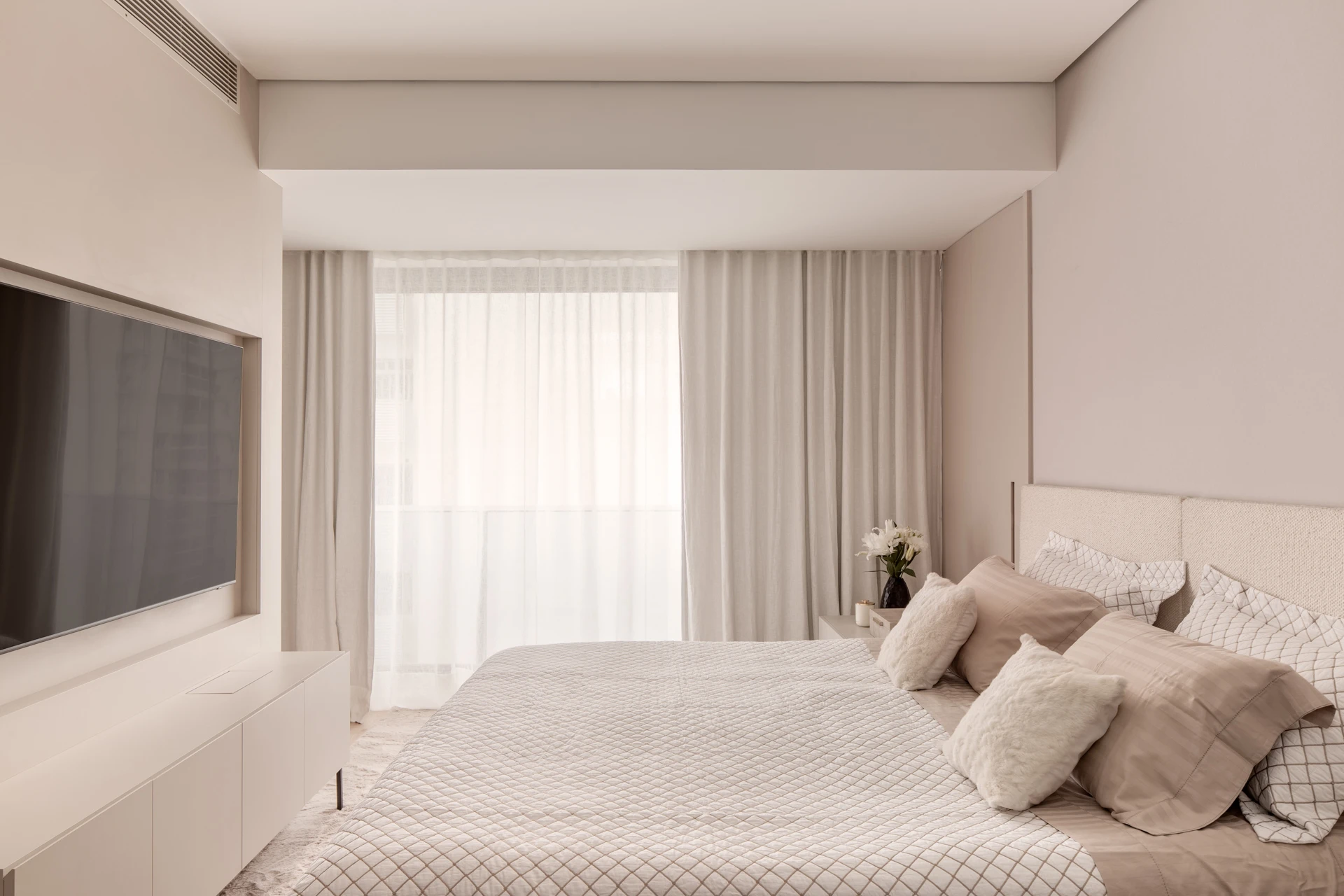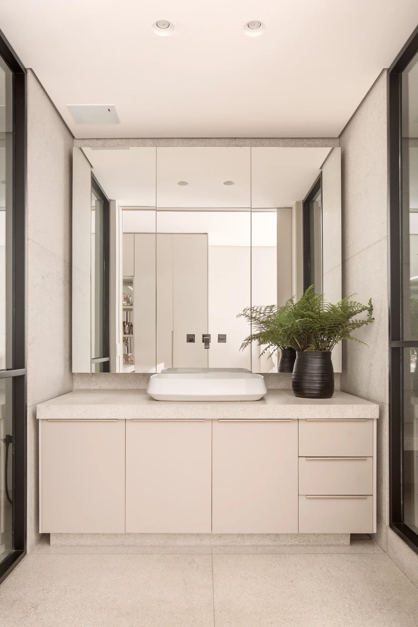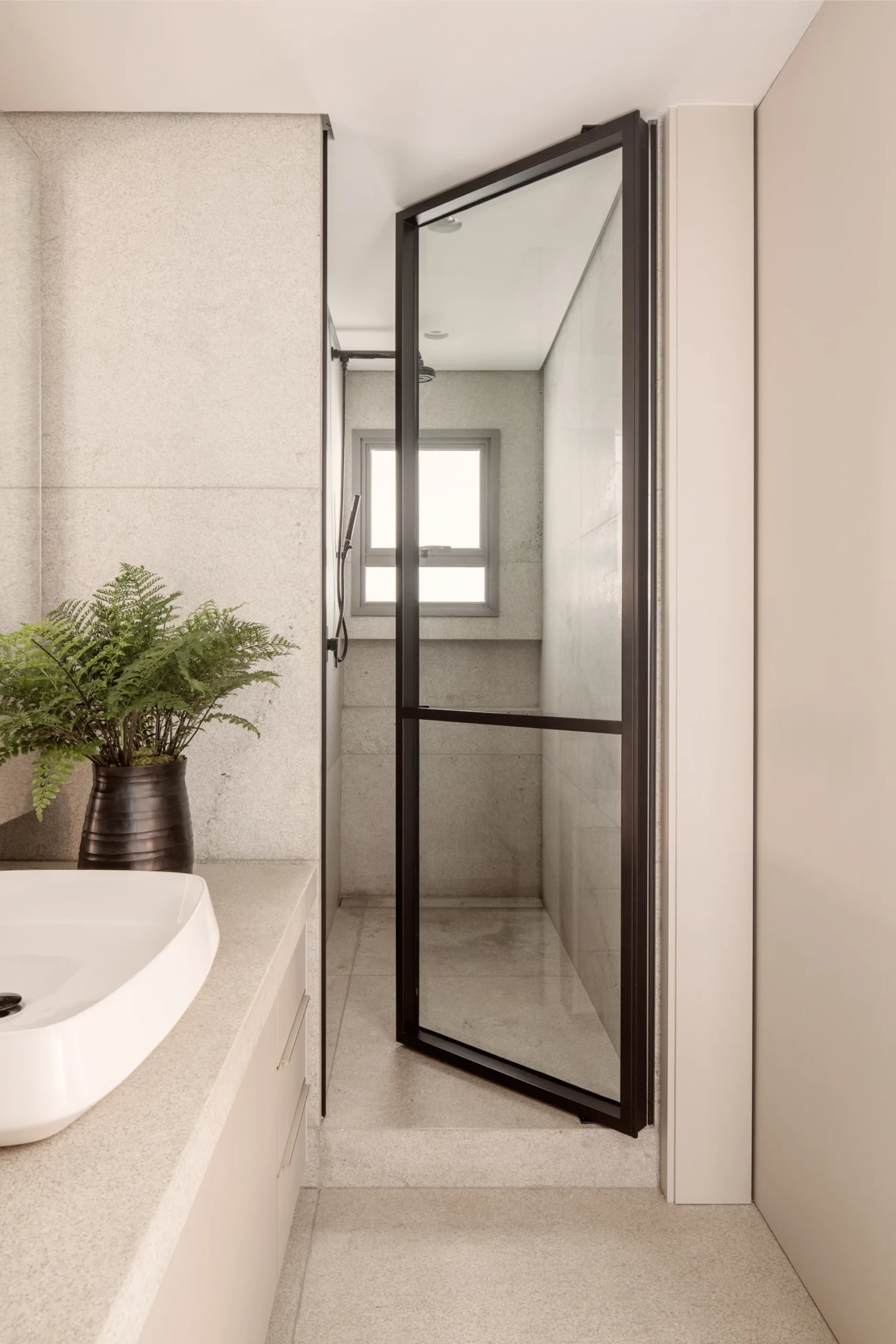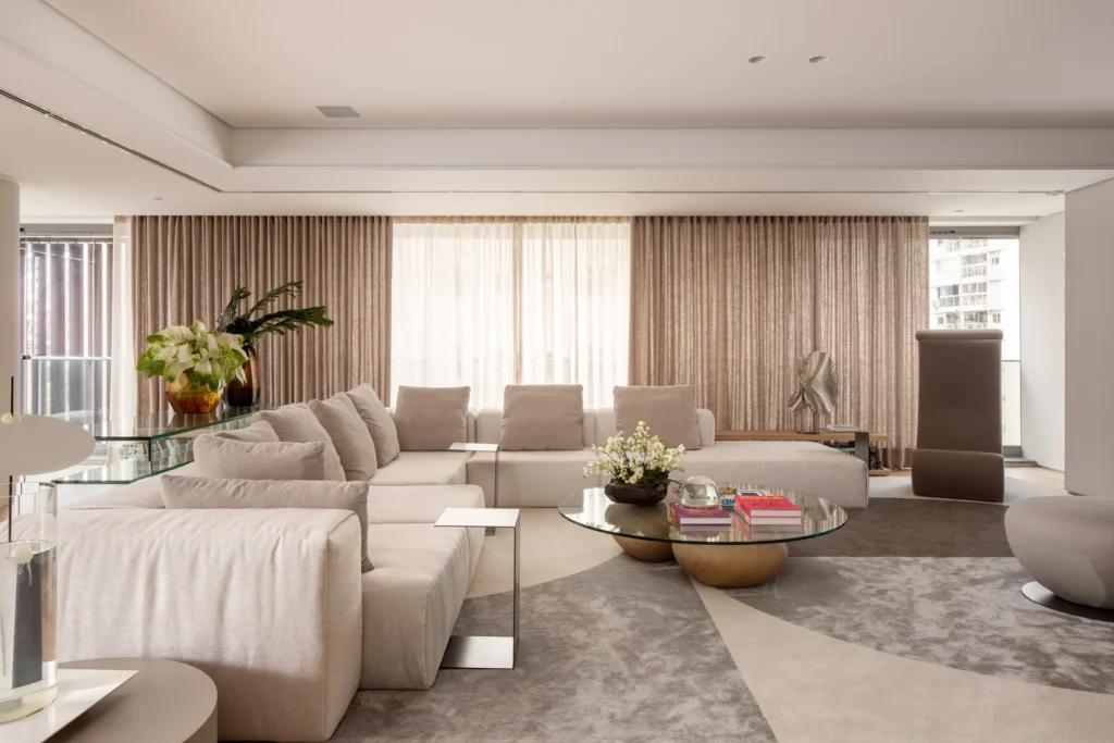 O conceito do projeto de arquitetura do apartamento de Carol Magalhães se apoia em uma estética moderna, leve e atemporal, com destaque para a integração dos espaços e para a valorização da vista. A paleta de cores adotada privilegia tons neutros e claros, especialmente nuances de cinza, transmitindo leveza e elegância. Em contraste, a suíte do filho apresenta uma cartela cromática mais fechada, reforçando identidade e personalidade.