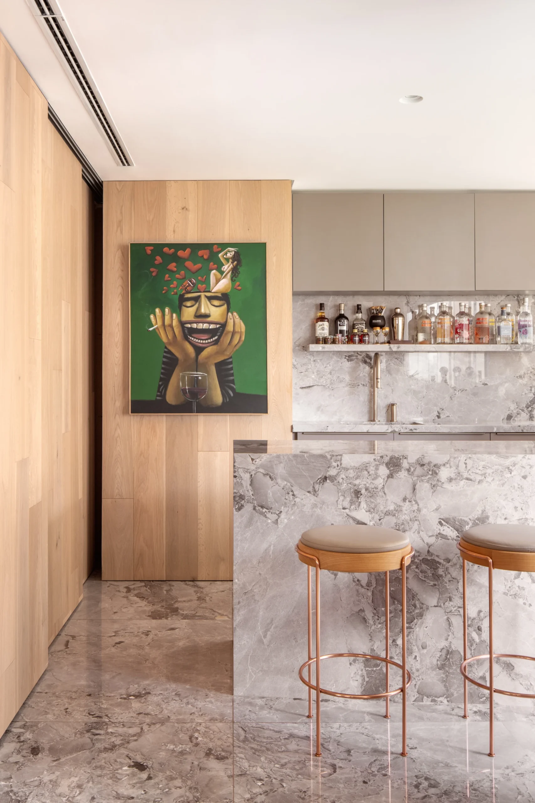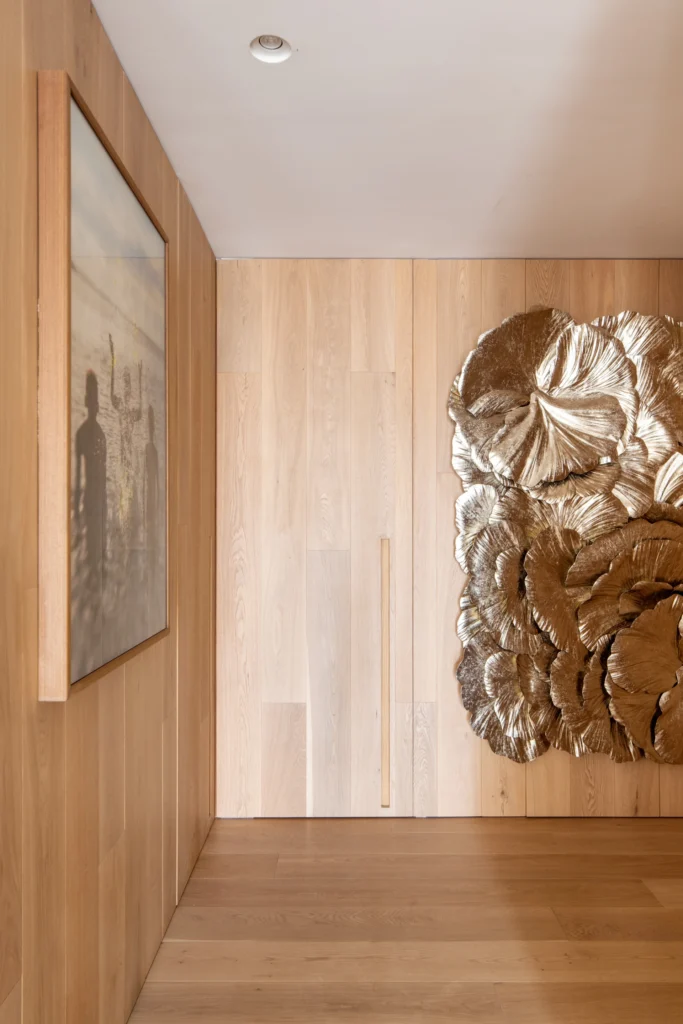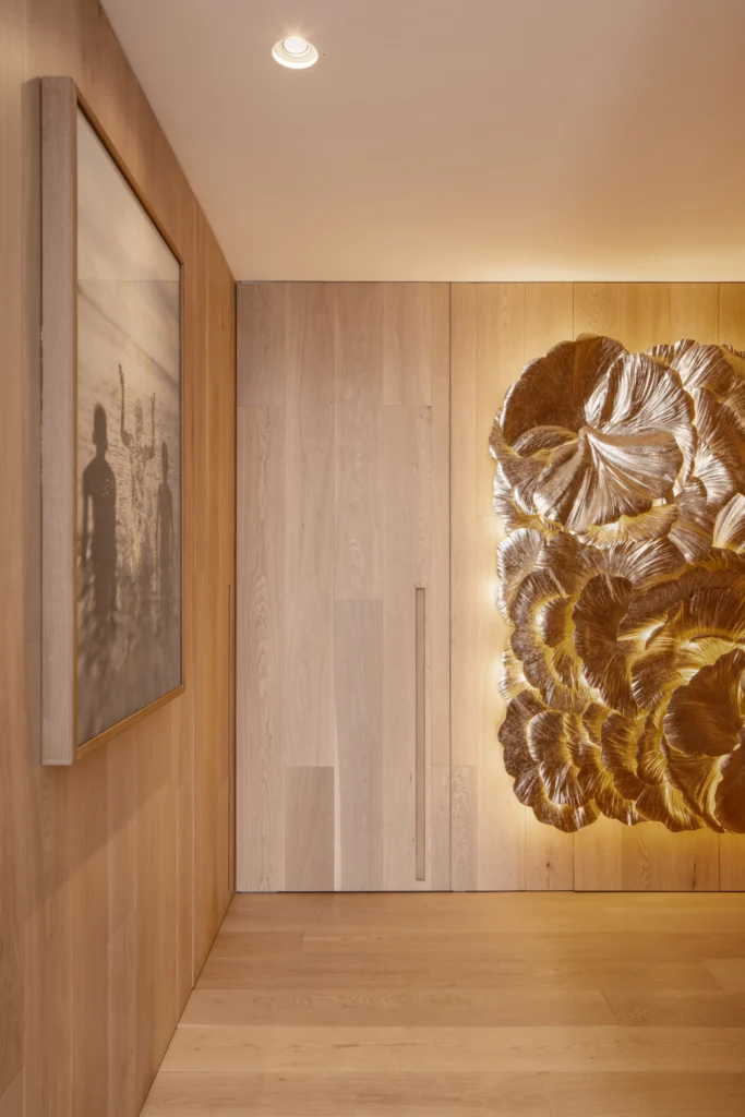 Entre os destaques do apartamento está o hall de entrada, onde a escultura de parede Scatto Lampadario recebe os visitantes, e o lavabo, concebido como um ambiente poético, com papel de parede da Quaker e cuba esculpida em quartzito Rosso Fiorentino polido.