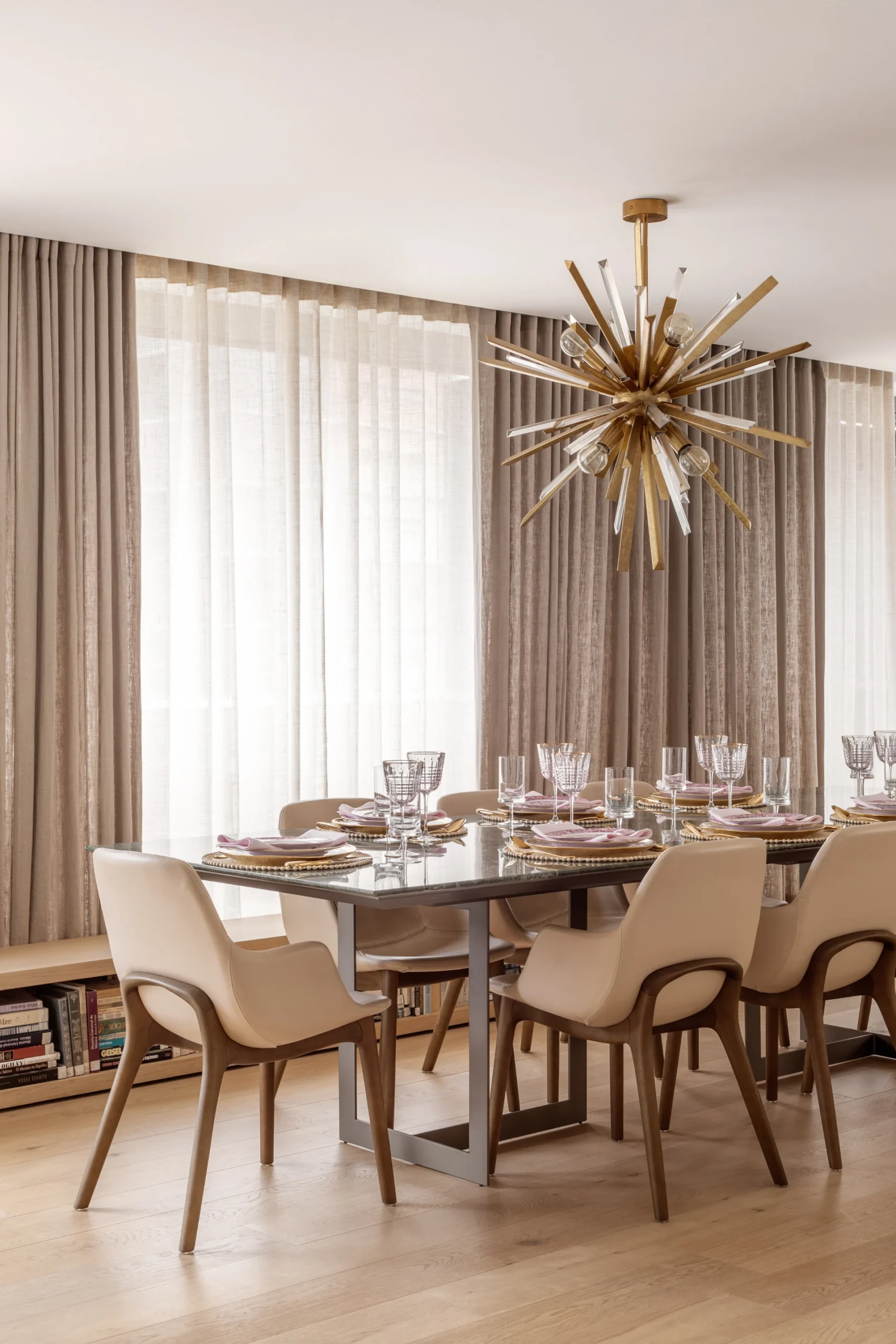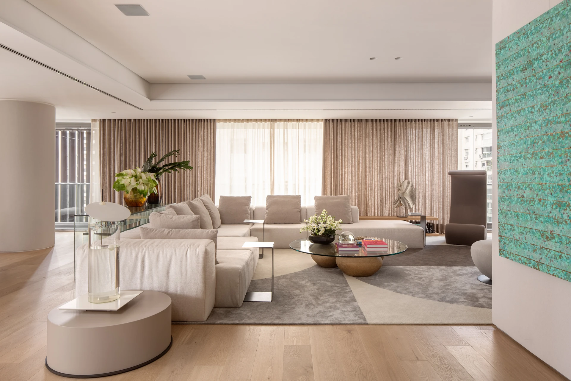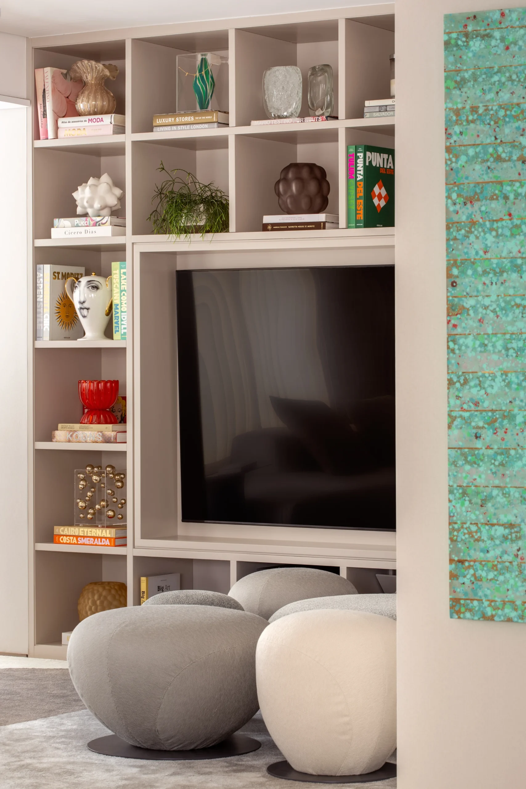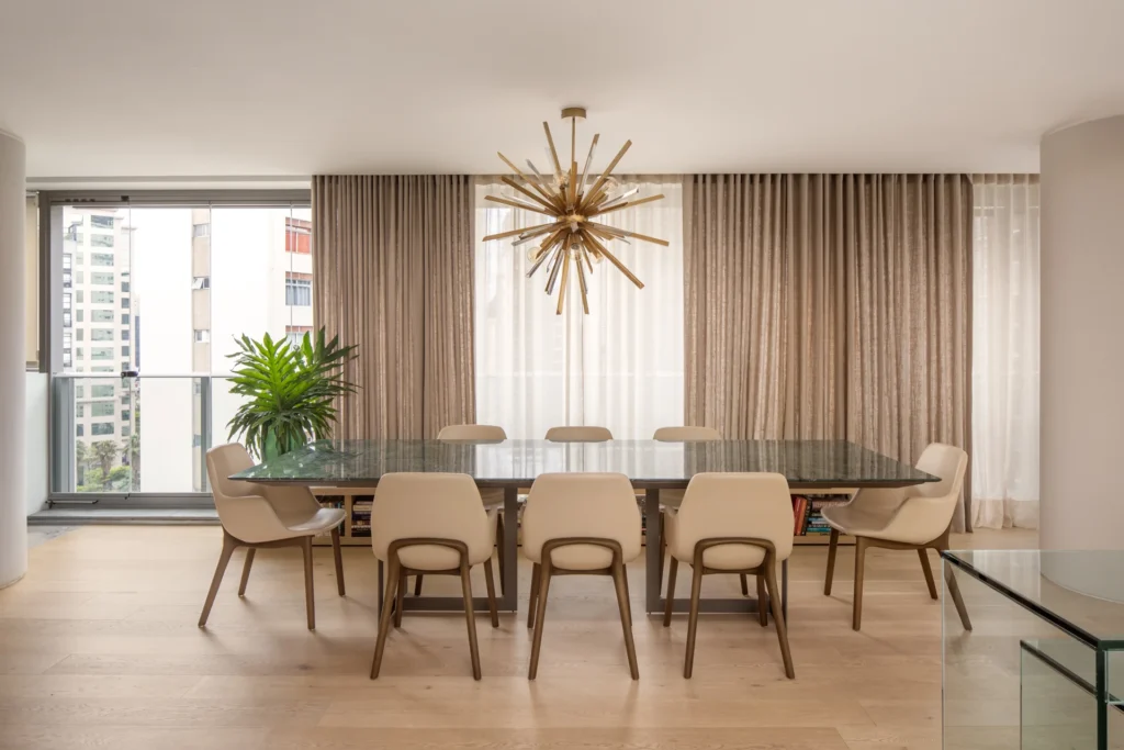 O mobiliário foi escolhido a partir de uma curadoria que acompanha a base clara do apartamento, com tecidos leves e poucos pontos de destaque. Na sala de jantar, a mesa da Breton em mármore Verde Guatemala se torna protagonista do espaço, adicionando cor e personalidade. As obras de arte do acervo pessoal de Carol Magalhães complementam a narrativa do projeto e reforçam seu caráter autoral.