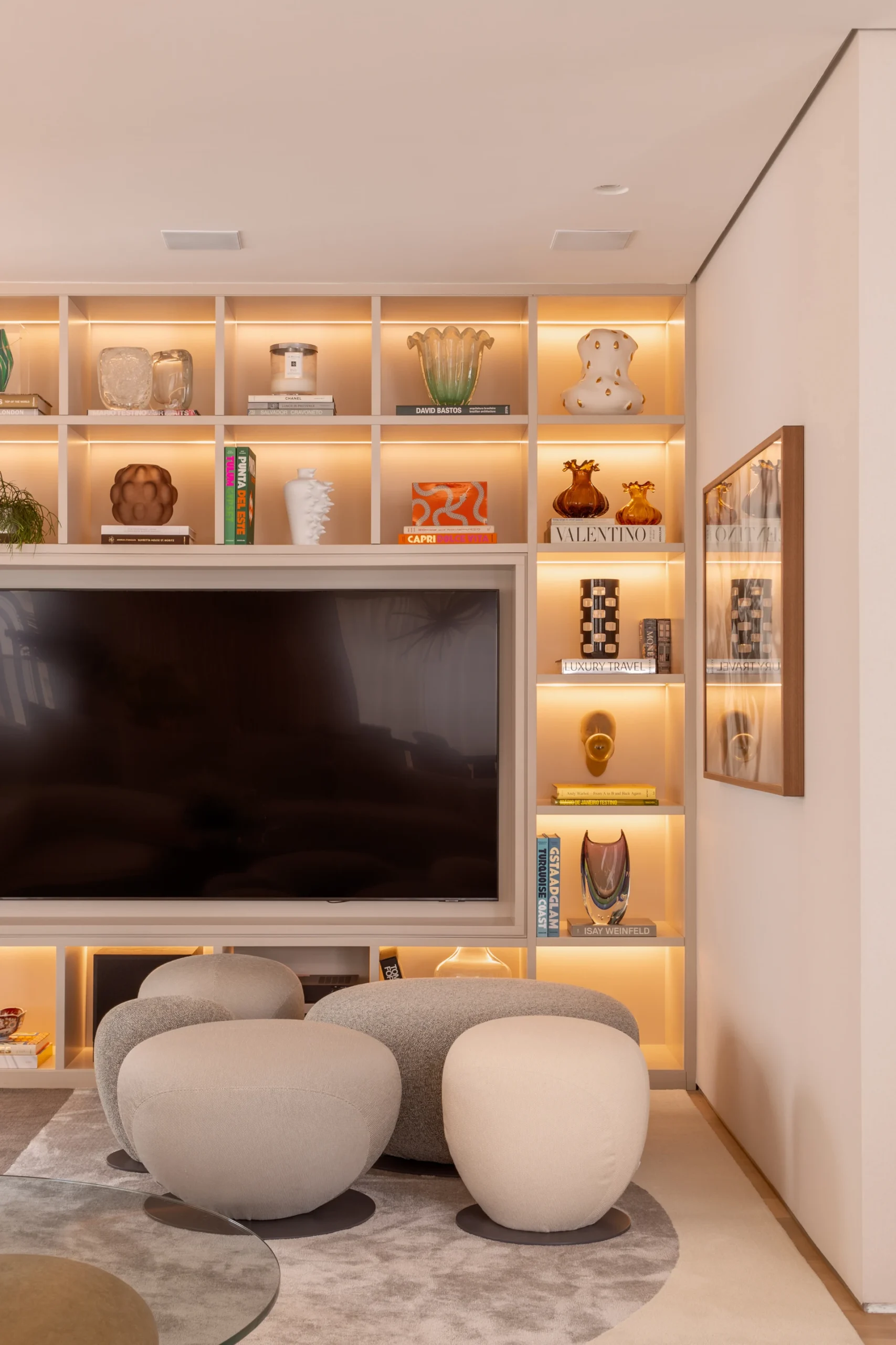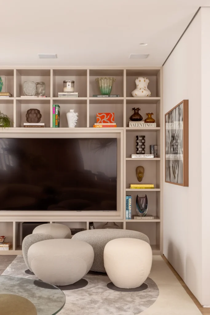 Com decoração de estilo contemporâneo, o projeto de arquitetura e interiores do apartamento de Carol Magalhães foi desenvolvido e executado ao longo de um ano e três meses. O maior desafio esteve nas soluções estruturais, que exigiram adaptações técnicas cuidadosas, sempre preservando o equilíbrio entre funcionalidade, estética e identidade — marcas do trabalho de David Bastos.