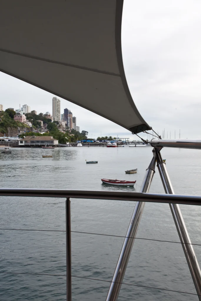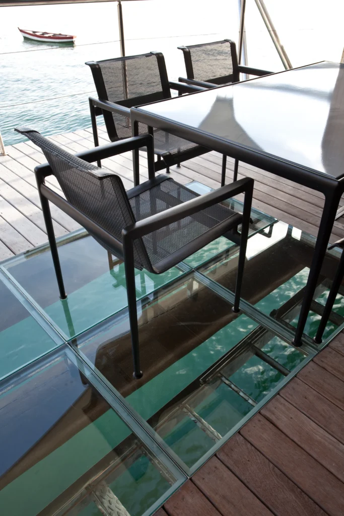 No terraço, a arquitetura surpreende com uma solução inusitada: um rasgo de vidro no piso, etéreo e transparente, que estabelece uma conexão direta e poética com o mar, transformando a varanda em um verdadeiro píer suspenso sobre a paisagem.