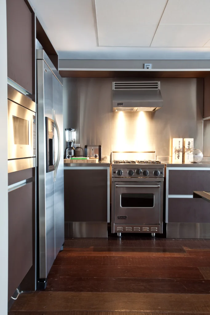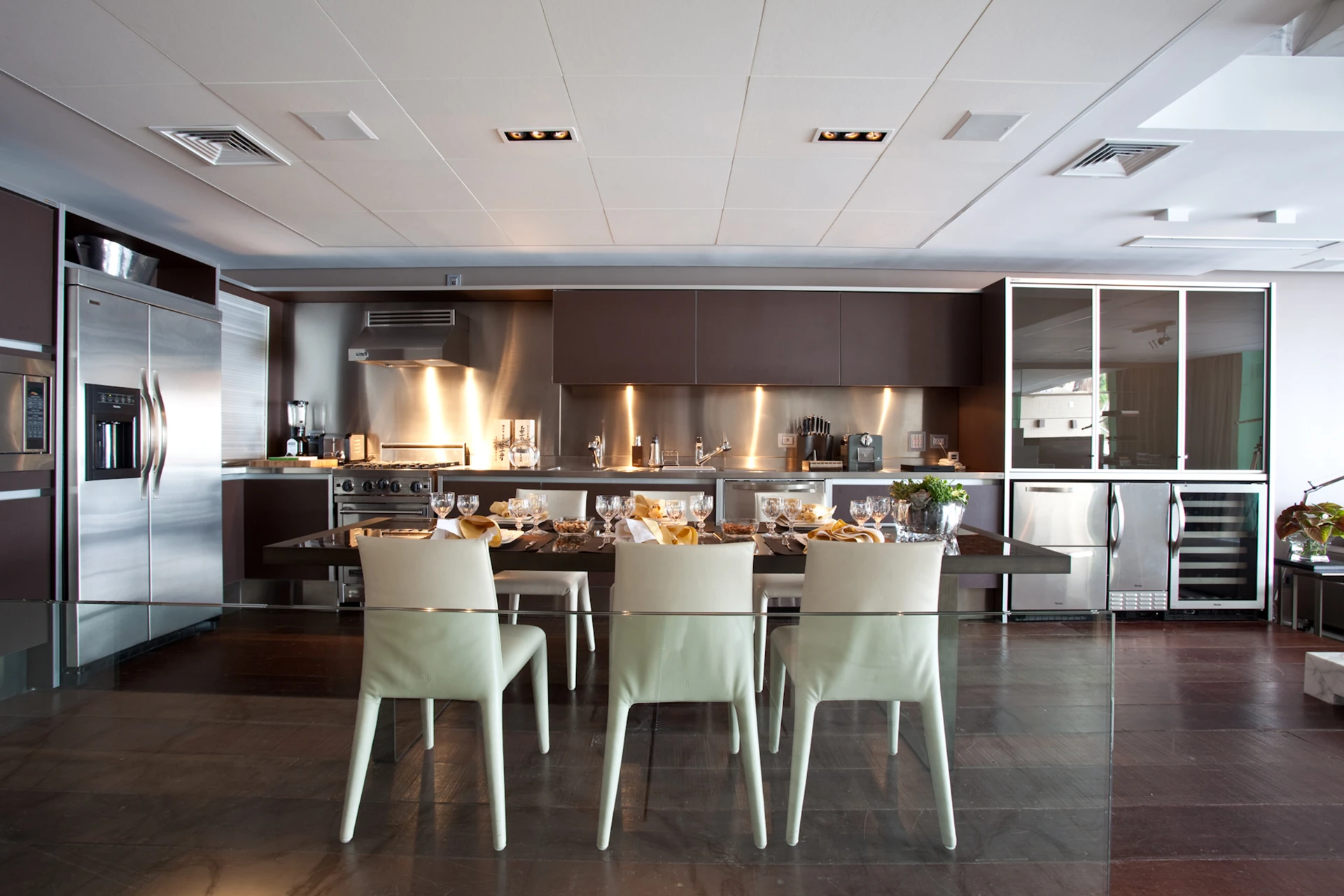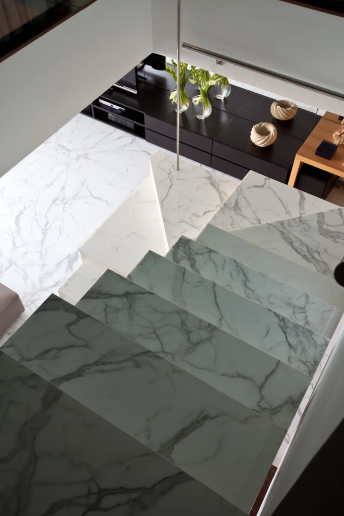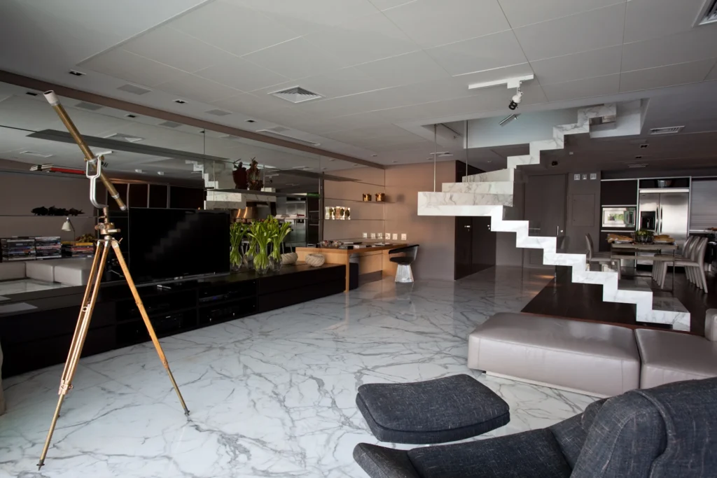 Protagonista da área social, a escada de mármore Calacatta impõe sua presença escultórica. Um projeto de iluminação cuidadosamente desenhado realça sua volumetria e evidencia o desenho dos degraus, que, no pavimento inferior, culminam em um tablado de madeira de demolição. Esse piso elevado marca a transição para a cozinha integrada, conectada de forma fluida aos demais ambientes. A ausência de paredes amplia a sensação de espaço e permite que a luz natural percorra livremente todo o pavimento.