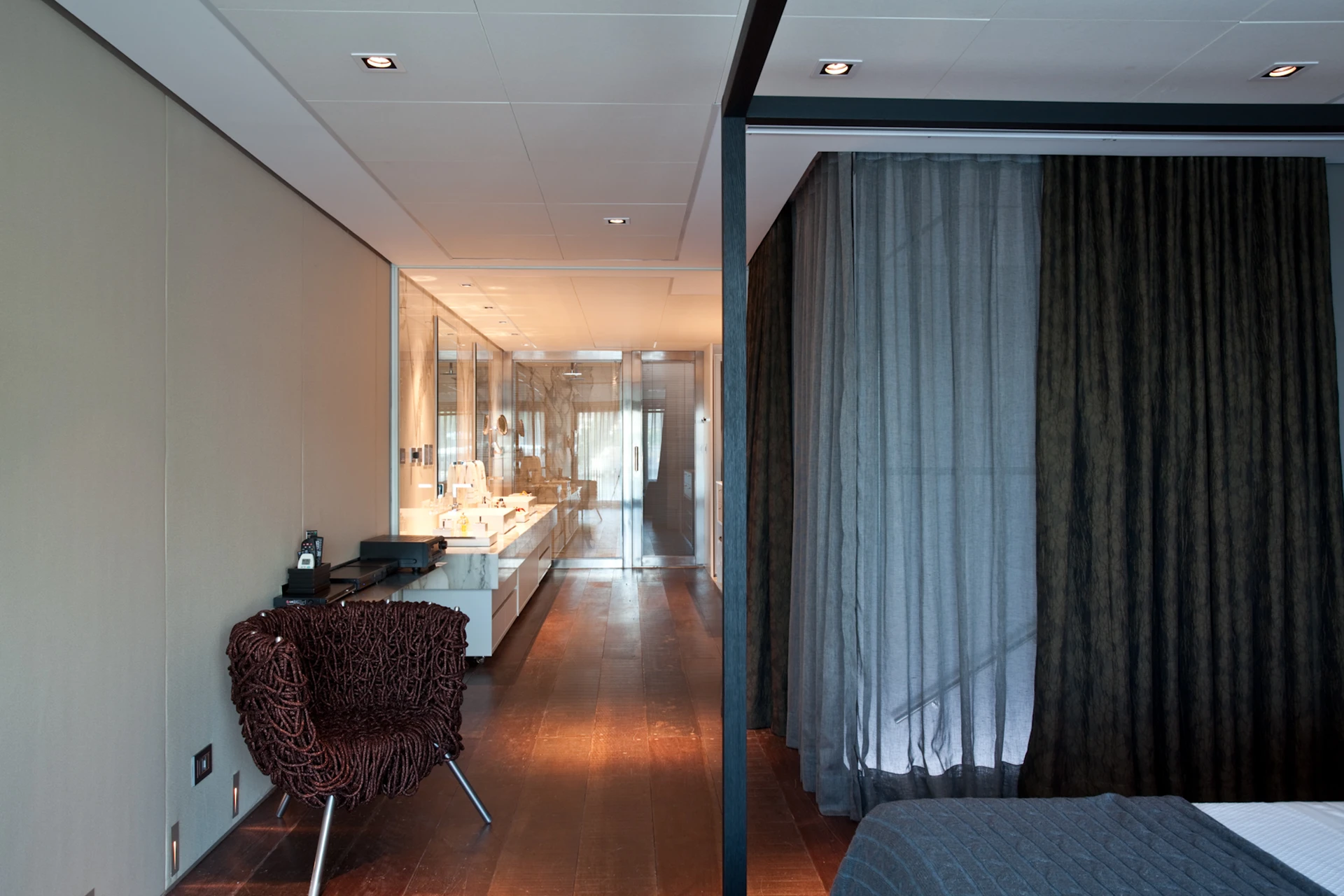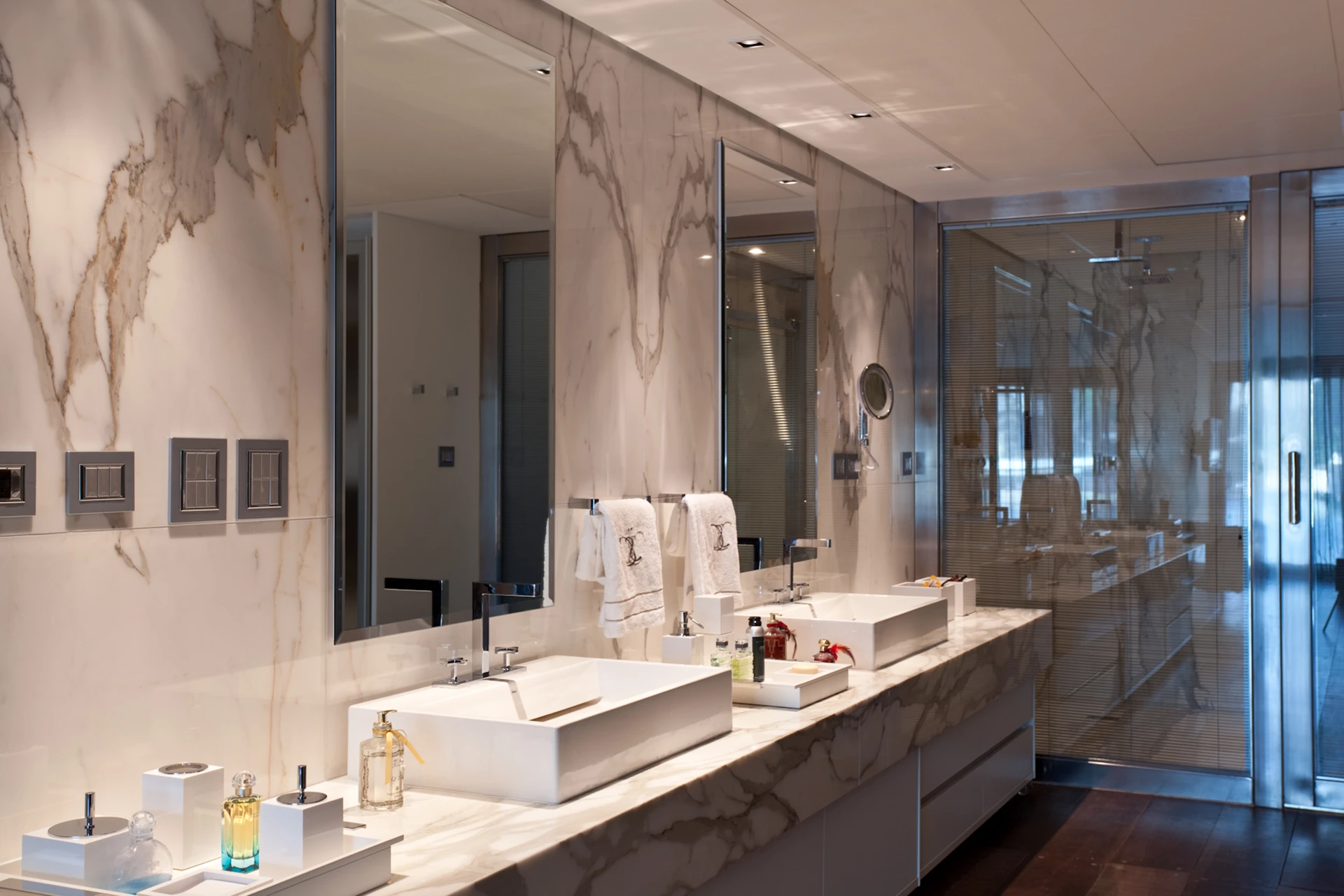 O pé-direito duplo do duplex viabilizou a criação de uma terceira suíte no pavimento superior, ampliando o programa sem comprometer a leveza dos espaços. O mármore Calacatta retorna nos banheiros, onde seus veios desenham bancadas e paredes com elegância natural. Nos dormitórios, a madeira assume o protagonismo, imprimindo acolhimento e conforto visual.