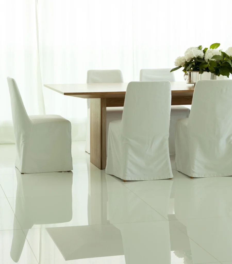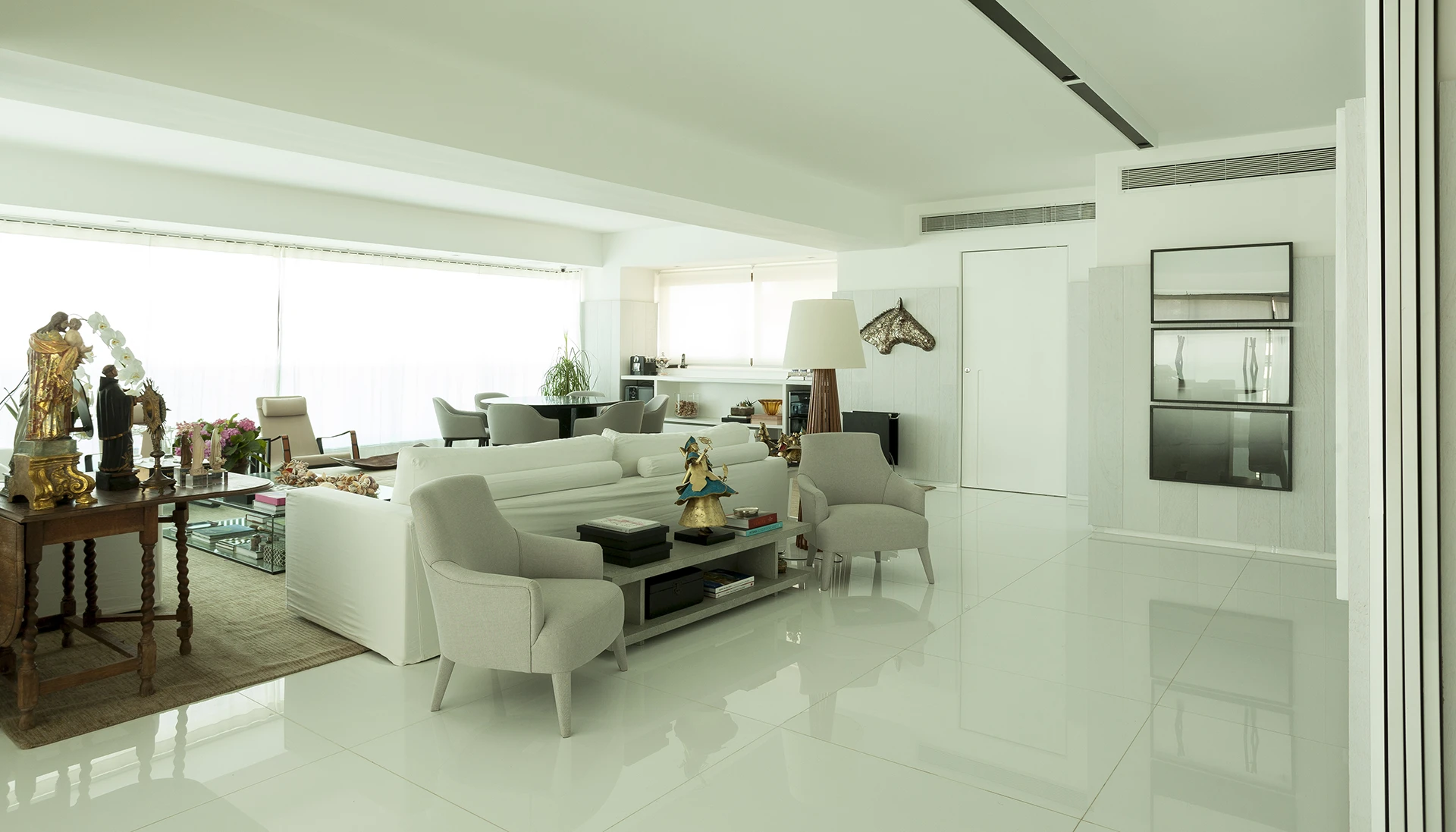 O piso existente — uma pedra industrializada composta por pó de mármore e vidro — foi preservado a pedido dos moradores. Seu brilho natural orientou as demais escolhas do projeto. Em contraponto, David Bastos envolveu a área social com lambris de madeira que se estendem quase até o teto, criando uma atmosfera mais quente e convidativa. Pintados de branco, os painéis mantêm as ranhuras aparentes entre as tábuas, detalhe sutil que acrescenta textura e suavidade ao conjunto.