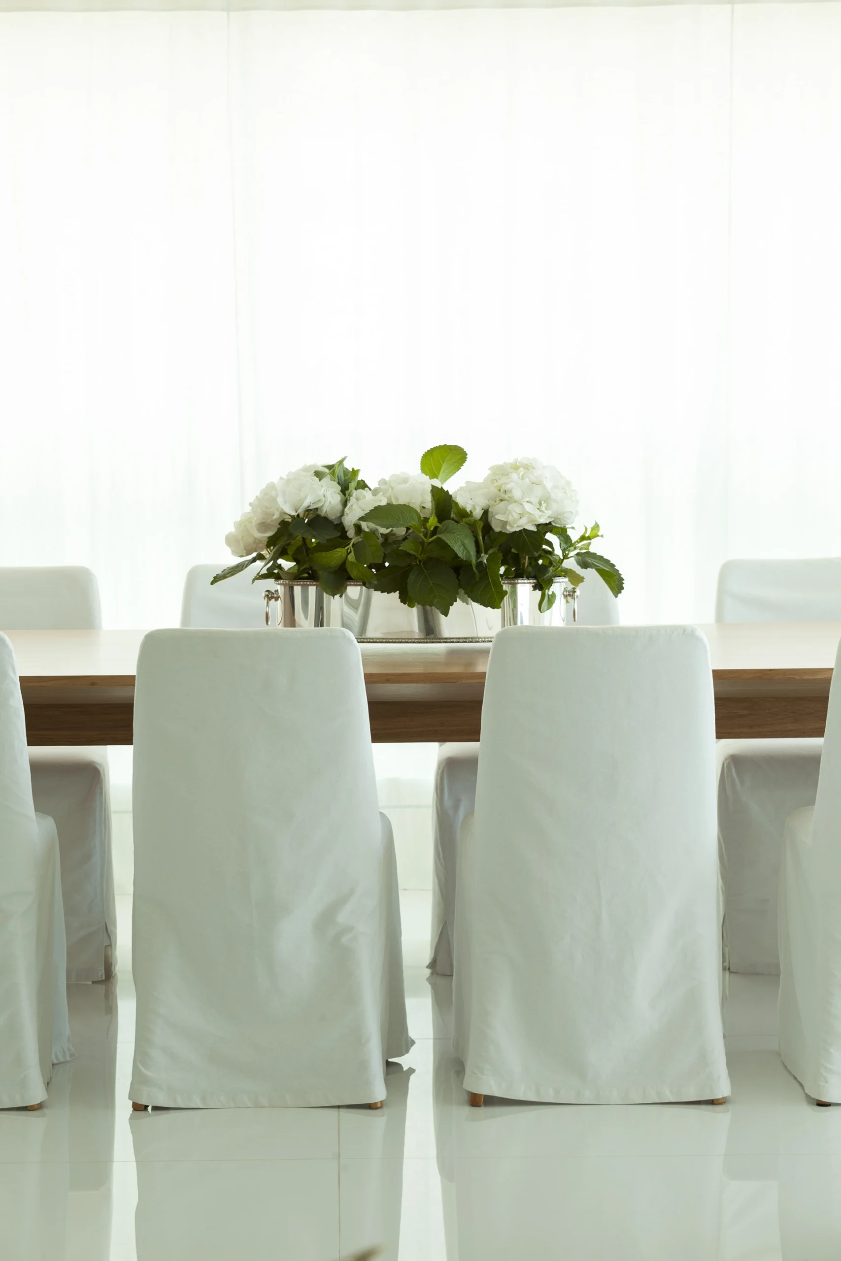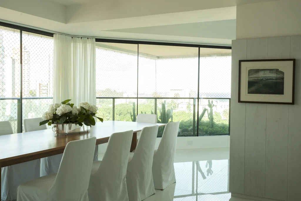 O aconchego se reforça nos elementos têxteis e no mobiliário: o tapete listrado e os grandes pufes de couro, posicionados entre sofás de linhas limpas, equilibram informalidade e elegância. Mesmo com uma dinâmica familiar enxuta, o projeto não abre mão de uma sala de jantar generosa, pensada para receber. A mesa de madeira, com capacidade para dez pessoas, se destaca sob a luz abundante que atravessa a fachada envidraçada do edifício.
